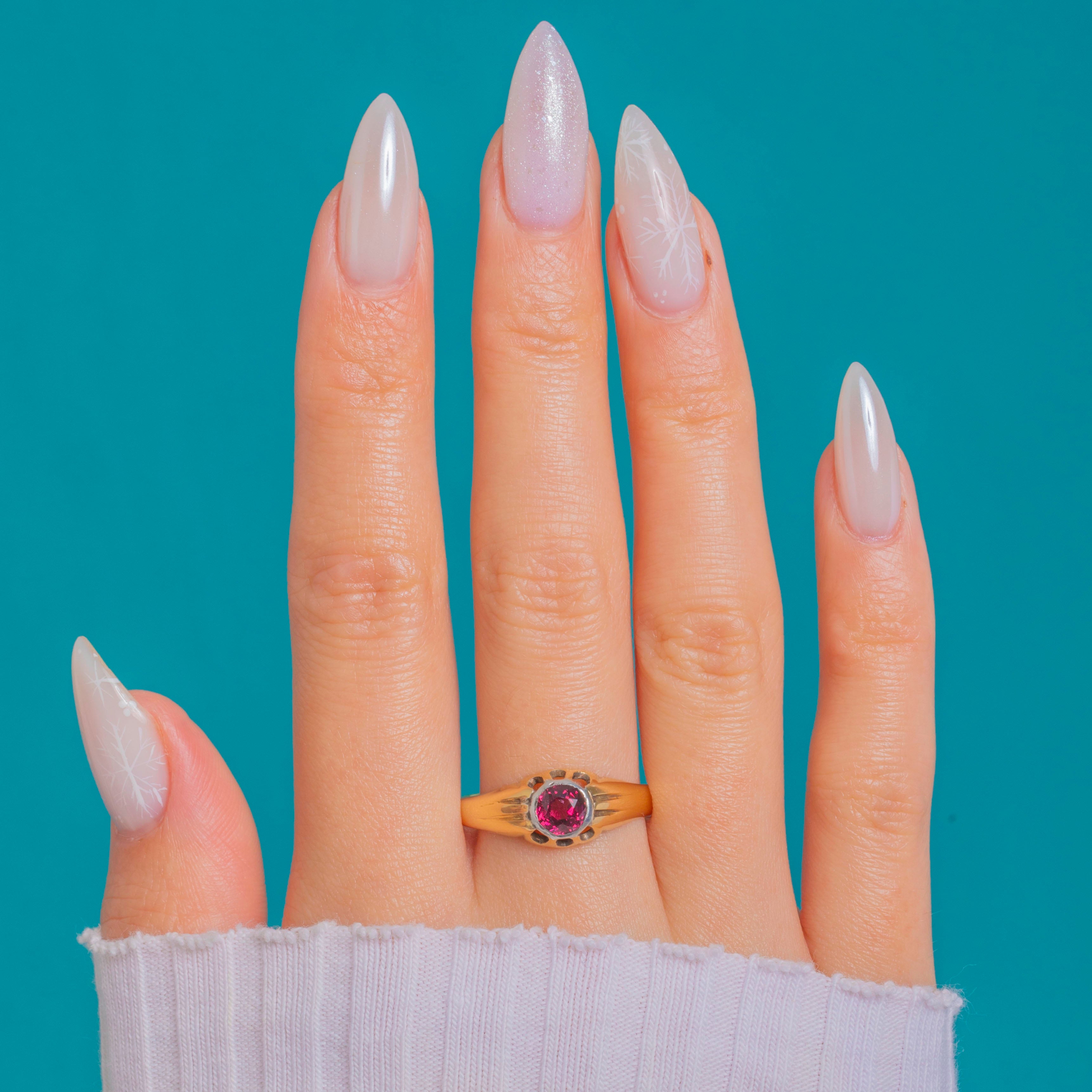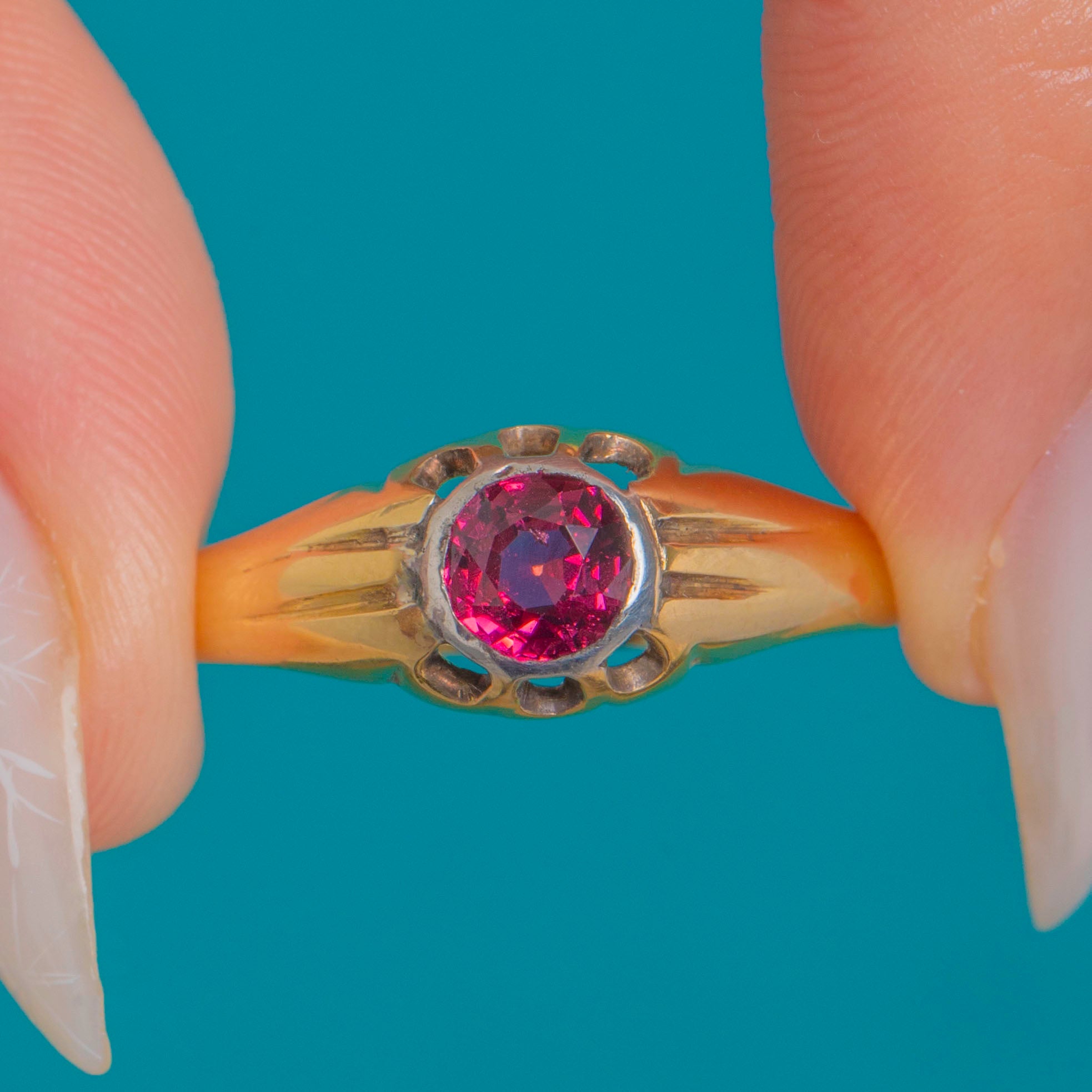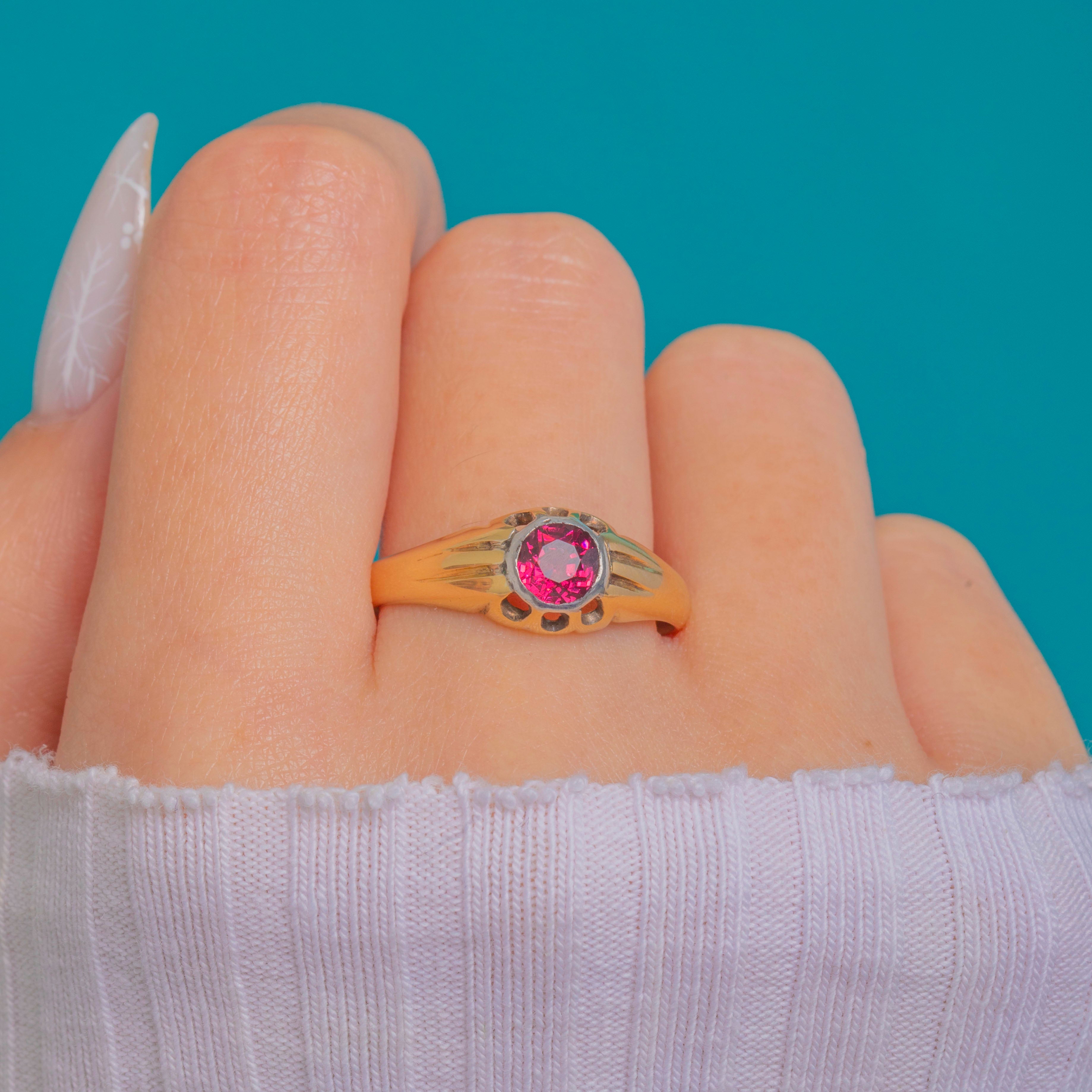 A beautifully streamlined Victorian buttercup ring, crafted in rich 18ct Gold with a Platinum-topped bezel that spotlights a vivid Pink Garnet. The round, faceted stone shimmers from bright fuchsia to deep reddish‑purple, held securely in a smooth rub‑over setting for a sleek, low profile. Fluted shoulders flow into the softly domed head, while the scalloped buttercup rim adds a refined, sculptural touch.