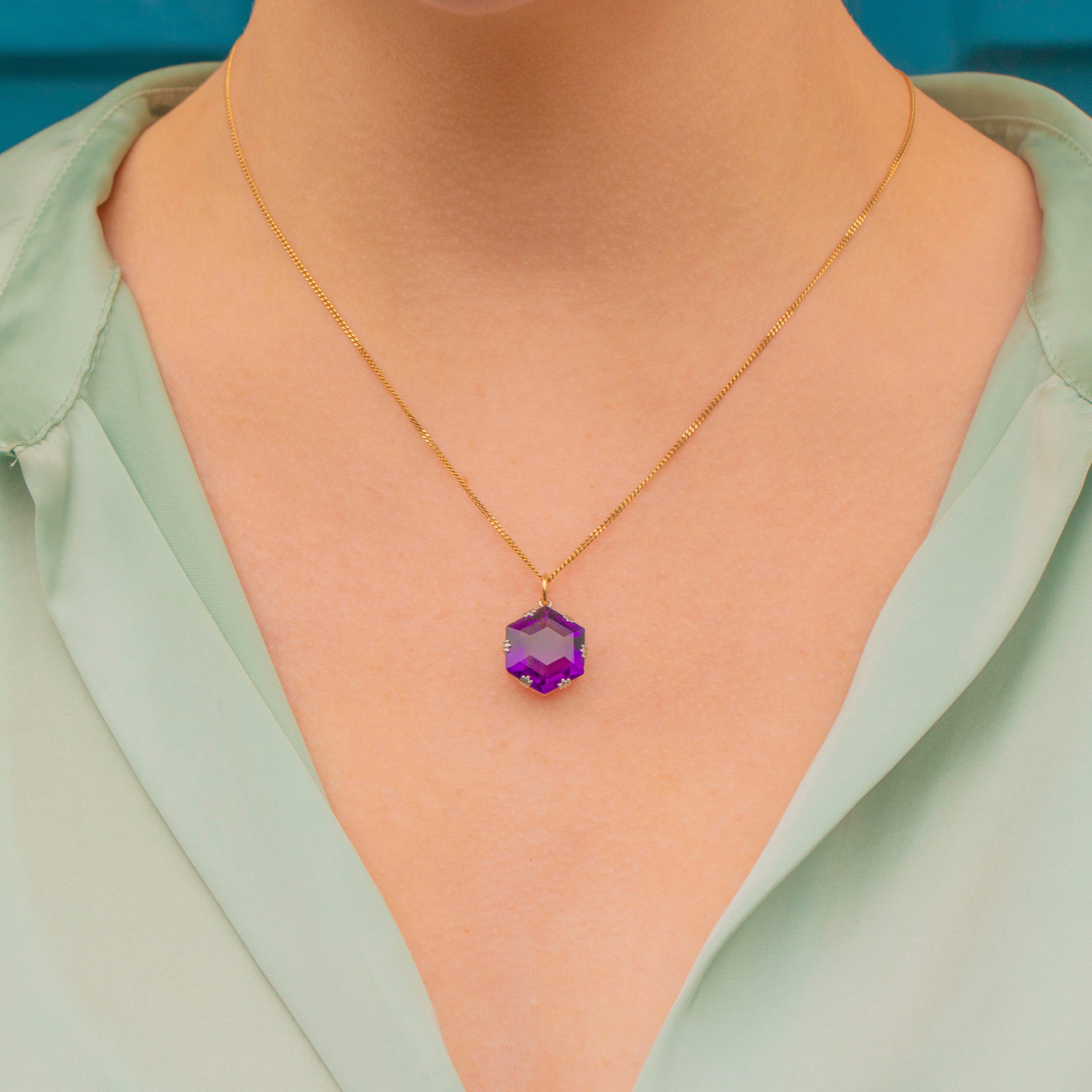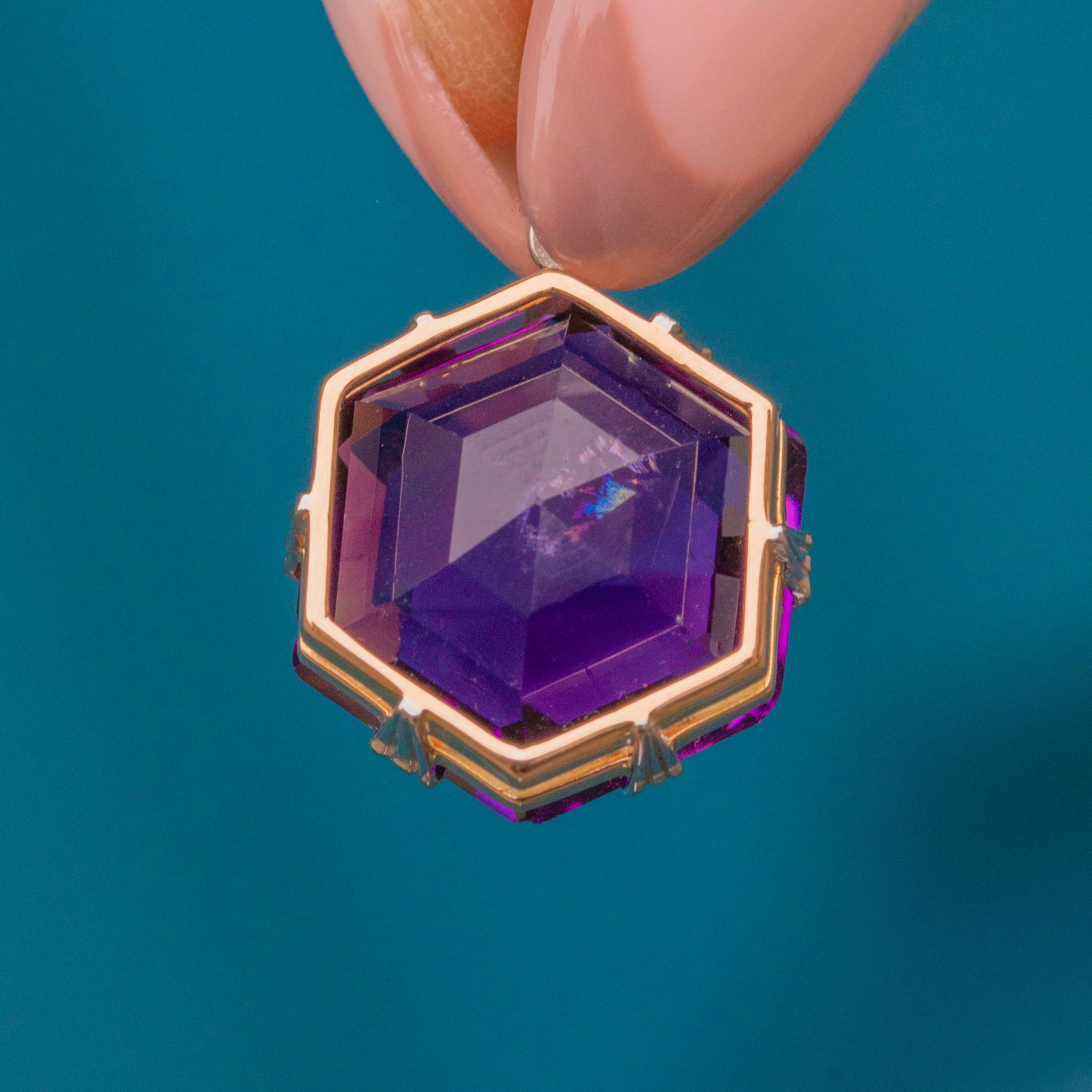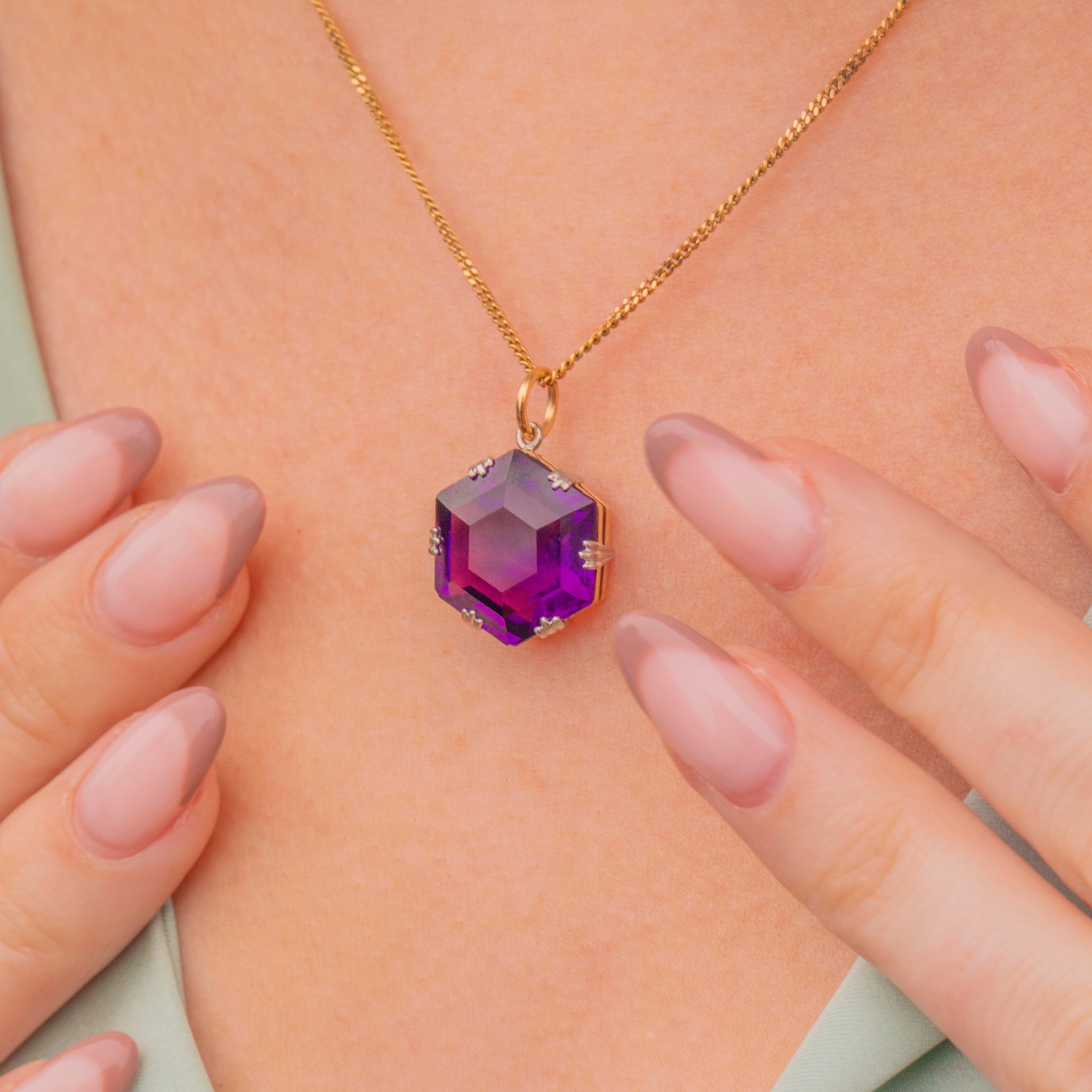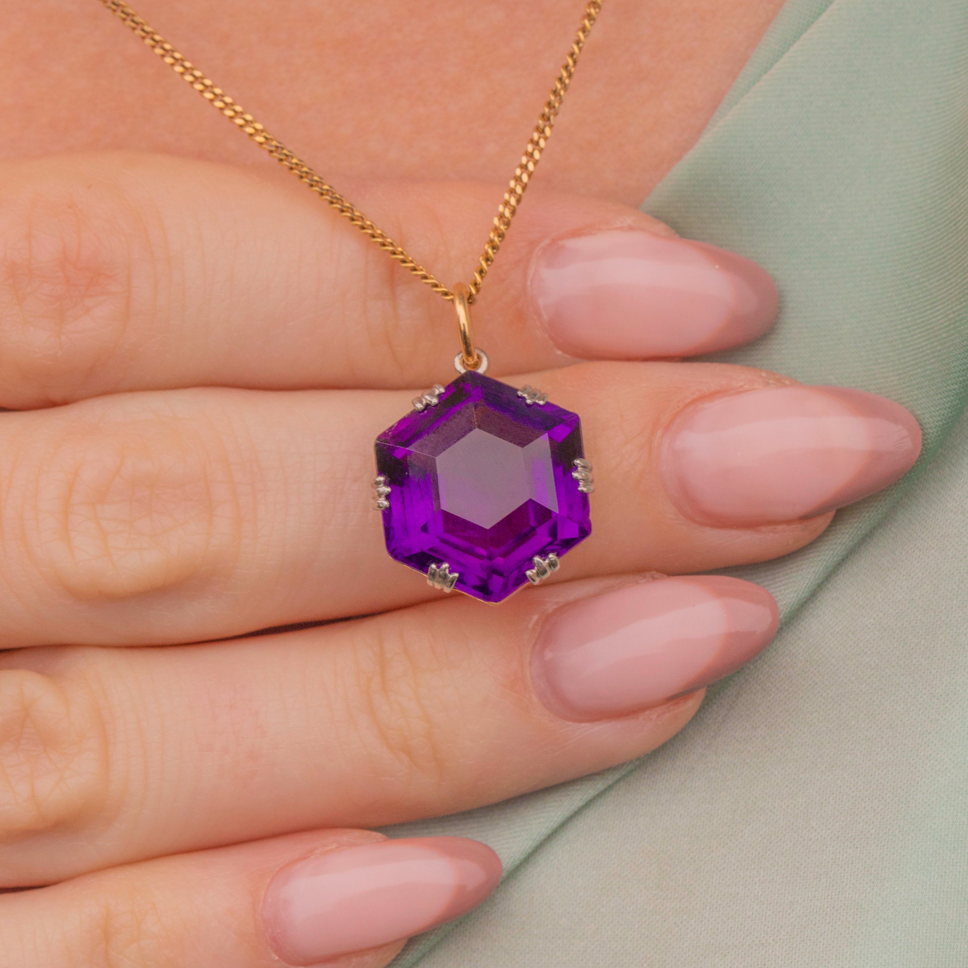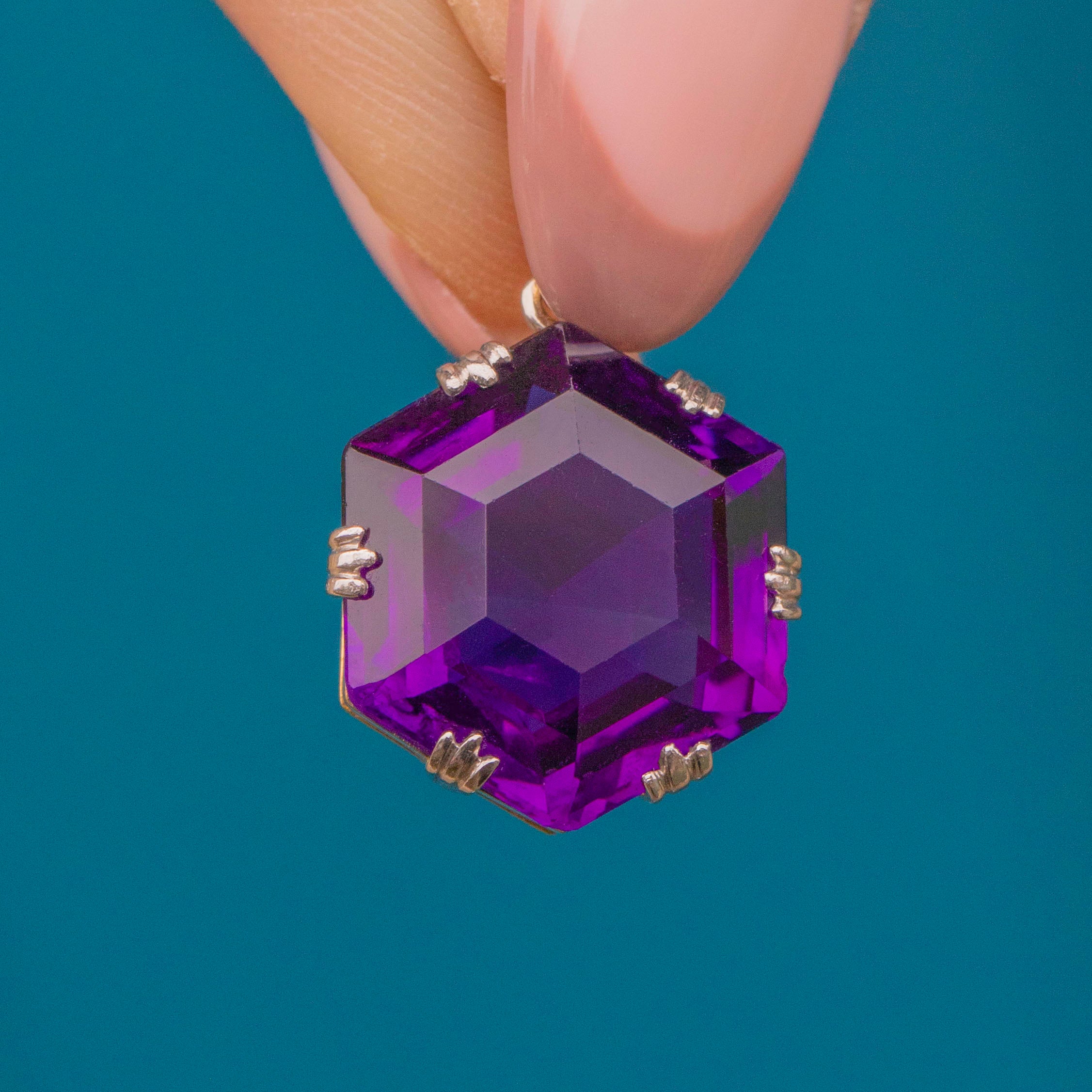This antique 18ct Gold & Platinum Siberian Amethyst pendant is a testament to beauty that transcends time. With a mesmerising 6.00ct Amethyst at her heart with bold geometric facets, this Art Deco pendant comes to life under the light.