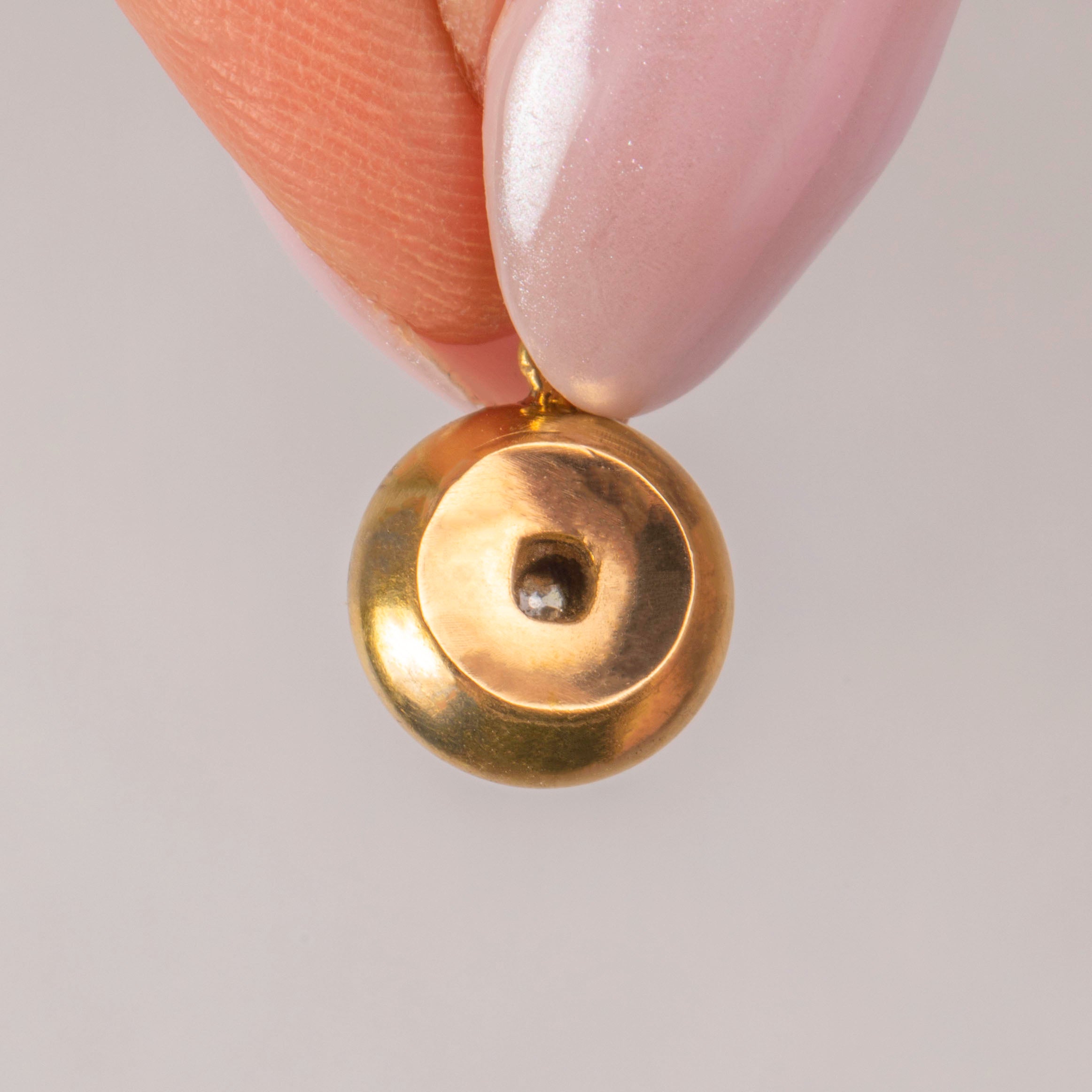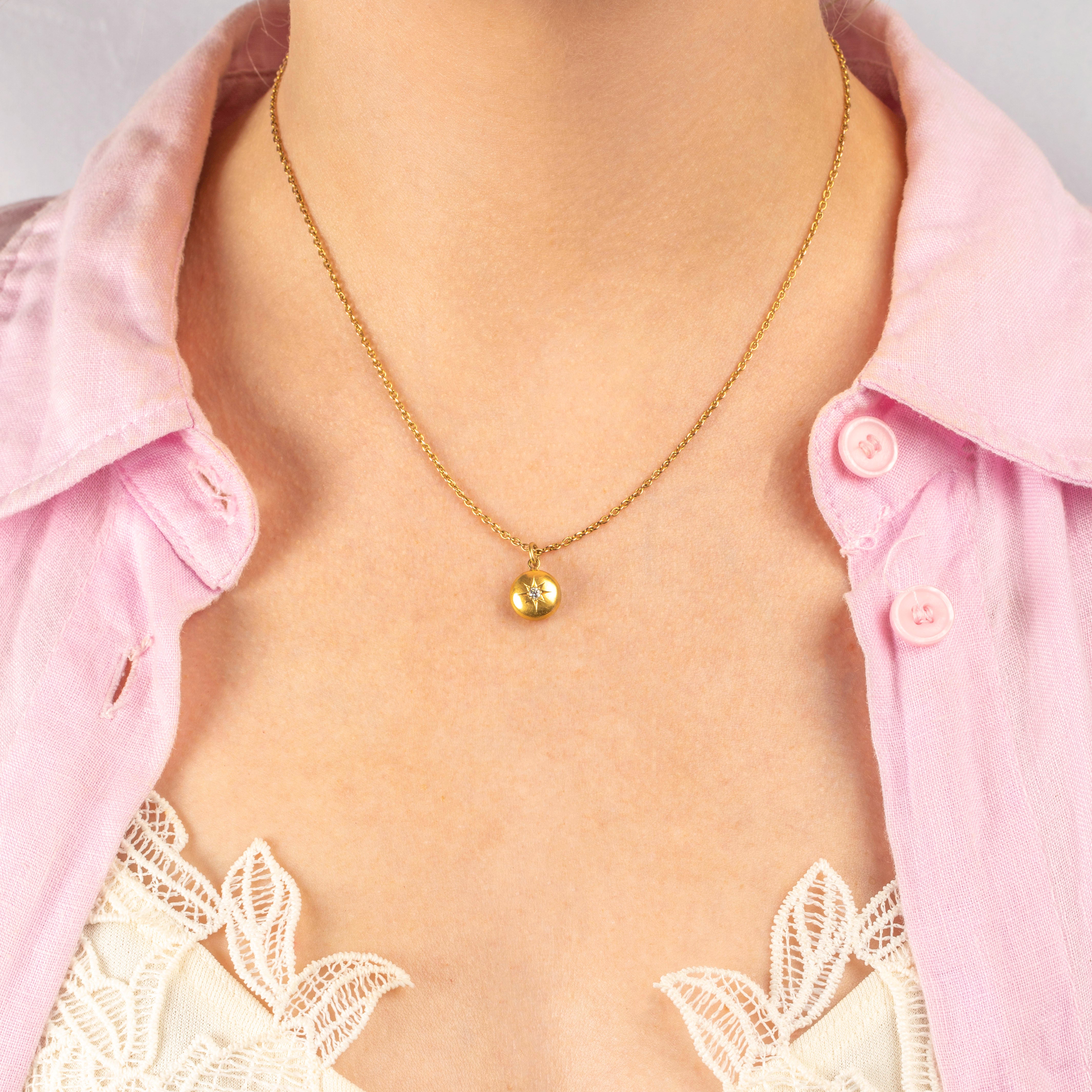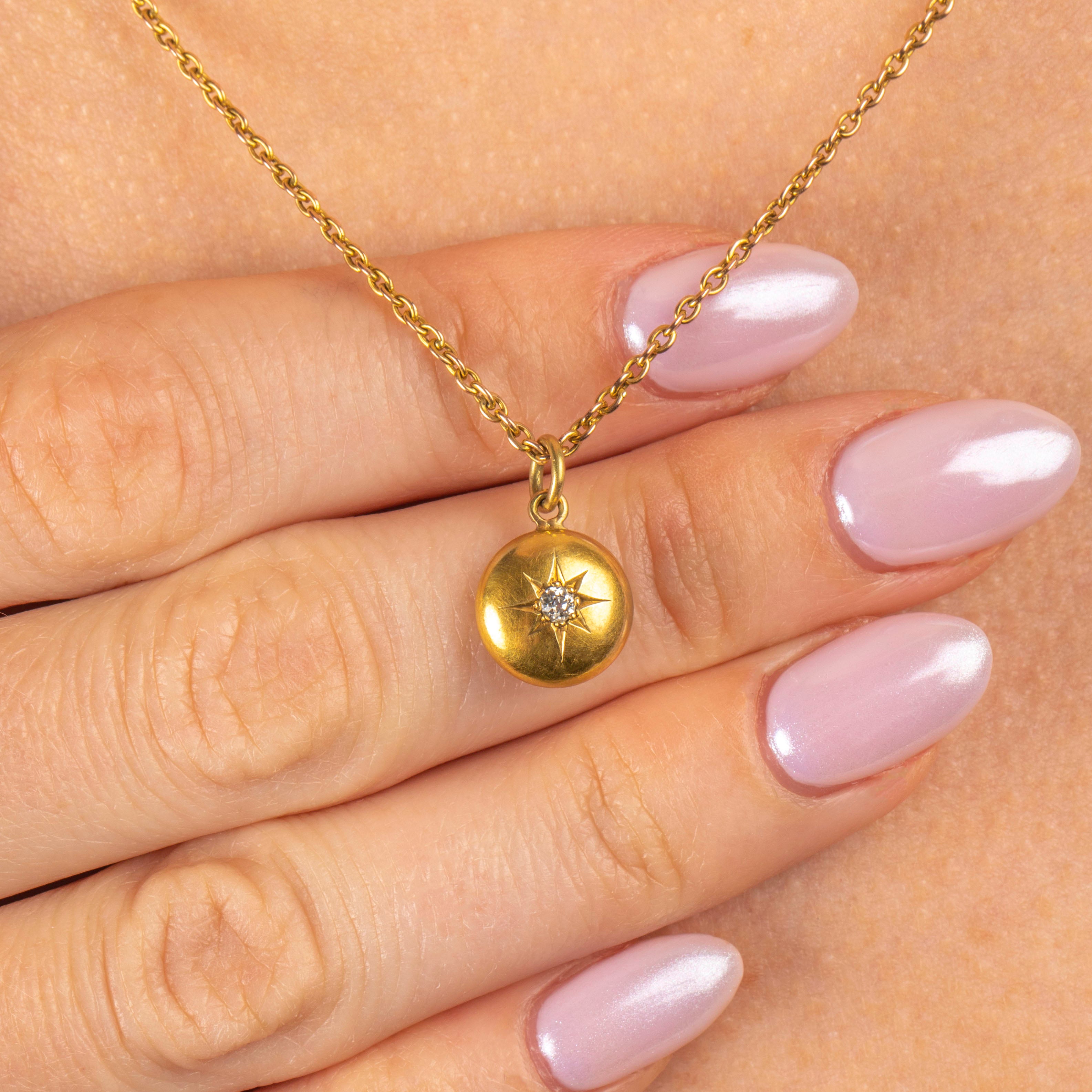 VERY GOOD-EXCELLENT. This antique 18ct Gold puffy Diamond set charm is in wonderful condition. The Diamond sits securely within it's setting, with no damage to note. The Gold has a buttery saturation throughout and has maintained a lovely domed form. There are a couple of light dings on the back of the pendant but nothing that is of concern. With a soldered jump-ring, you can wear with the utmost confidence!