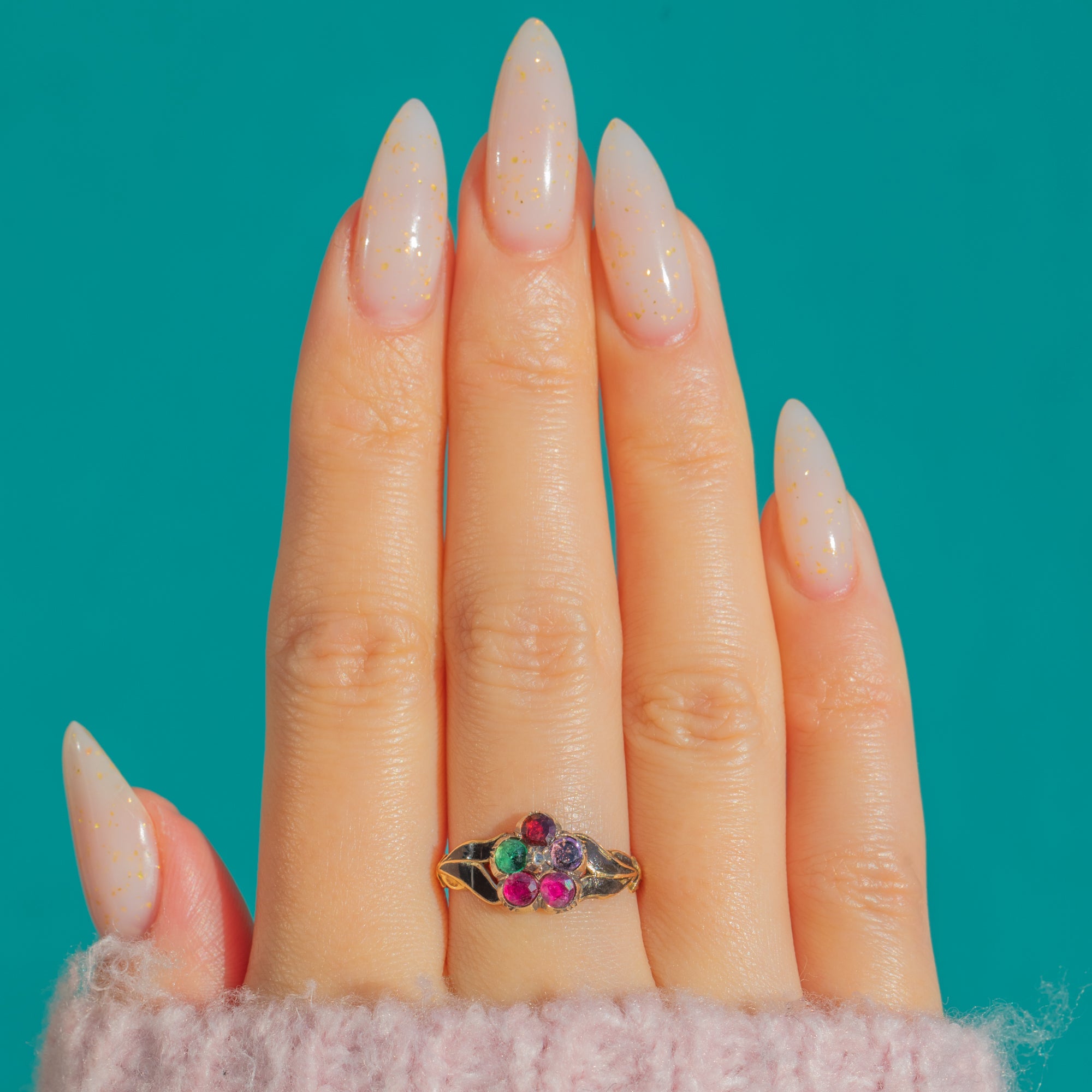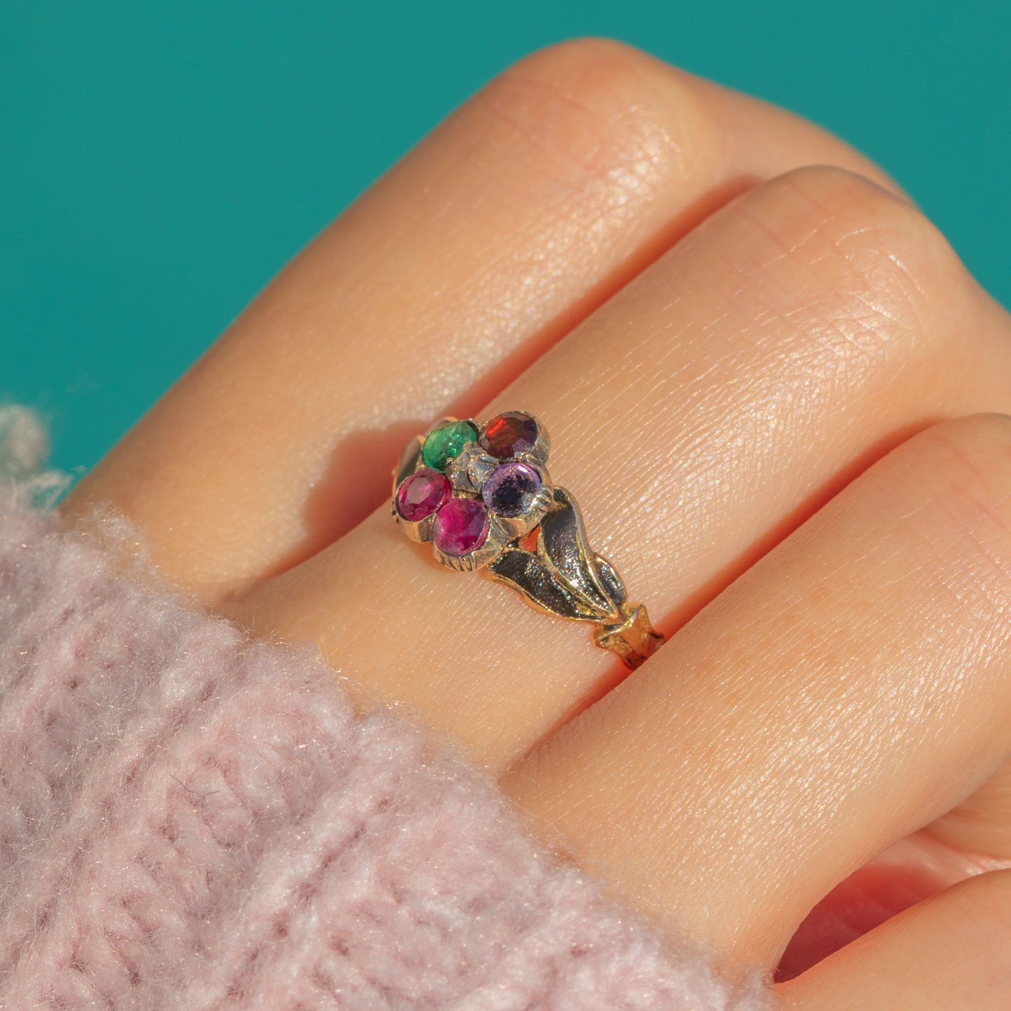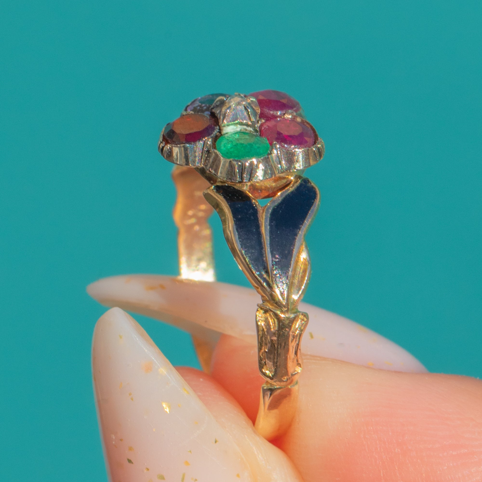 Steeped in sentiment and styled with finesse, this antique “REGARD” mourning ring brings together vibrant natural gemstones in a delicate and floral cluster and black Enamel. The acrostic arrangement—Ruby, Emerald, Garnet, Amethyst, Ruby and Diamond—spells out REGARD, a cherished 19th-century declaration of devotion. Crafted in rich 18ct Gold with 9ct Gold settings, the rosette head is framed by a pretty scalloped, pie-crust cartouche for a charming, hand-wrought feel.
