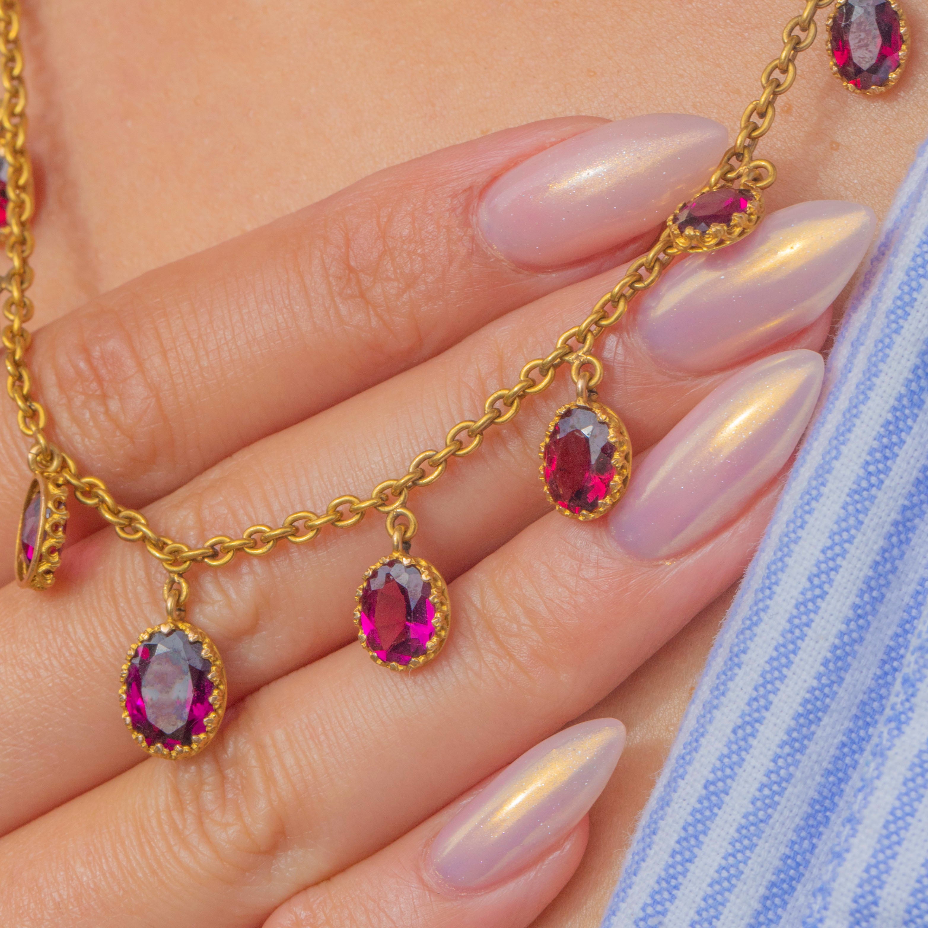 This exquisite Victorian fringe necklace is crafted in rich 18ct Gold and set with glowing Rhodolite Garnets and a gorgeous engraved original antique clasp!