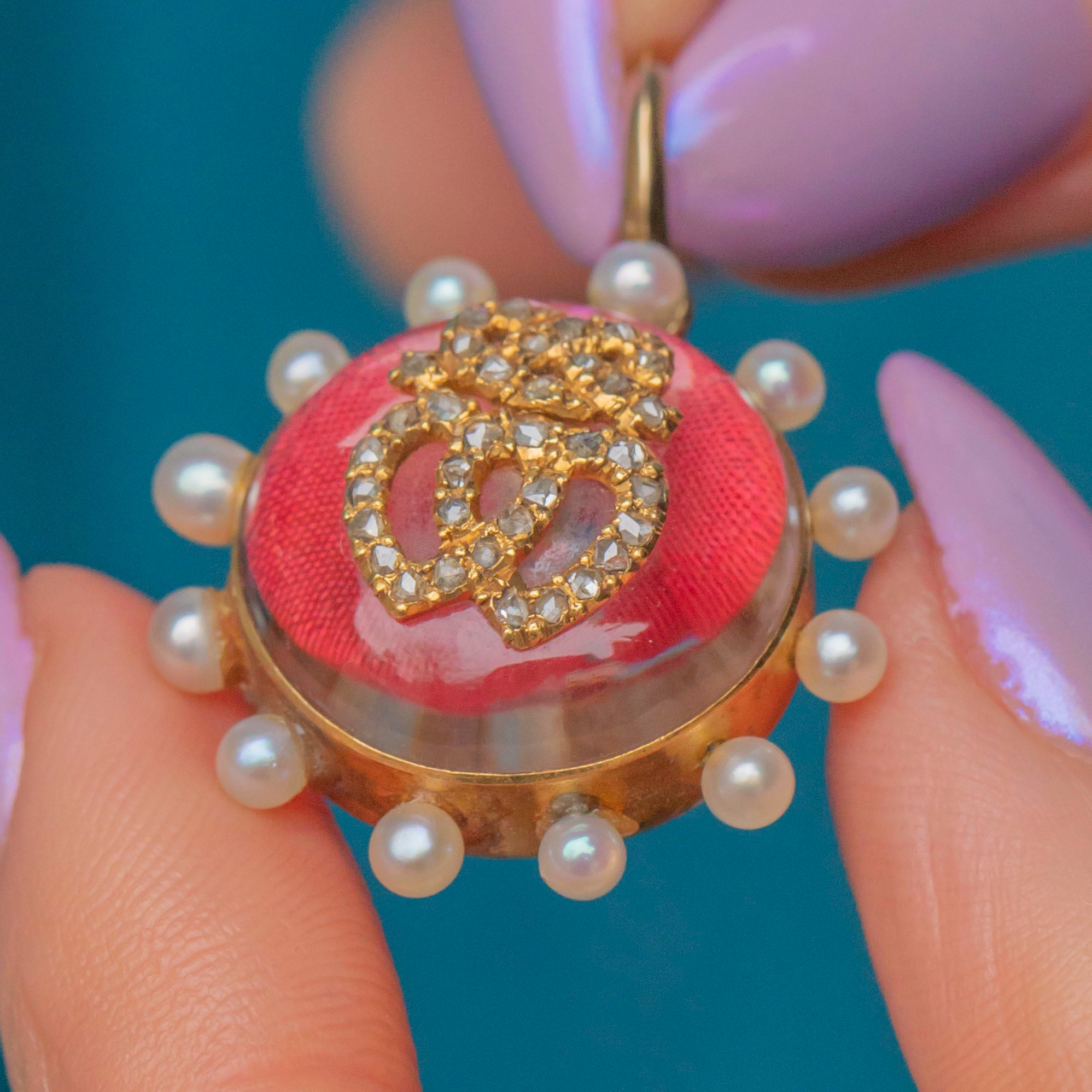 VERY GOOD. This antique 18ct Gold Rock Crystal Diamond heart pendant is in very good condition. Her Diamonds and Pearls are lustrous and free from any evident signs of wear. Her ribbon backing is slightly worn in the centre, however this is only visible under close inspection. With only some minor signs of age to the Gold settings, commensurate with age, she is in great condition.