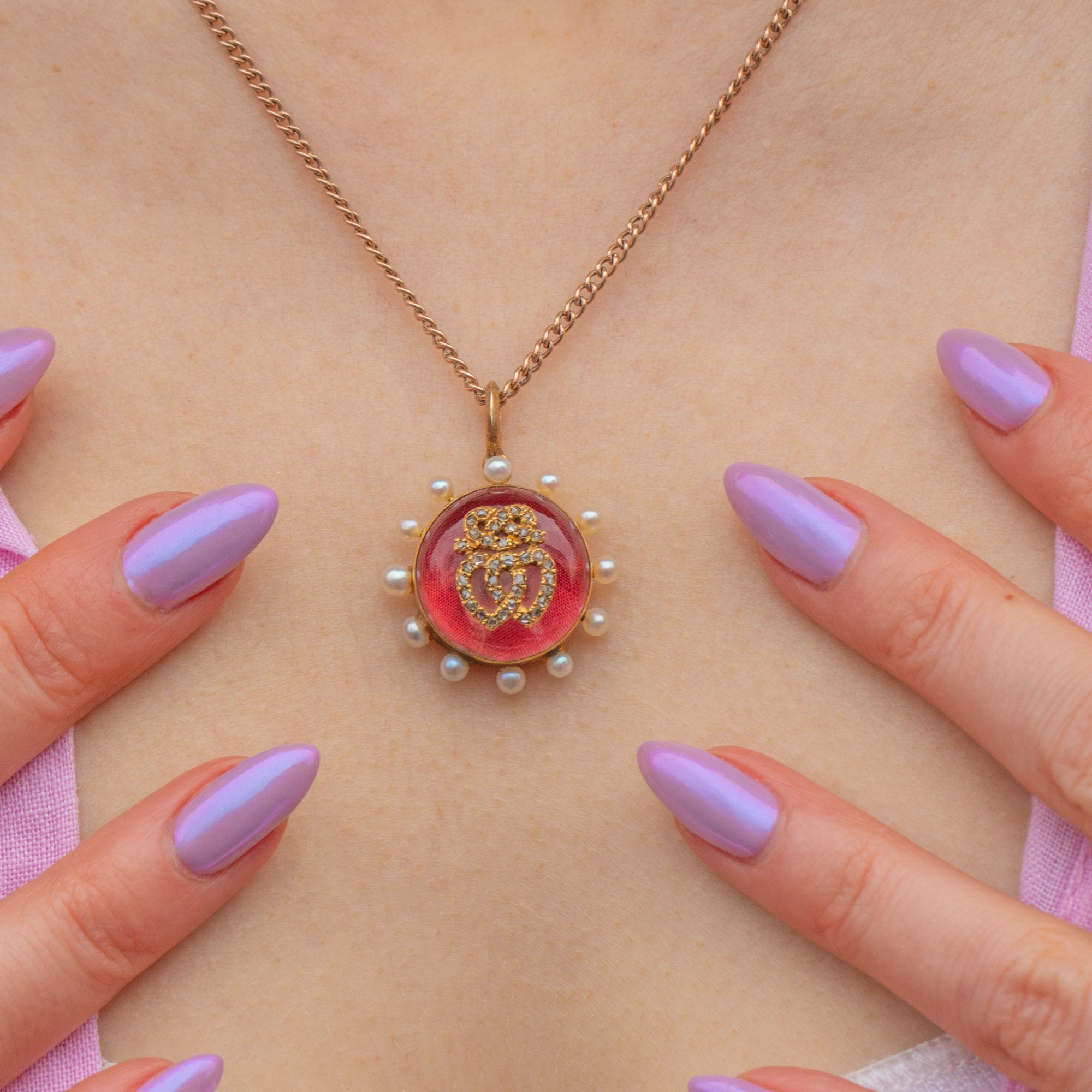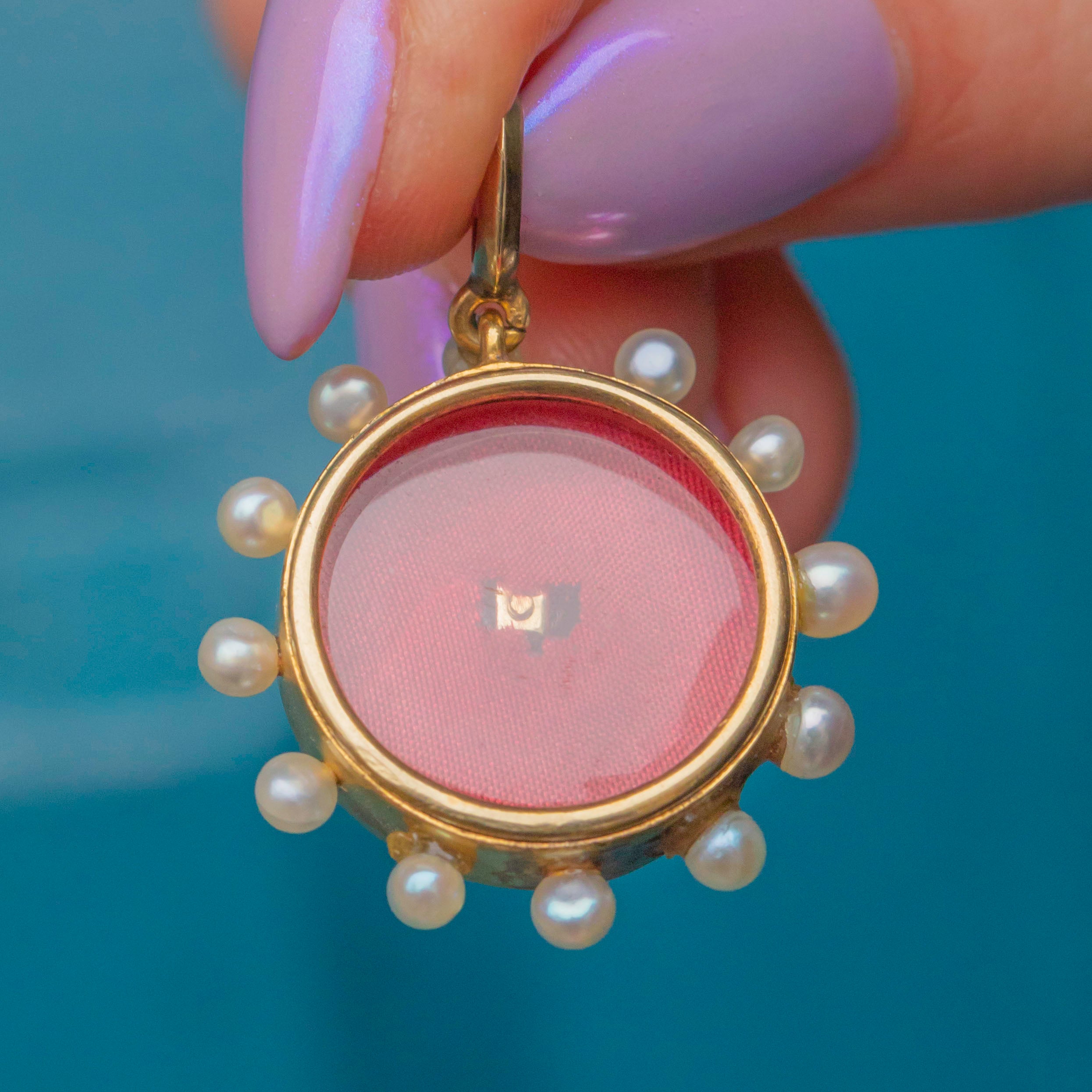 This Victorian pendant is adorned by a halo of iridescent Pearls and, complete with a sturdy bale, would look fabulous suspended from a Gold chain.