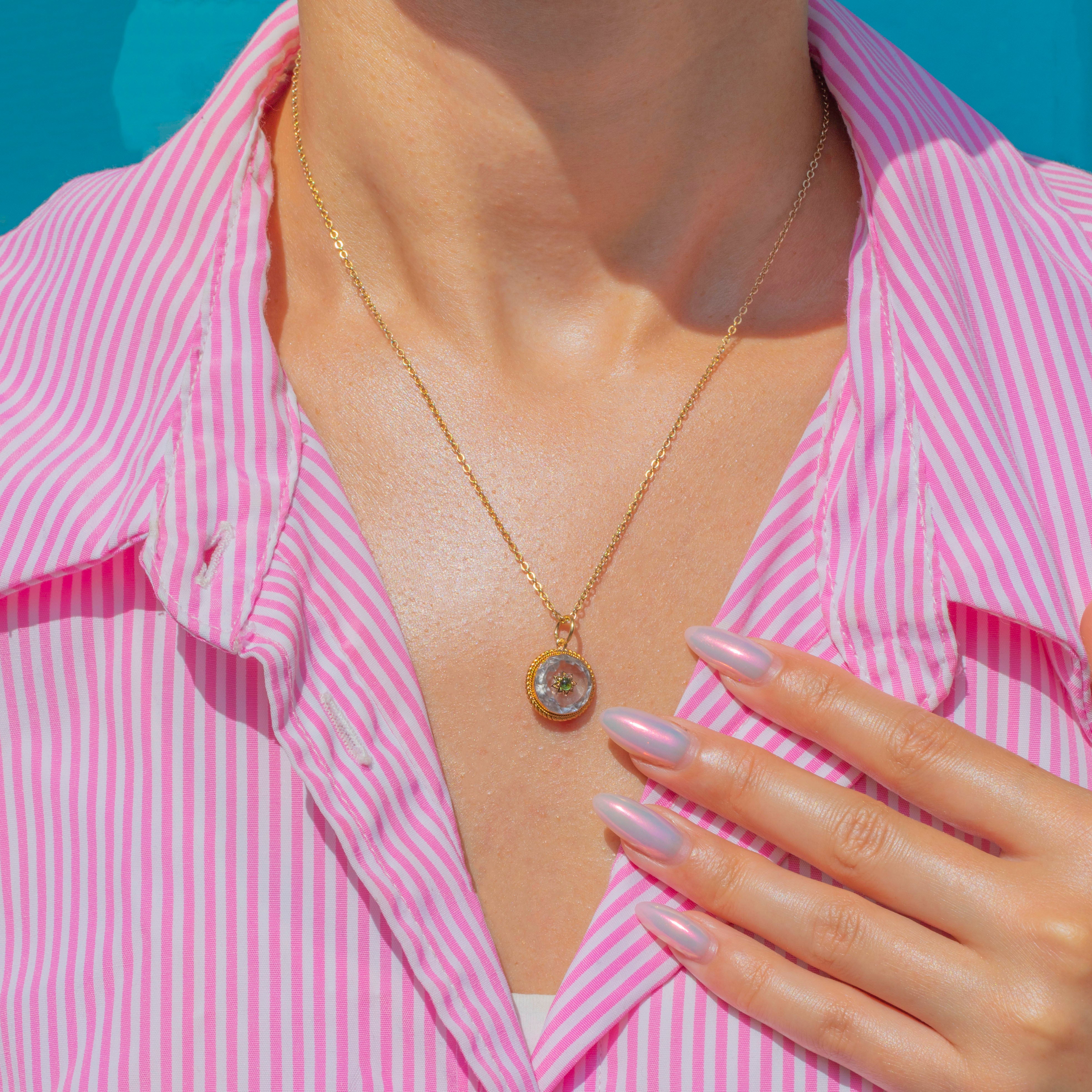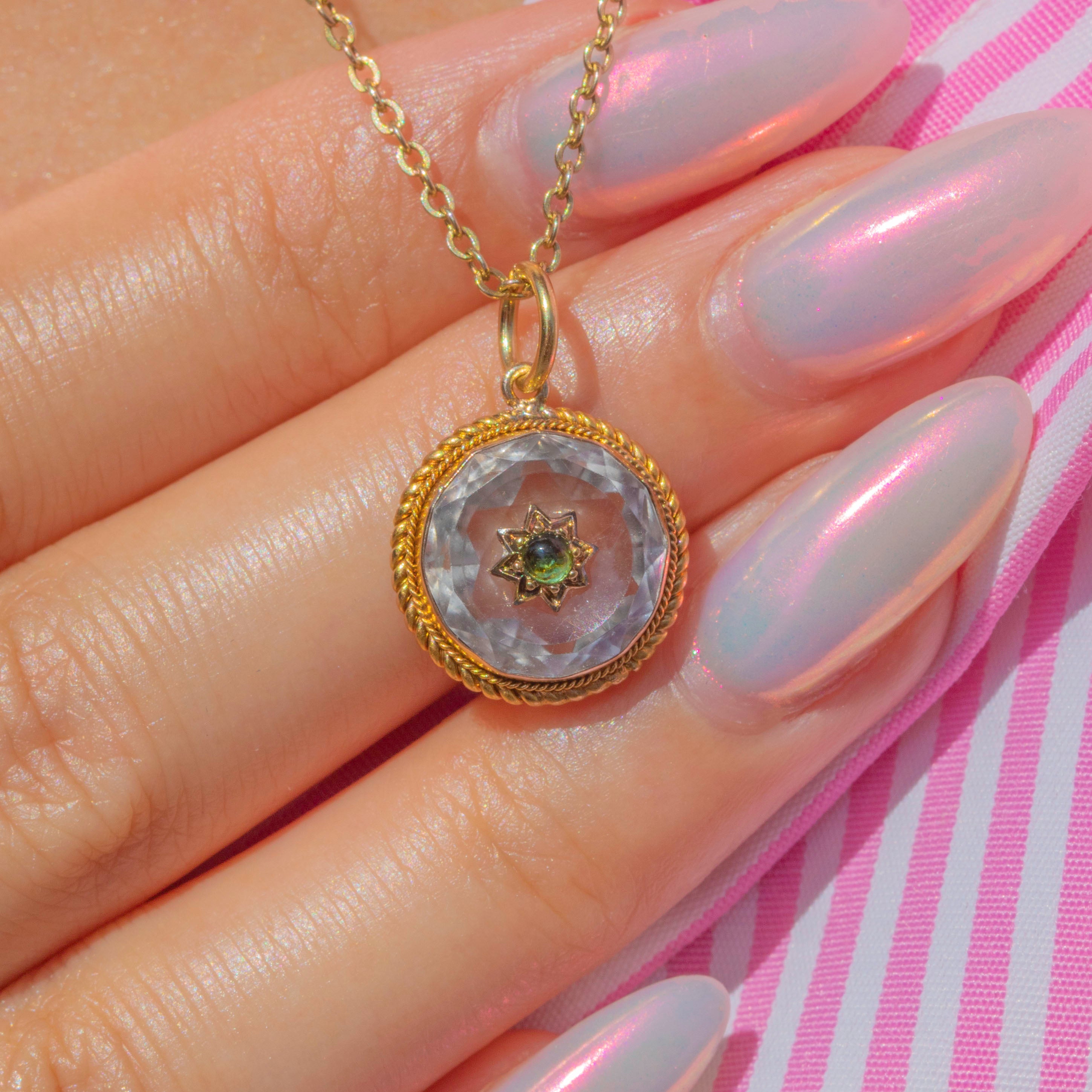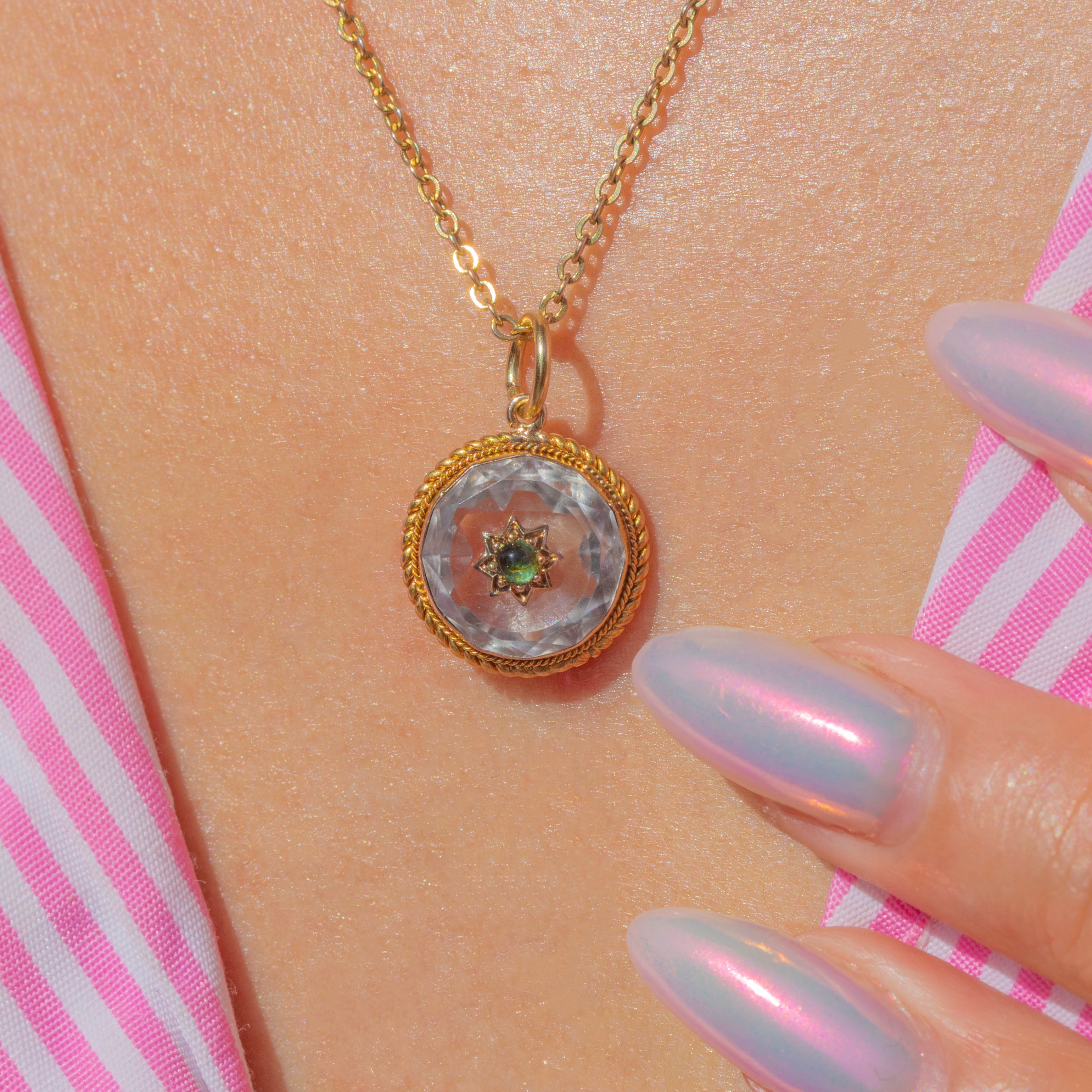 This antique Rock Crystal charm perfectly captures the unique jewellery designs to come from the Victorian era. The crisply faceted Rock Crystal has been skillfully set with a dainty Peridot cabochon within an intricate star motif, adding bundles of celestial charm!