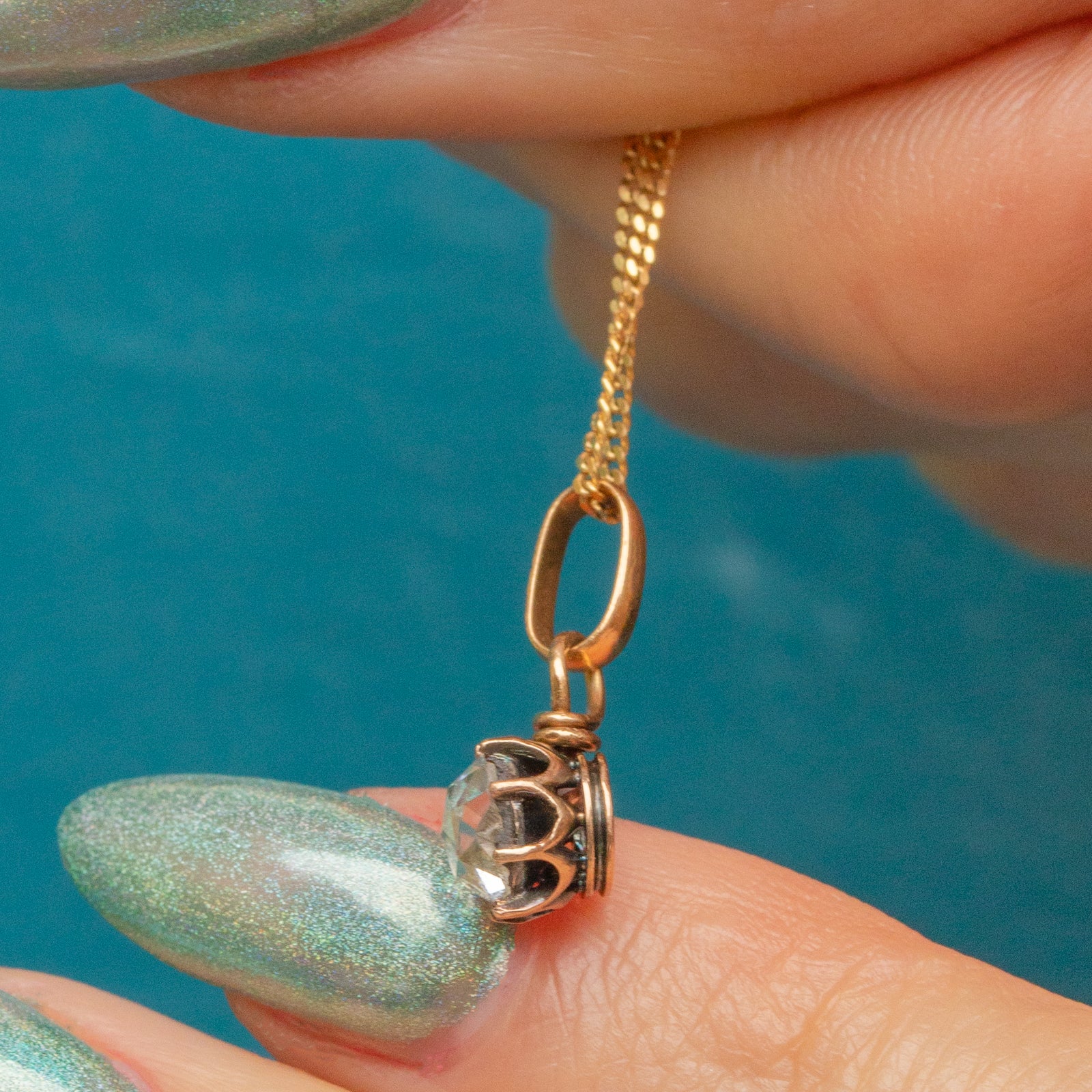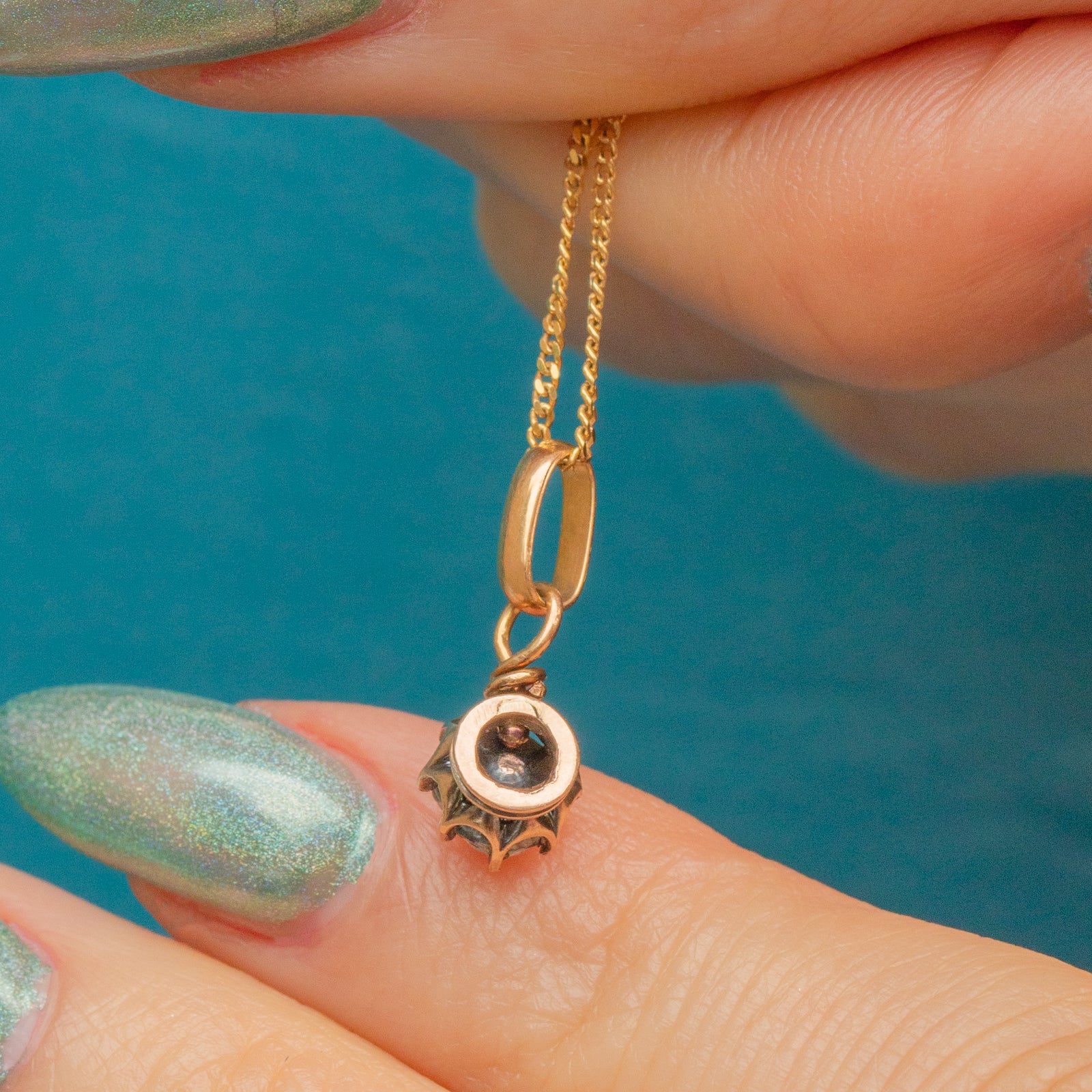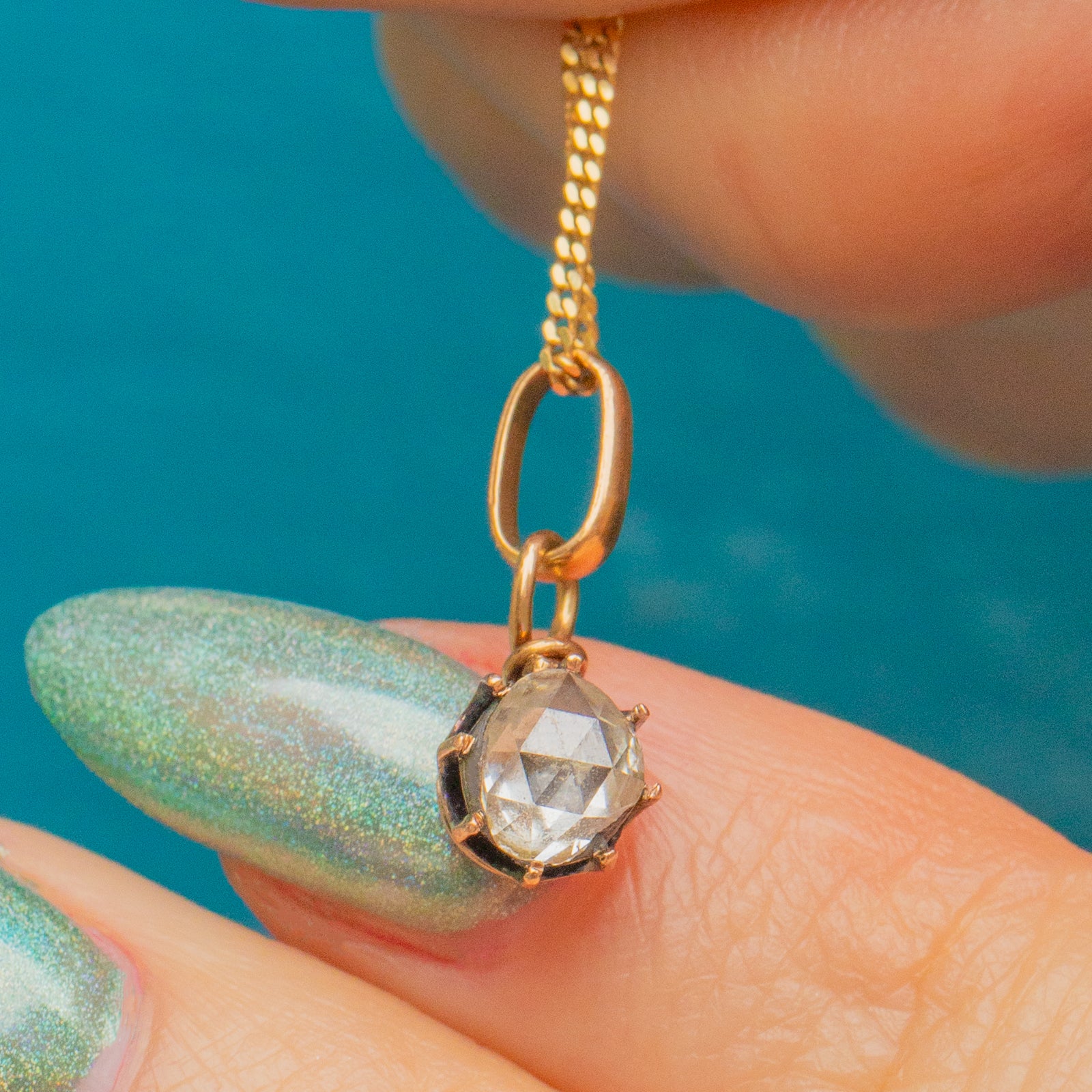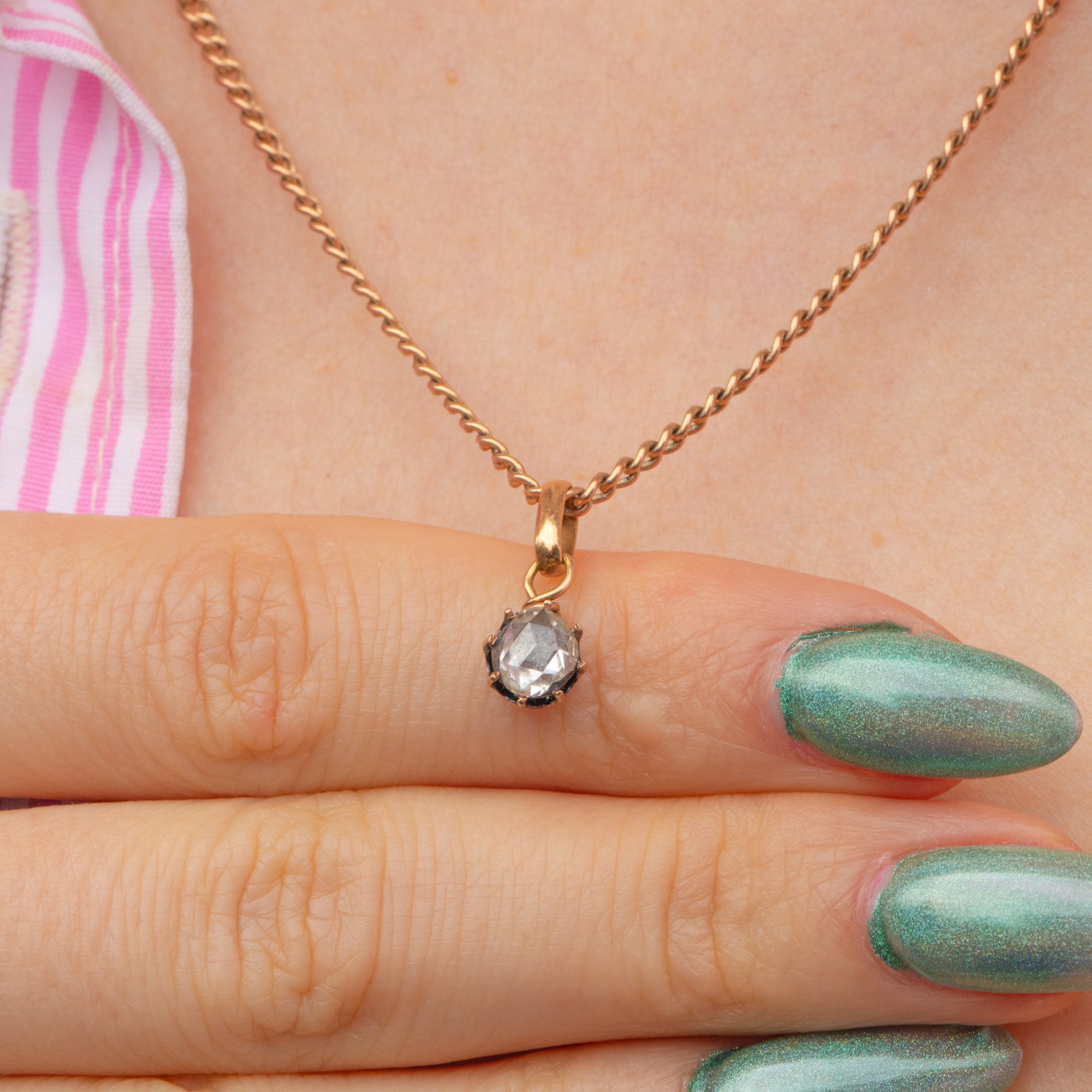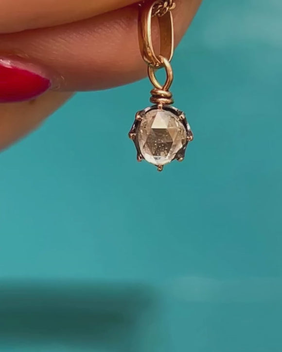 EXCELLENT. This is a stunning antique 18ct Gold rose-cut Diamond charm. The Diamond is beautiful, has stunning facets and is securely set in the Gold claws. The Gold is a luscious 18ct Gold, and you can attach the bale to any chain of your choosing with ease. There is a small mark on the back of the setting, but the piece is very much structurally intact.