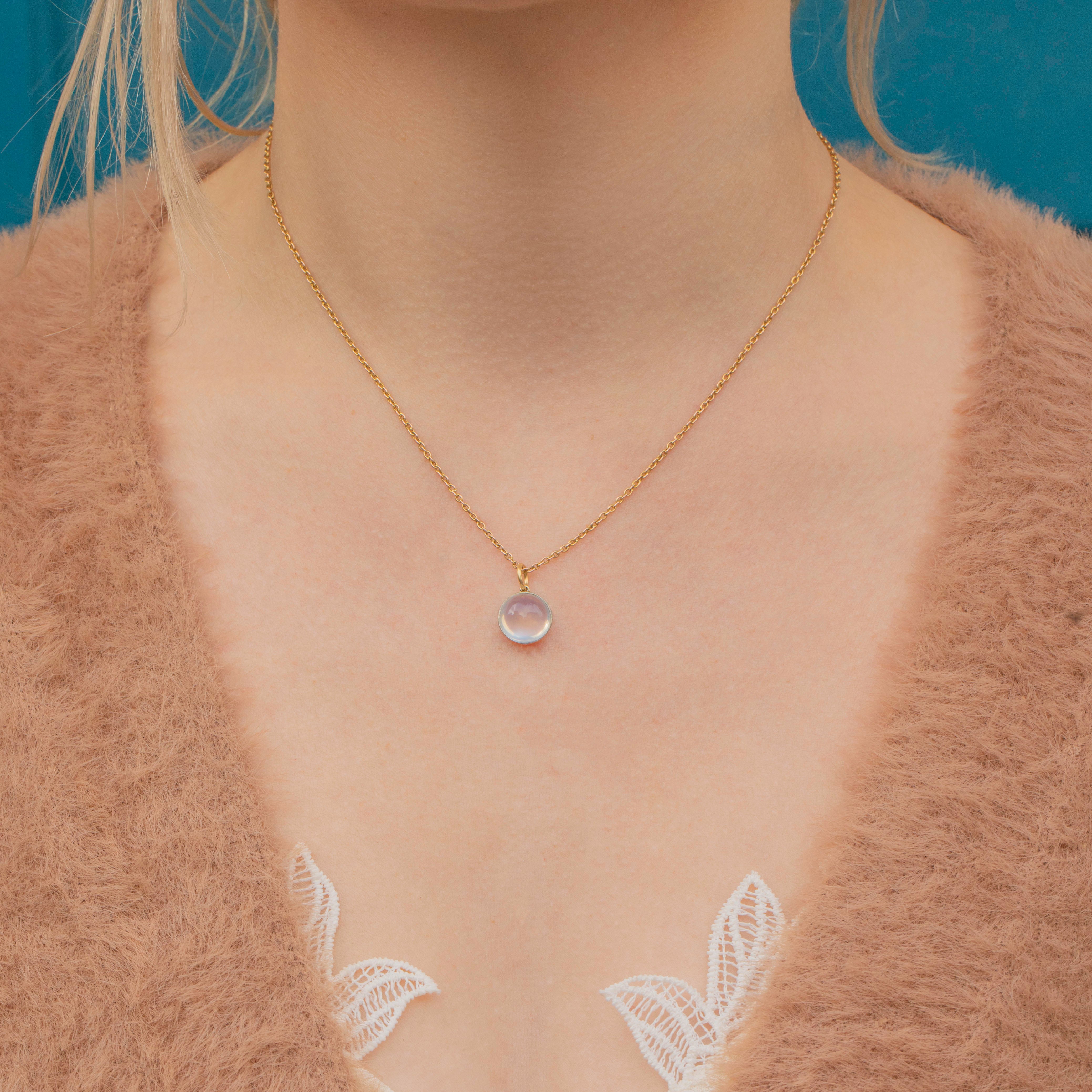 EXCELLENT. This antique 18ct Gold round Moonstone charm is in excellent condition. Her glowing Moonstone is magnificently toned with no scuffs or chips to note and is securely held within her smooth 18ct White Gold bezel setting. The White Gold is lustrous and robust with no scratches visible. Just affix her to a antique Gold chain or dog-clip and wear her straight from your pink Lillicoco box!
