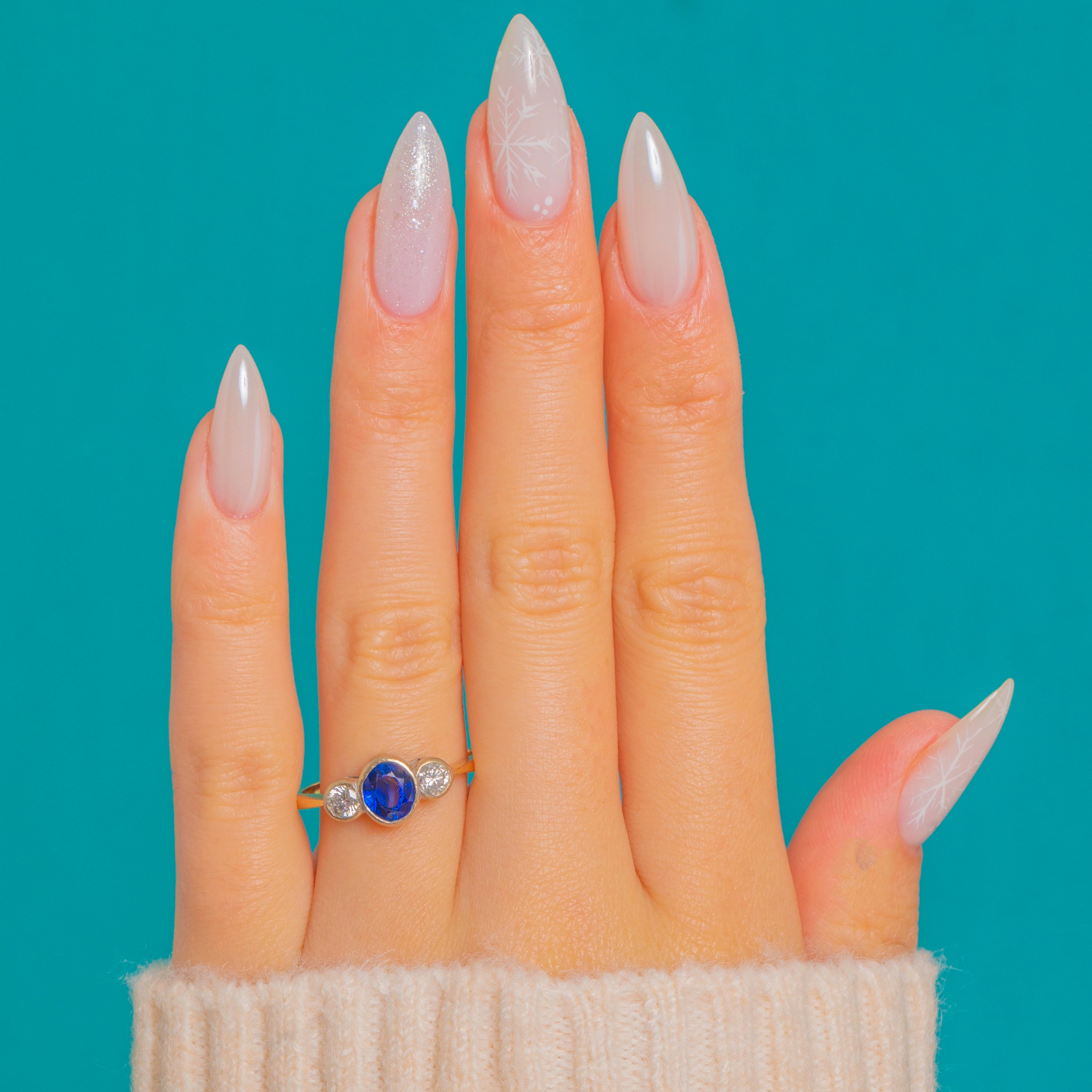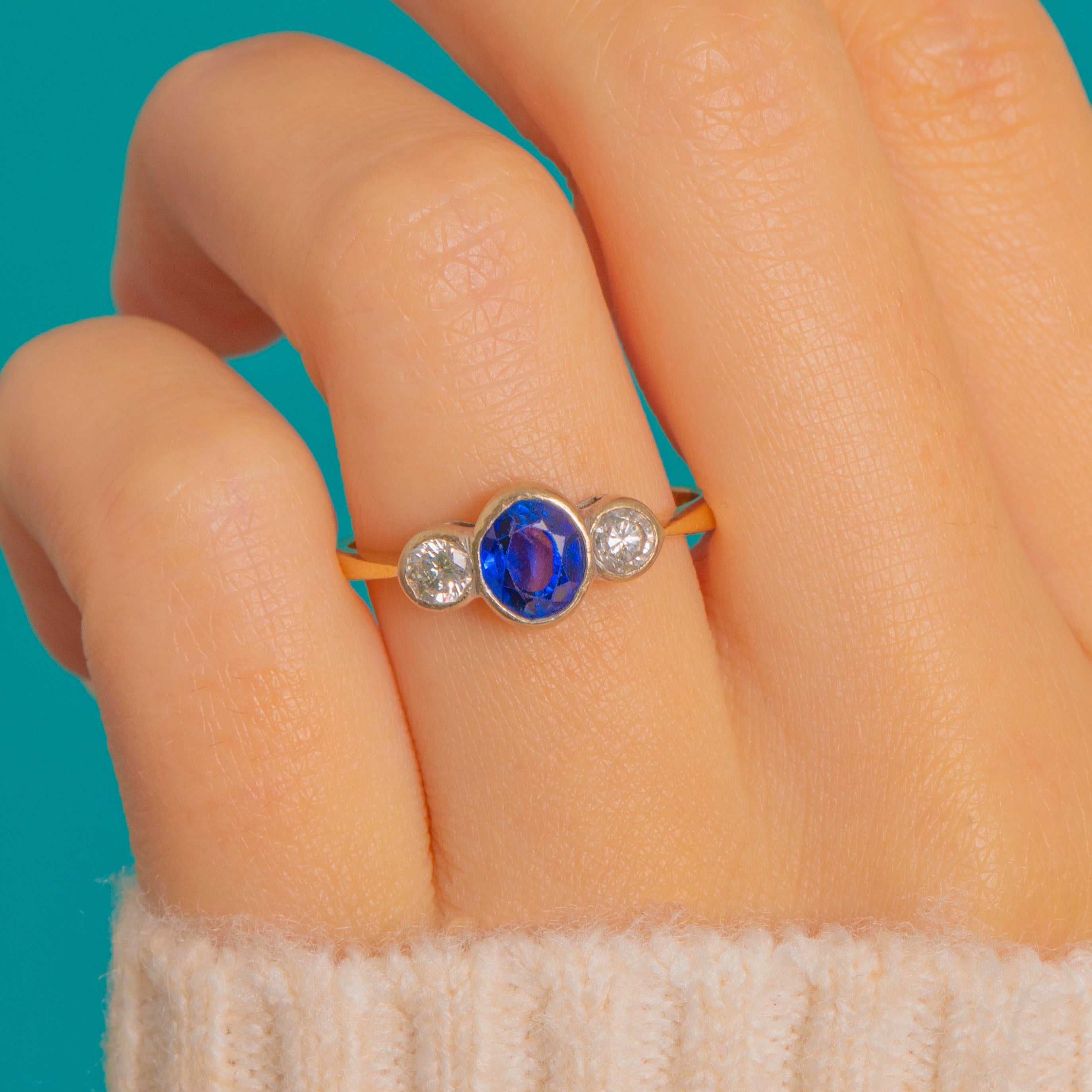 A timeless Art Deco three-stone ring showcasing a deep royal blue 0.55ct. Oval Sapphire framed by two bright round Diamonds adding up to 0.20ct. The gemstones are neatly rub-over set in an 18ct White Gold head that flows into a slim 18ct Yellow Gold shank, creating a refined two-tone silhouette with wonderful contrast.