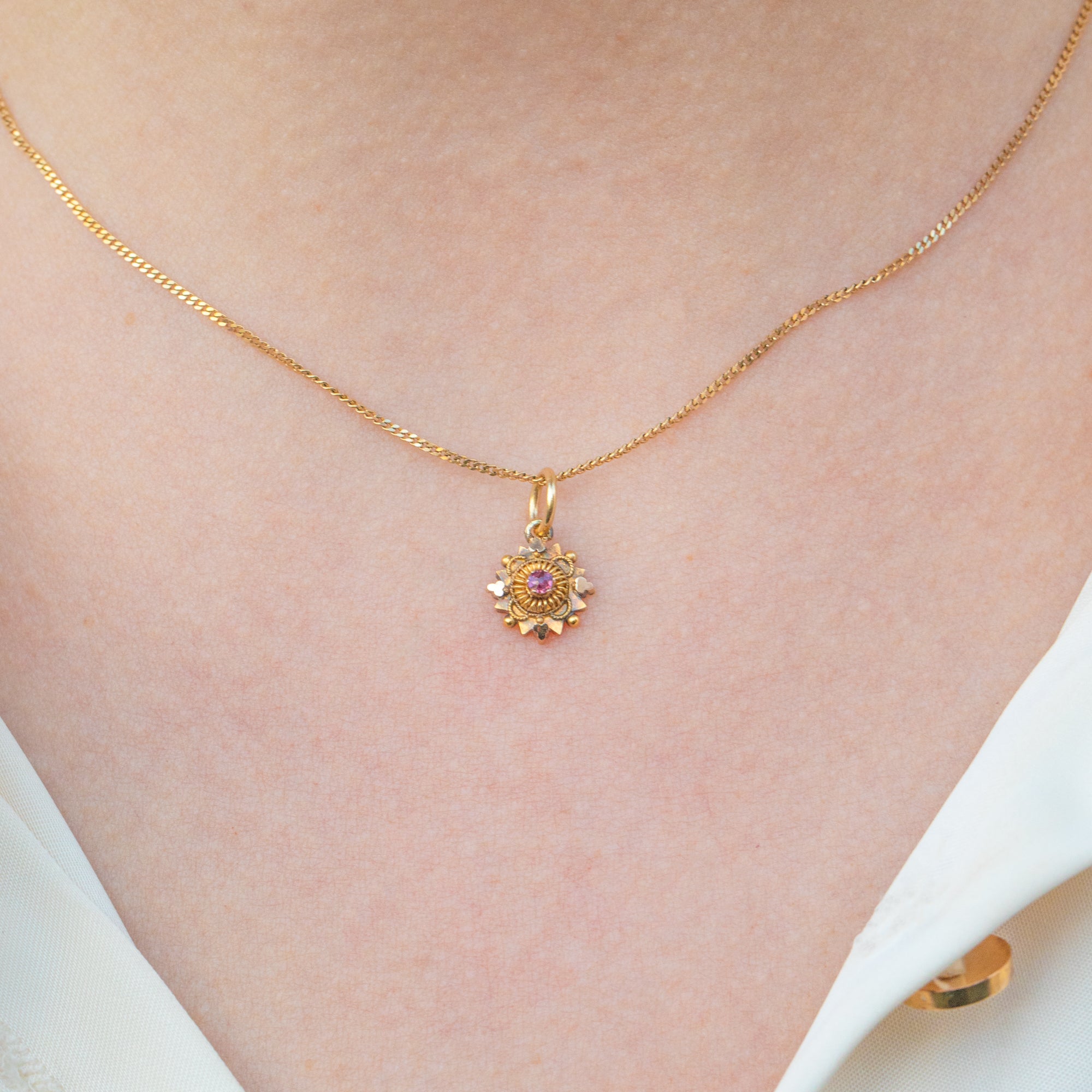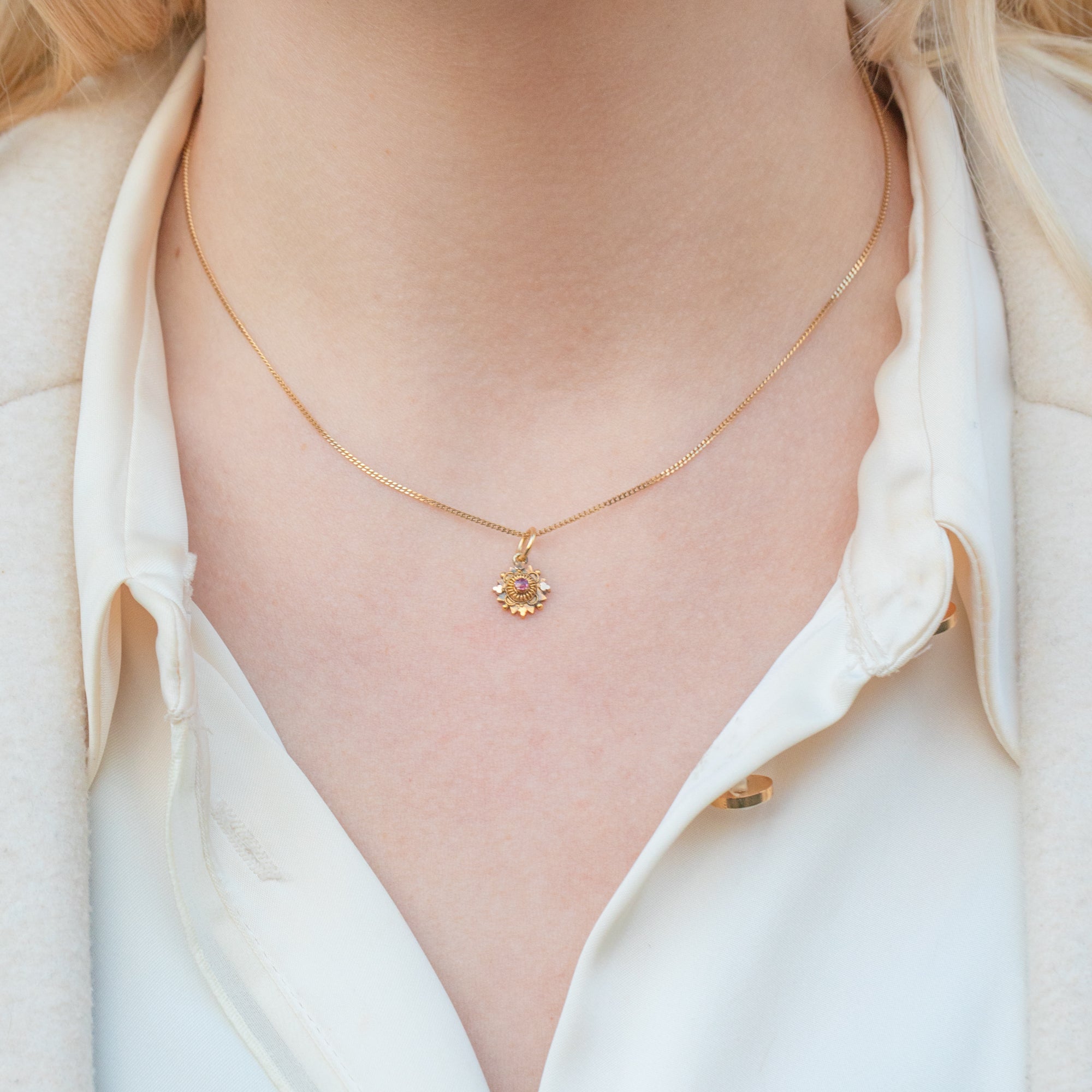 Sitting pretty in the centre of the piece is a dainty Ruby, surrounded by a cannetille border and rope details - she may be small, but she's certainly mighty and will elevate any simple Gold chain.