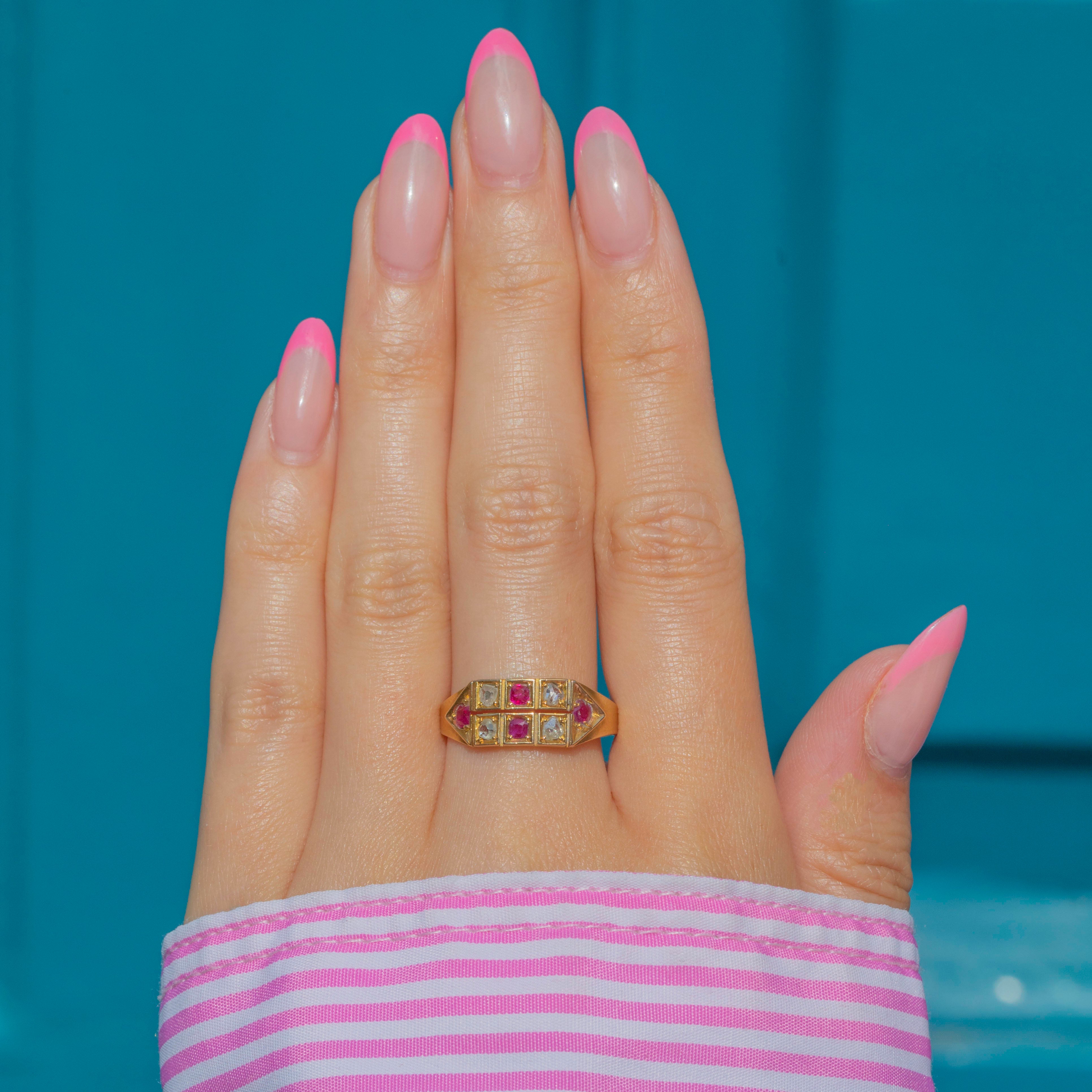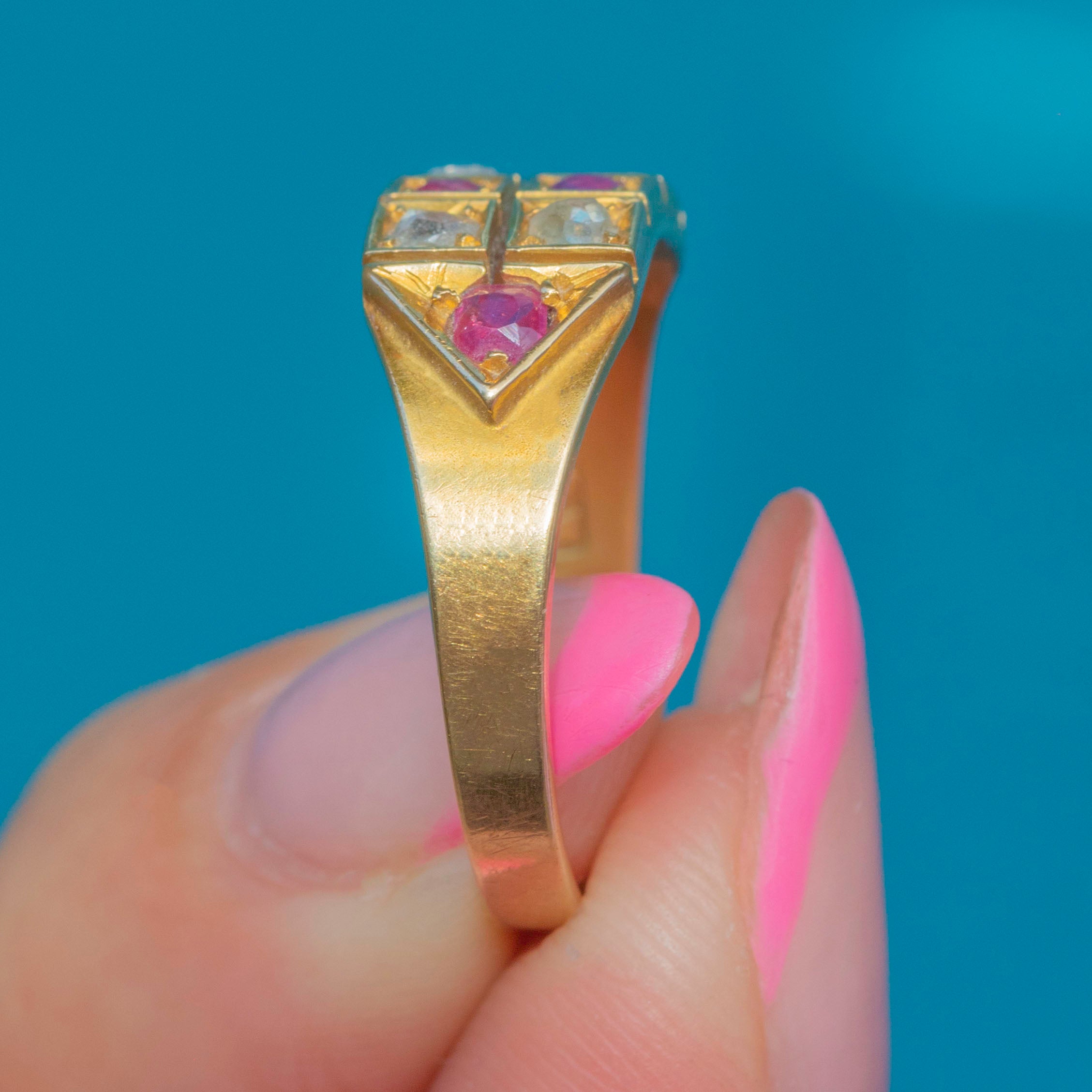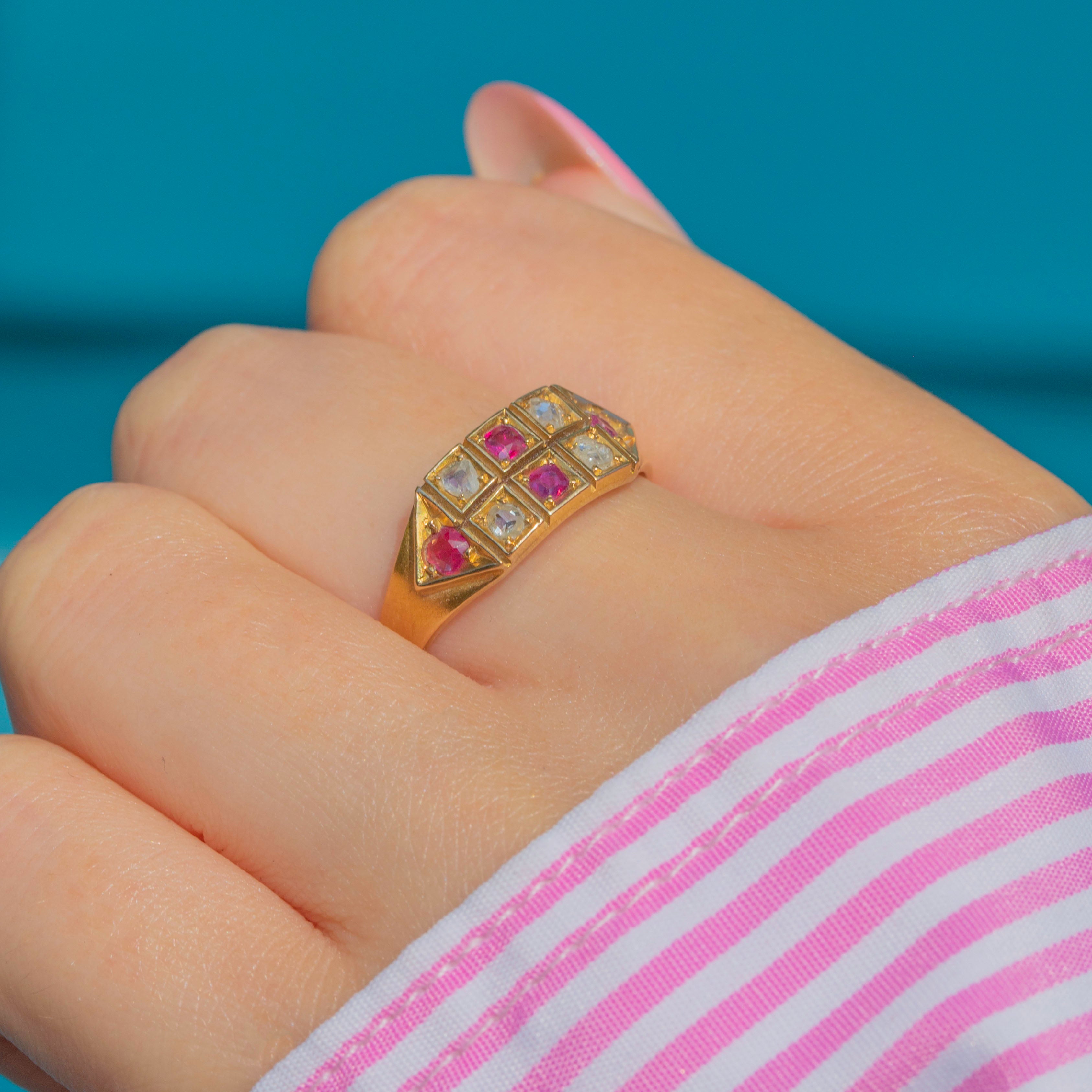 EXCELLENT: This antique 18ct Gold Ruby Diamond chequerboard ring is in excellent condition. The Gold has a bright saturation with a magnificent satin finish, and only mild age related wear visible under close inspection. The gemstones are crisply faceted and securely set, with no chips or abrasions. The chunky antique hallmarks are fully legible, allowing us to accurately date this Victorian treasure to 1876!