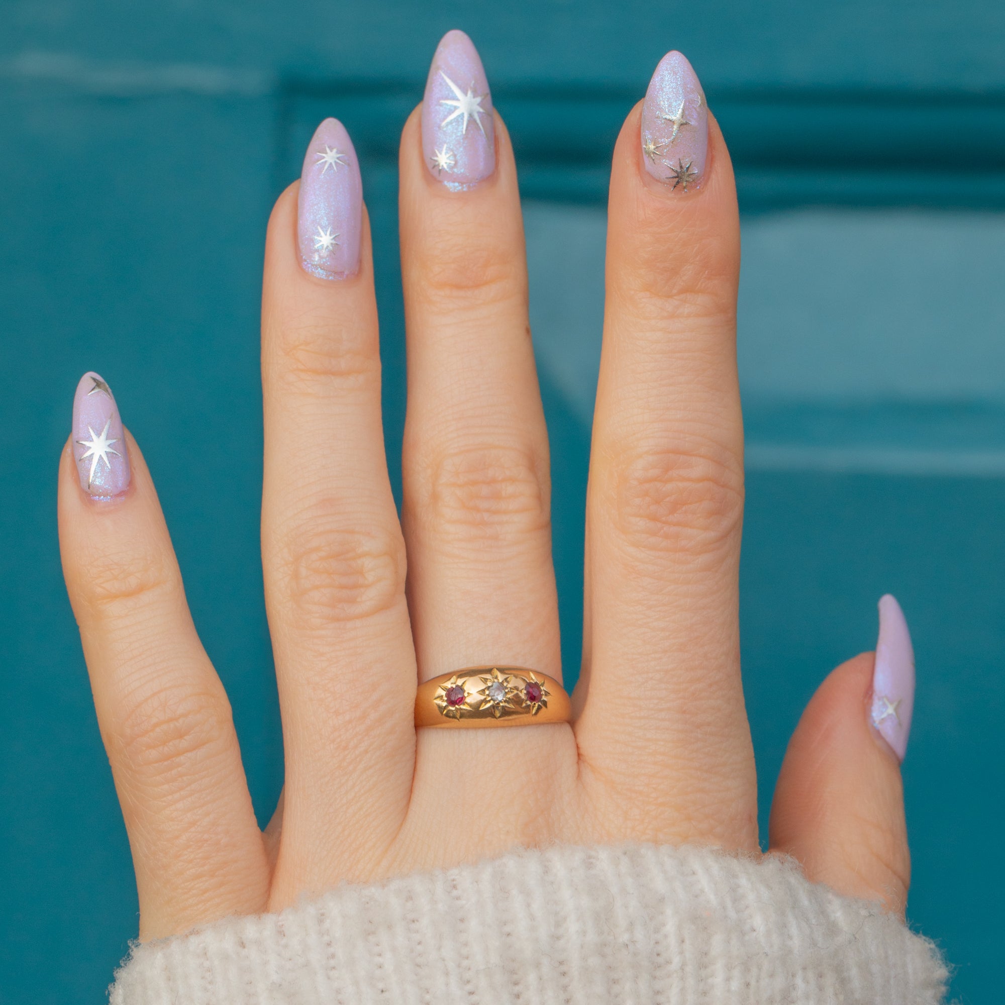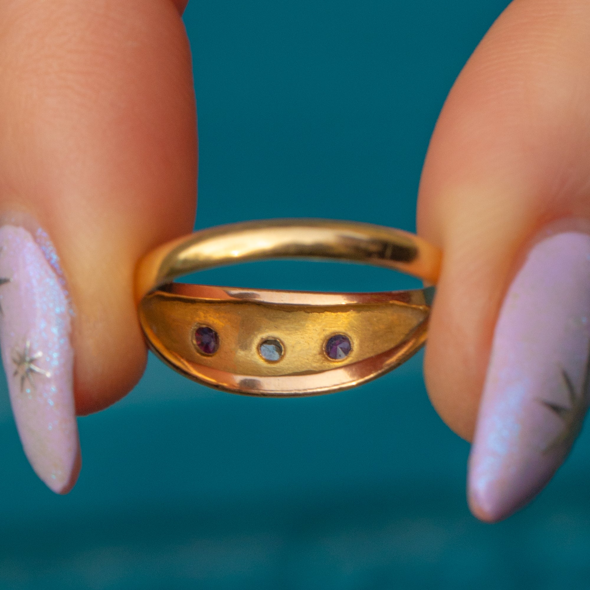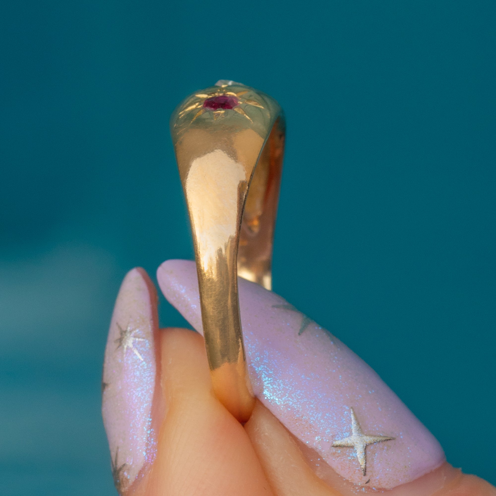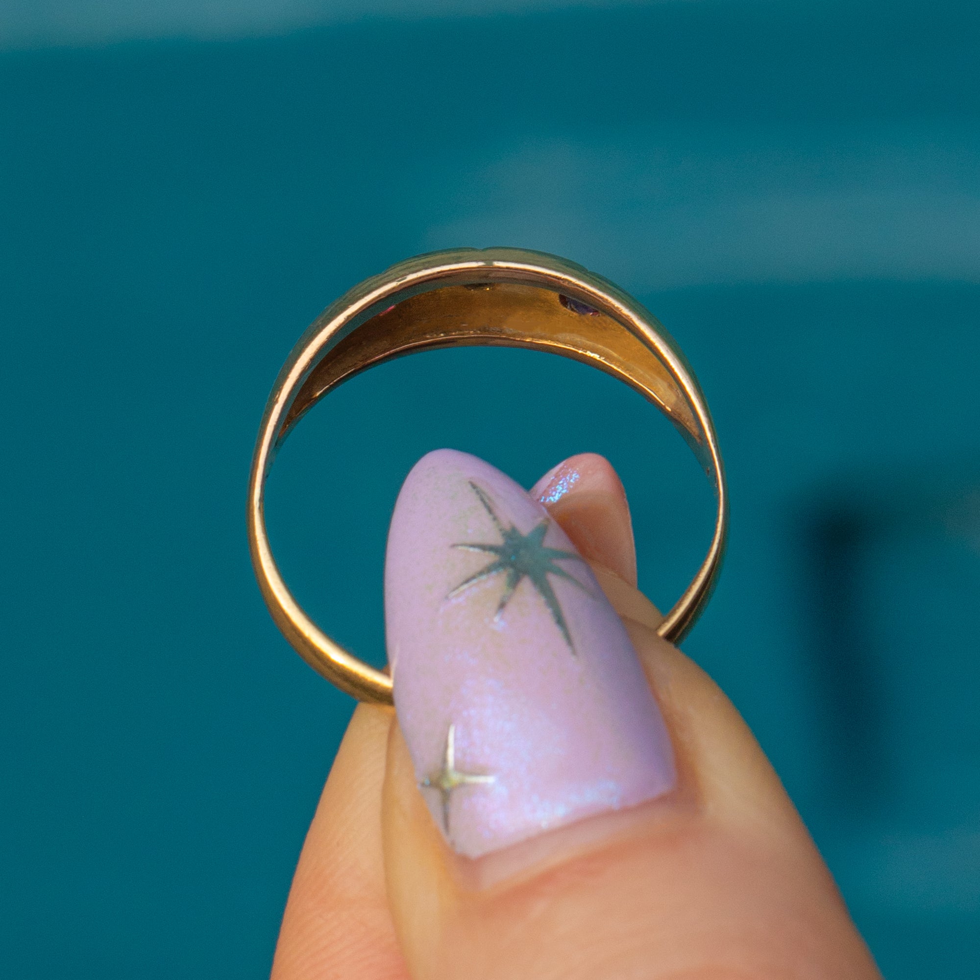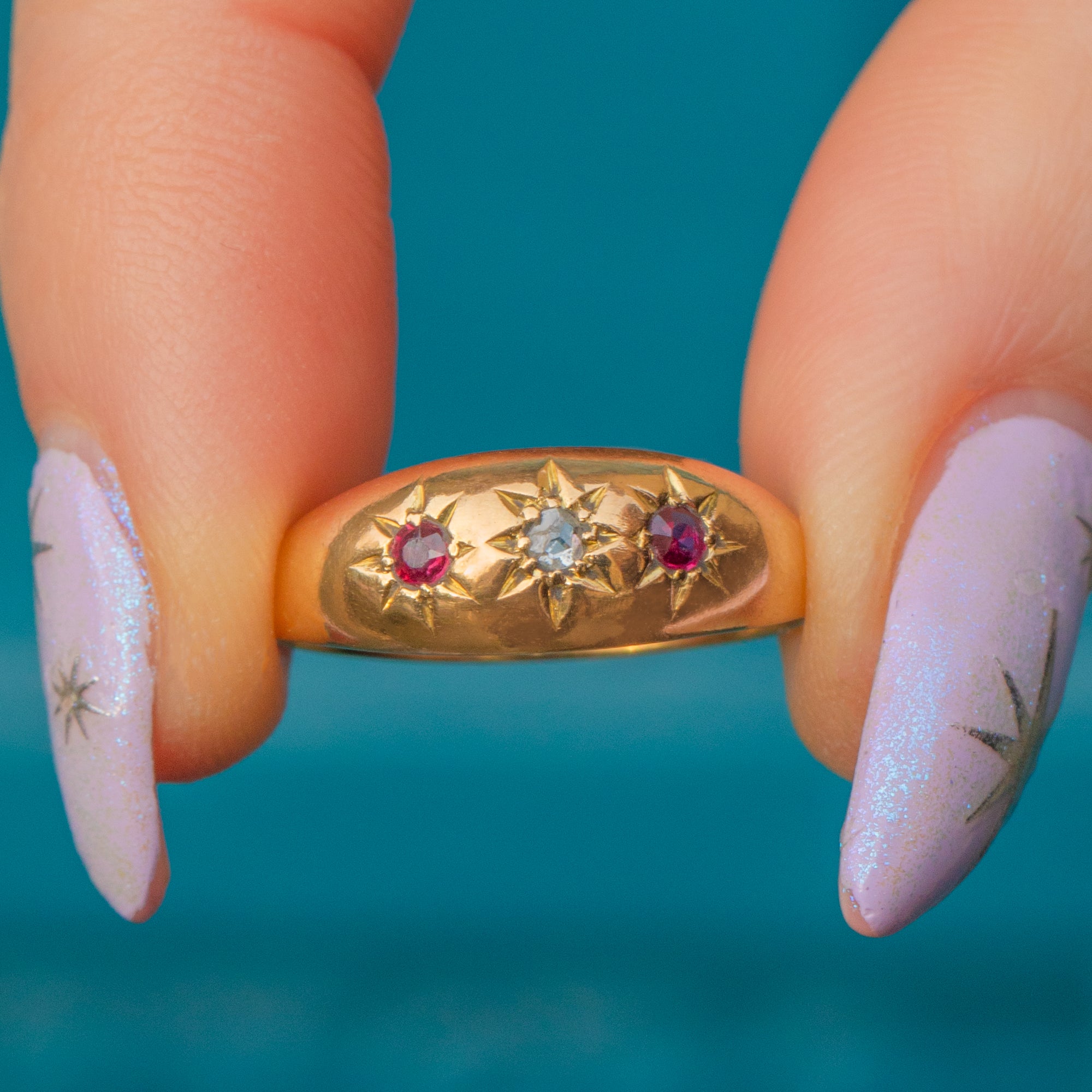 With a low profile and a captivating selection of gems flush set in bold star settings, this Victorian gypsy ring is perfect for adding a touch of antique luxury to your everyday outift!