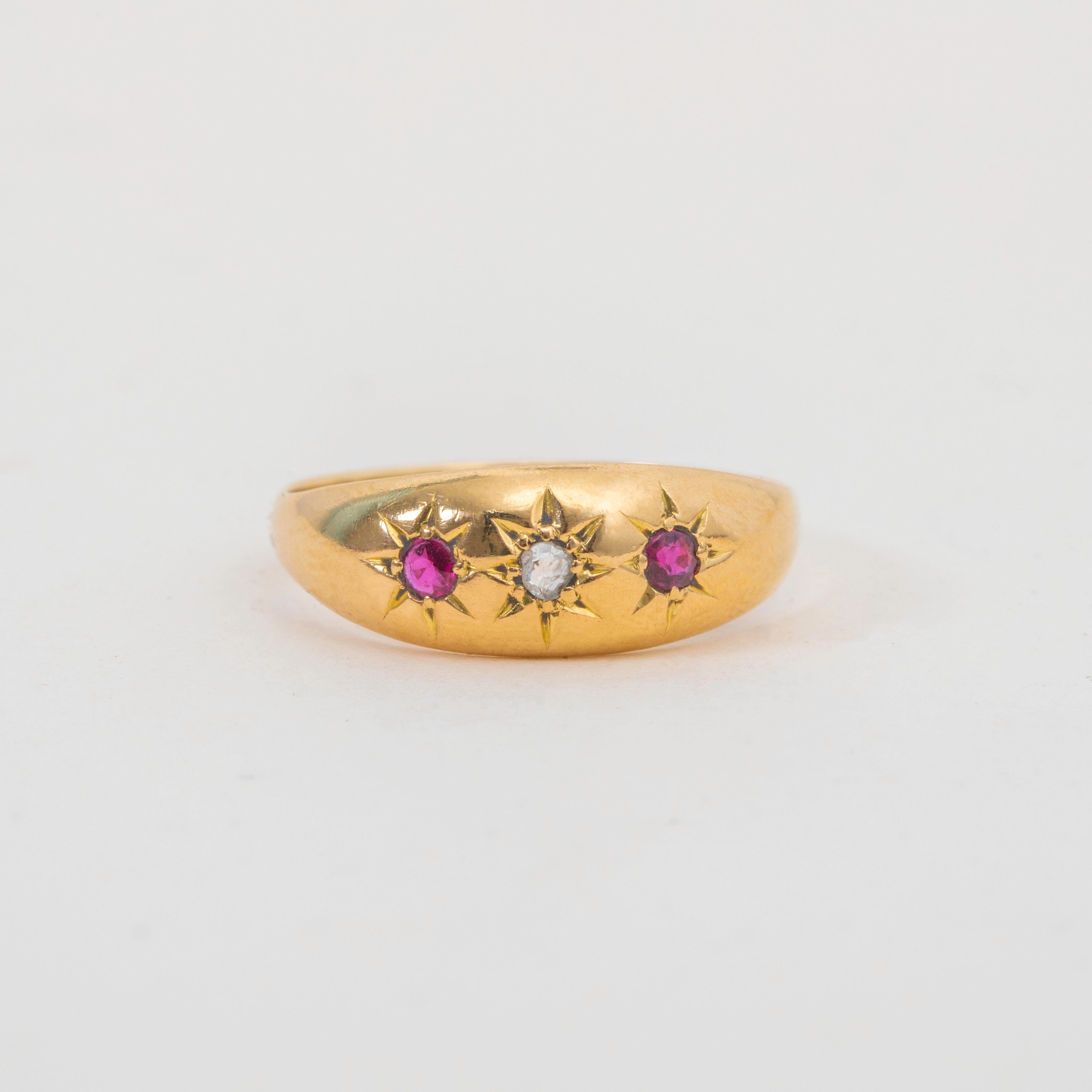 VERY GOOD-EXCELLENT. This antique 18ct Gold Ruby Diamond gypsy ring is in lovely condition. The gemstones are securely set and free from chips or abrasions, providing this antique Gold ring with a subtly sparkling accent. The Gold is bright with only minor surface wear, commensurate with age, and has kept its form well. With a chunky antique 18CT stamp and so much wear potential, this Victorian Ruby Diamond ring is set to become your new everyday essential!