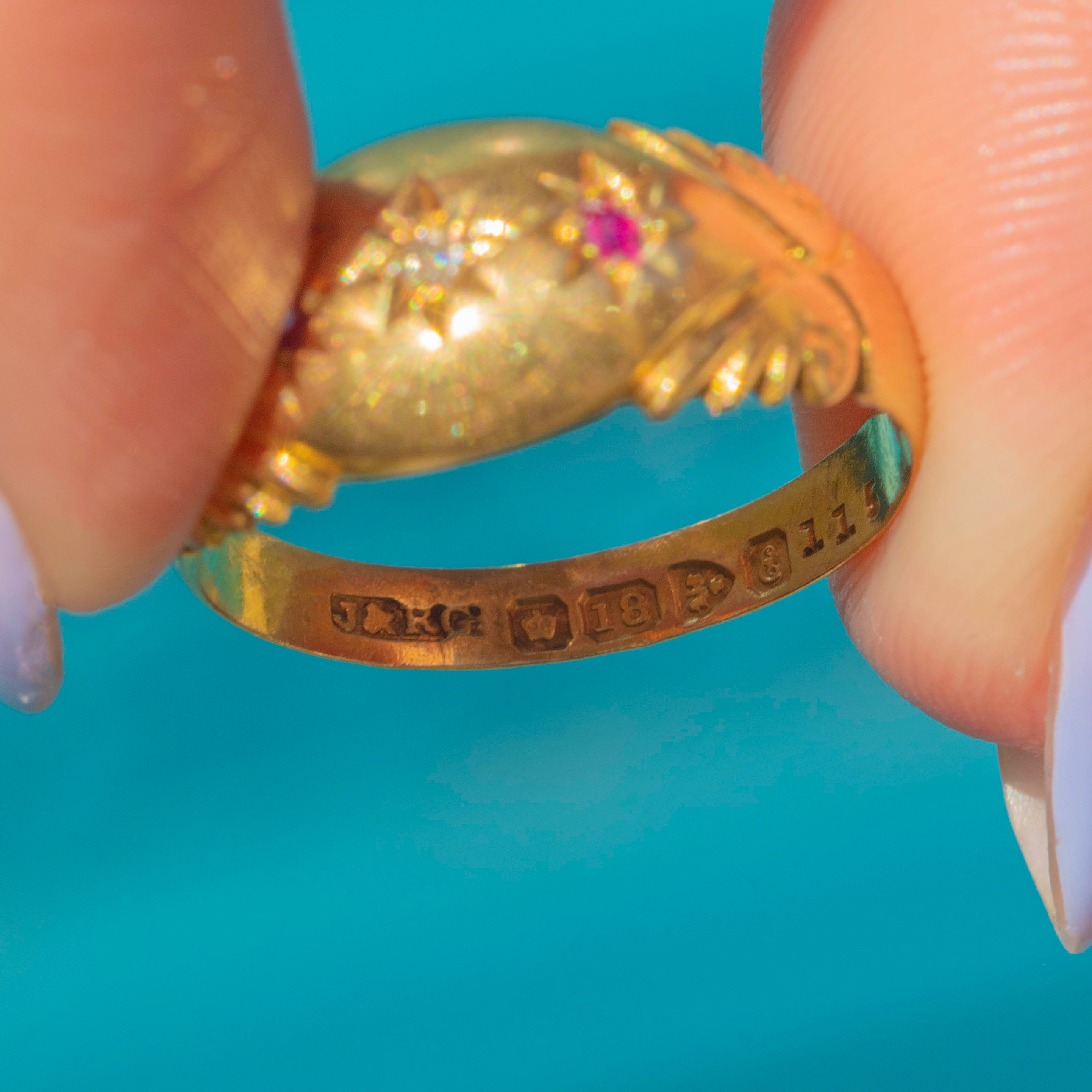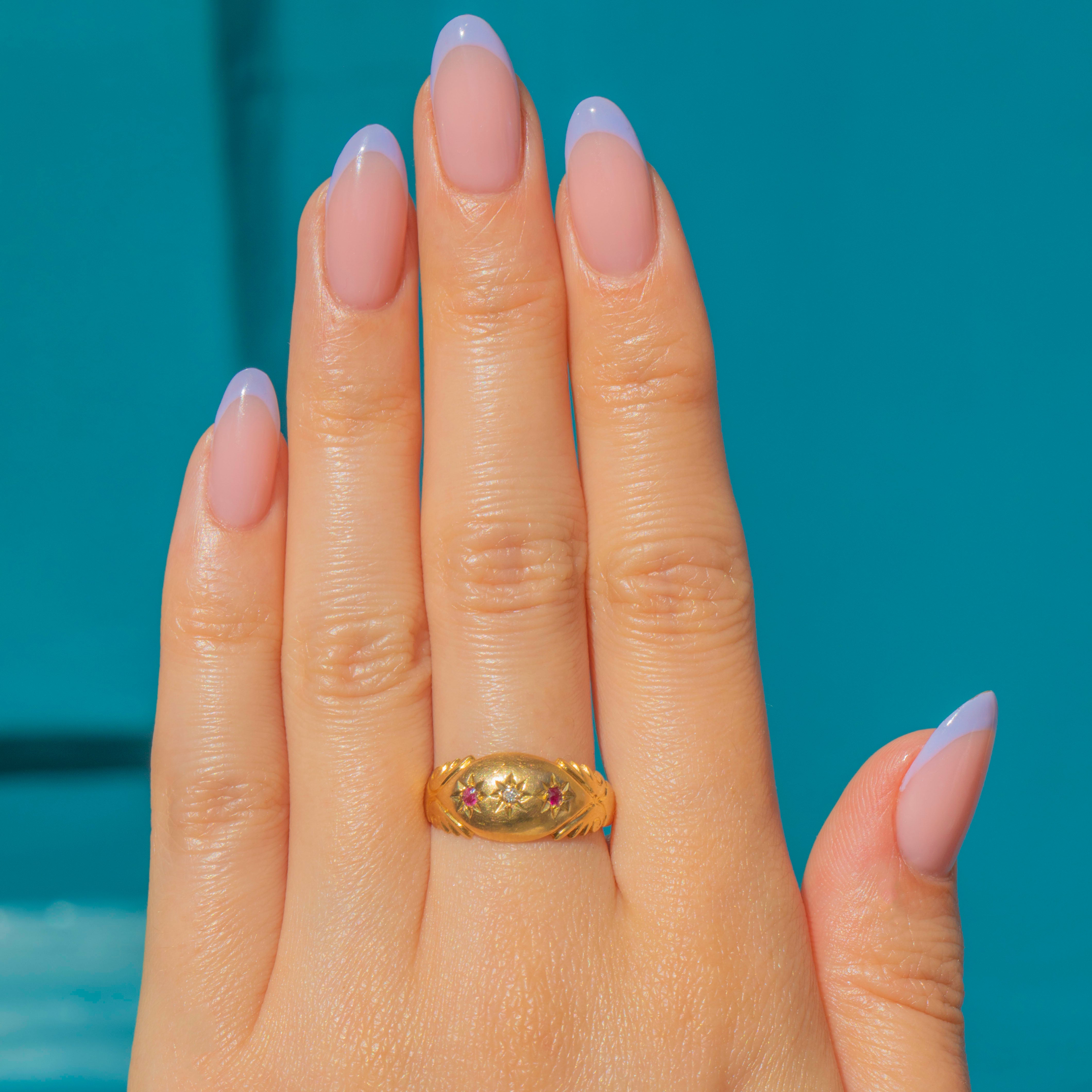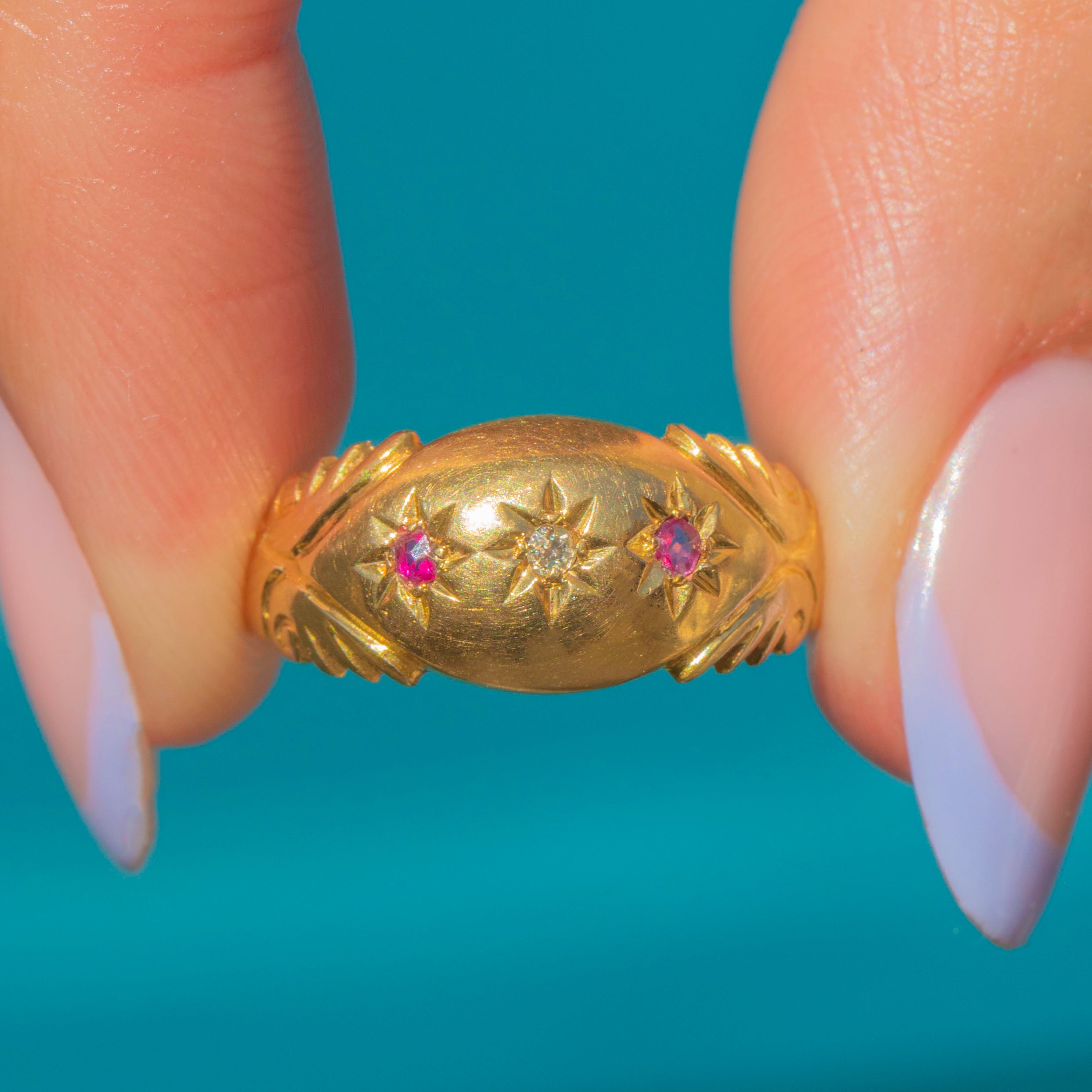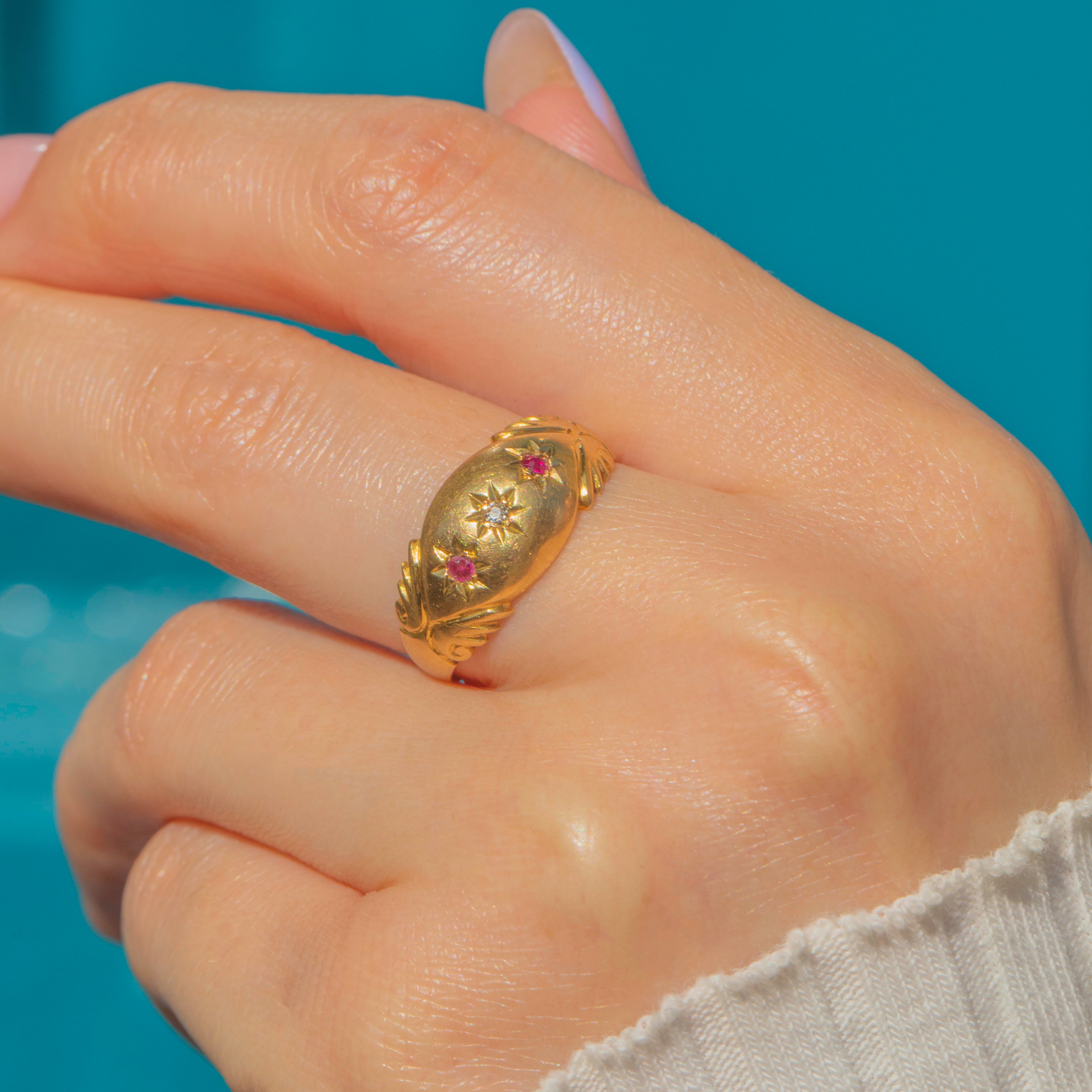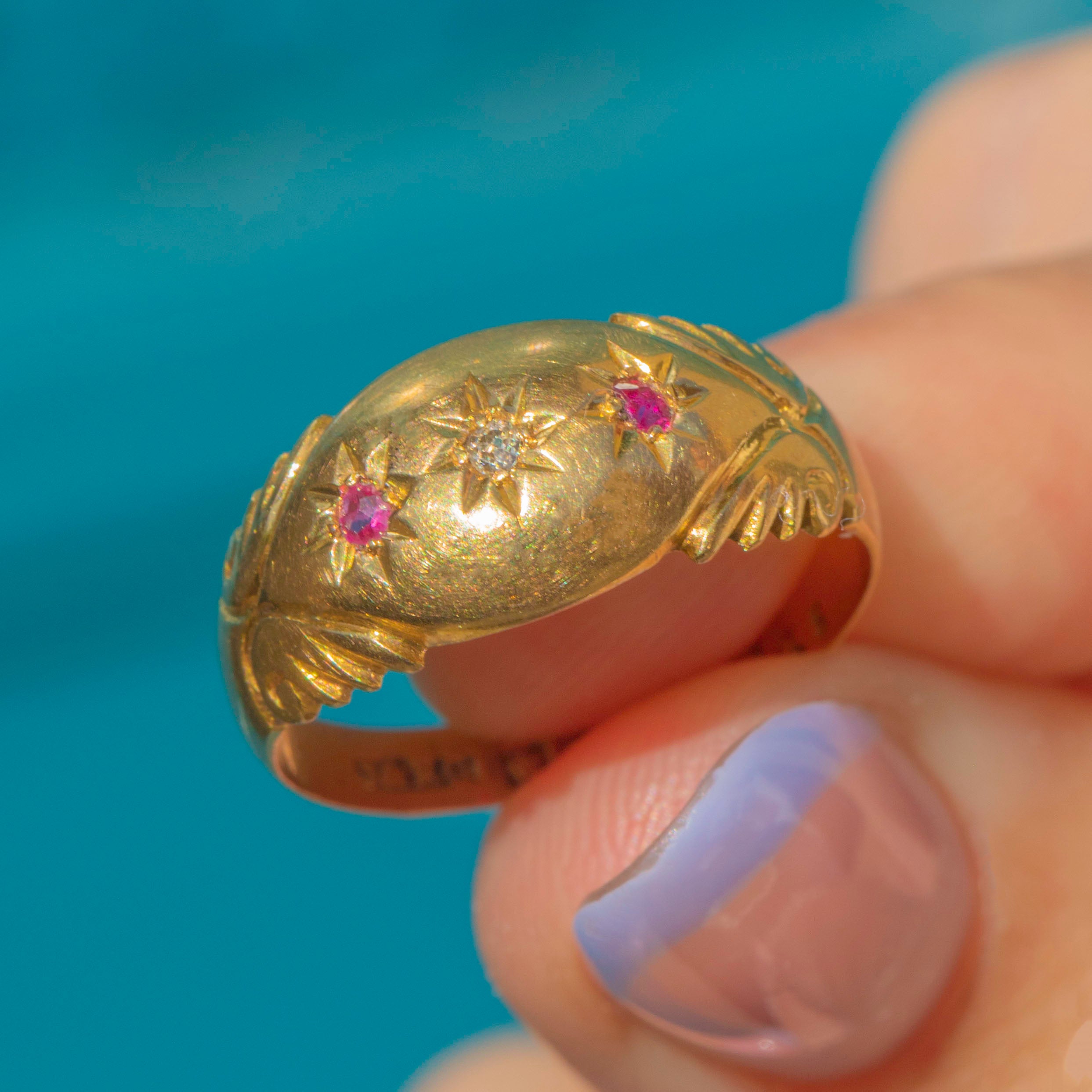 A glimmering Diamond takes centre stage and is flanked by two hot pink Rubies, each one displayed within bold star settings, adding an enchanting celestial touch. Complete with a full set of hallmarks dating to 1905, including the rare Chester Assay, this Edwardian gypsy ring is a highly collectible piece!