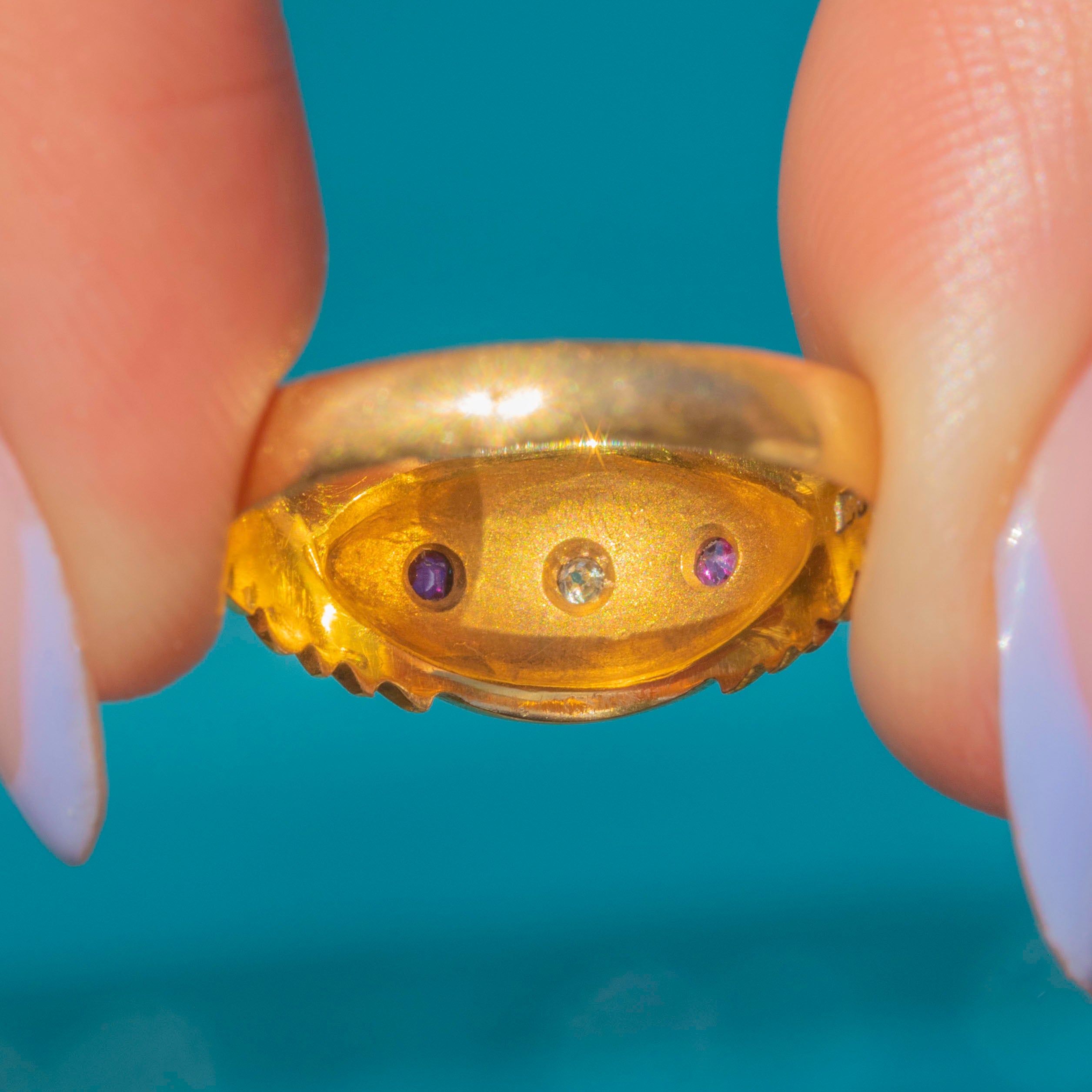 EXCELLENT: This antique 18ct Gold Ruby Diamond gypsy ring is in excellent condition. The Gold is brightly saturated and the ring has kept its form well, with no dings or scuffs to note. The gems are all securely set and free from surface wear, adding a subtle sparkling accent. With a full set of English hallmarks, we can accurately date this Edwardian treasure to 1905!
