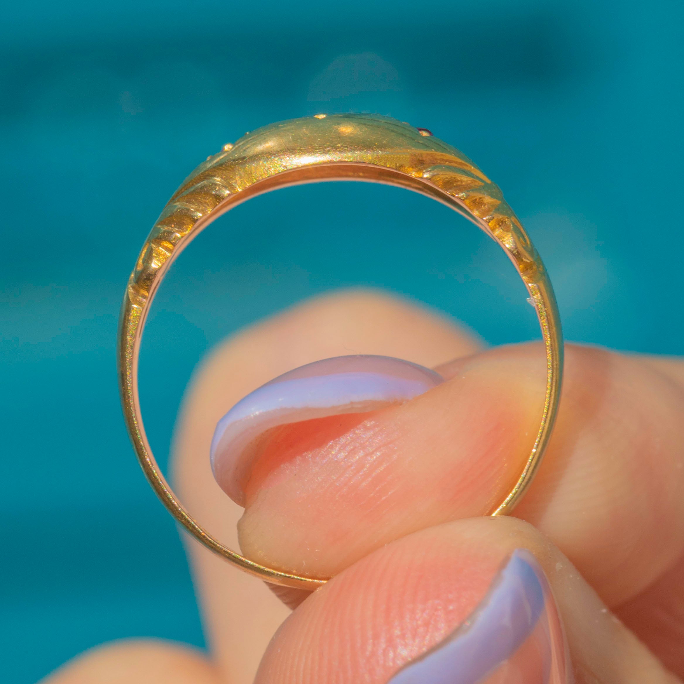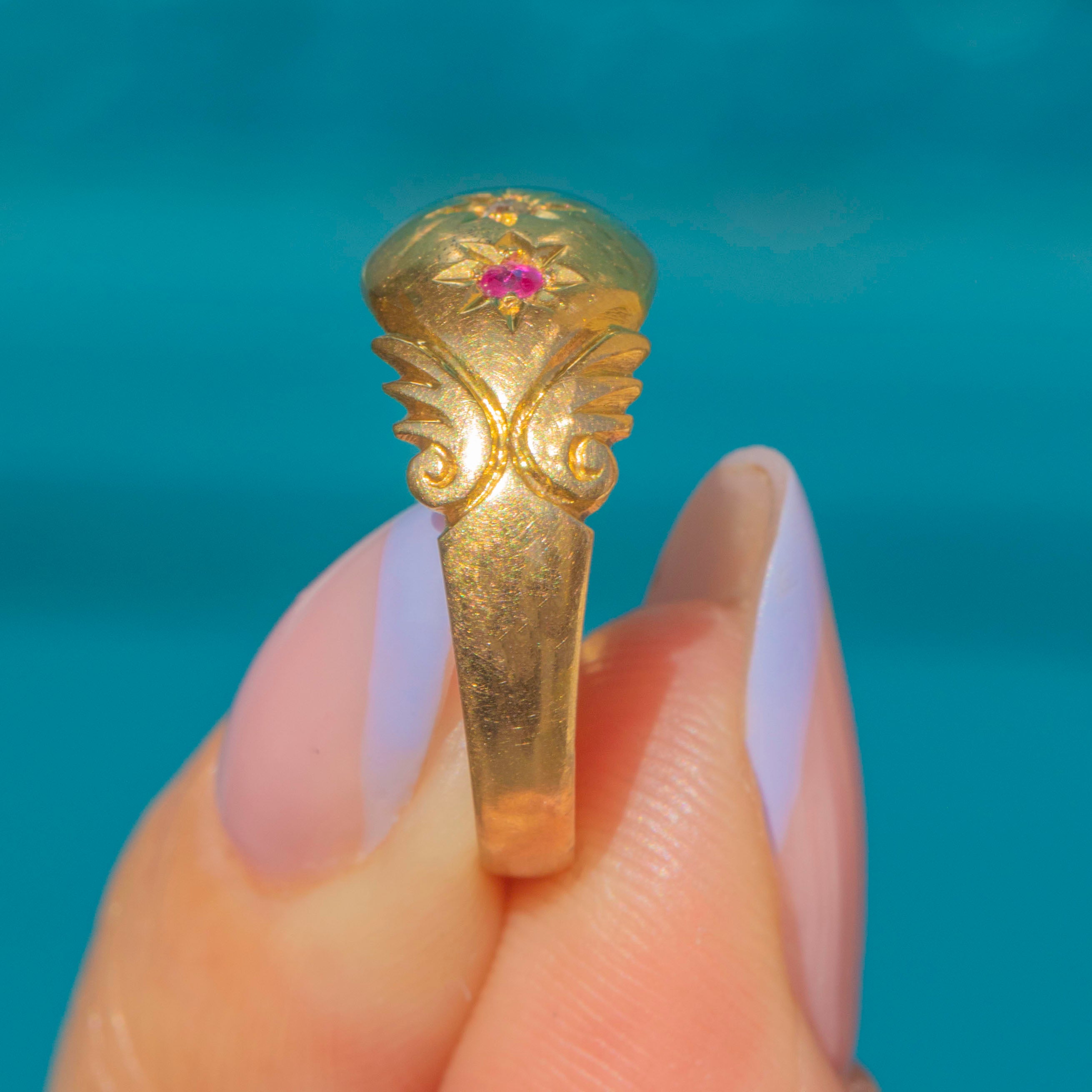 This antique 18ct Gold Ruby Diamond gypsy ring is the perfect piece for adding a touch of luxury to your everyday outfit! The chubby 18ct Gold band is rich and glossy, with ornate details framing the delectable gemstone trilogy.