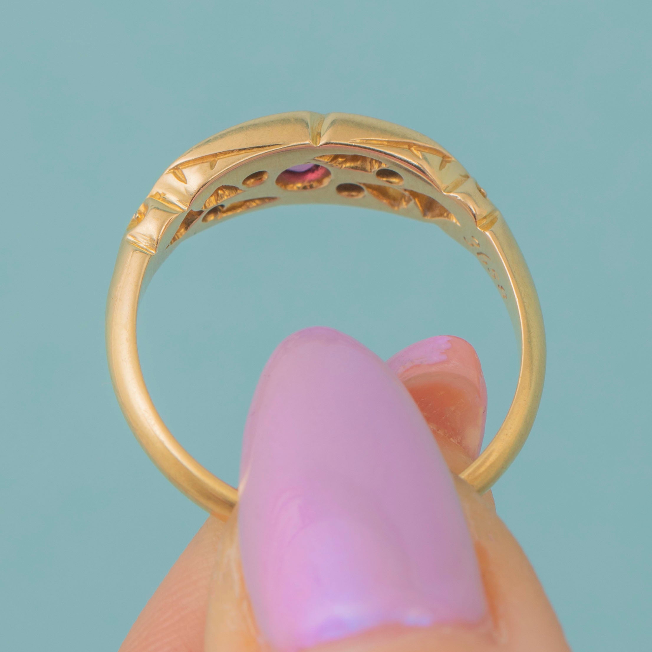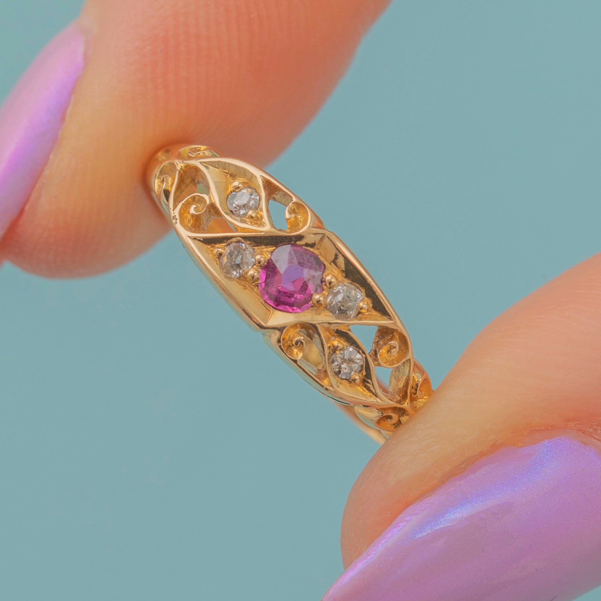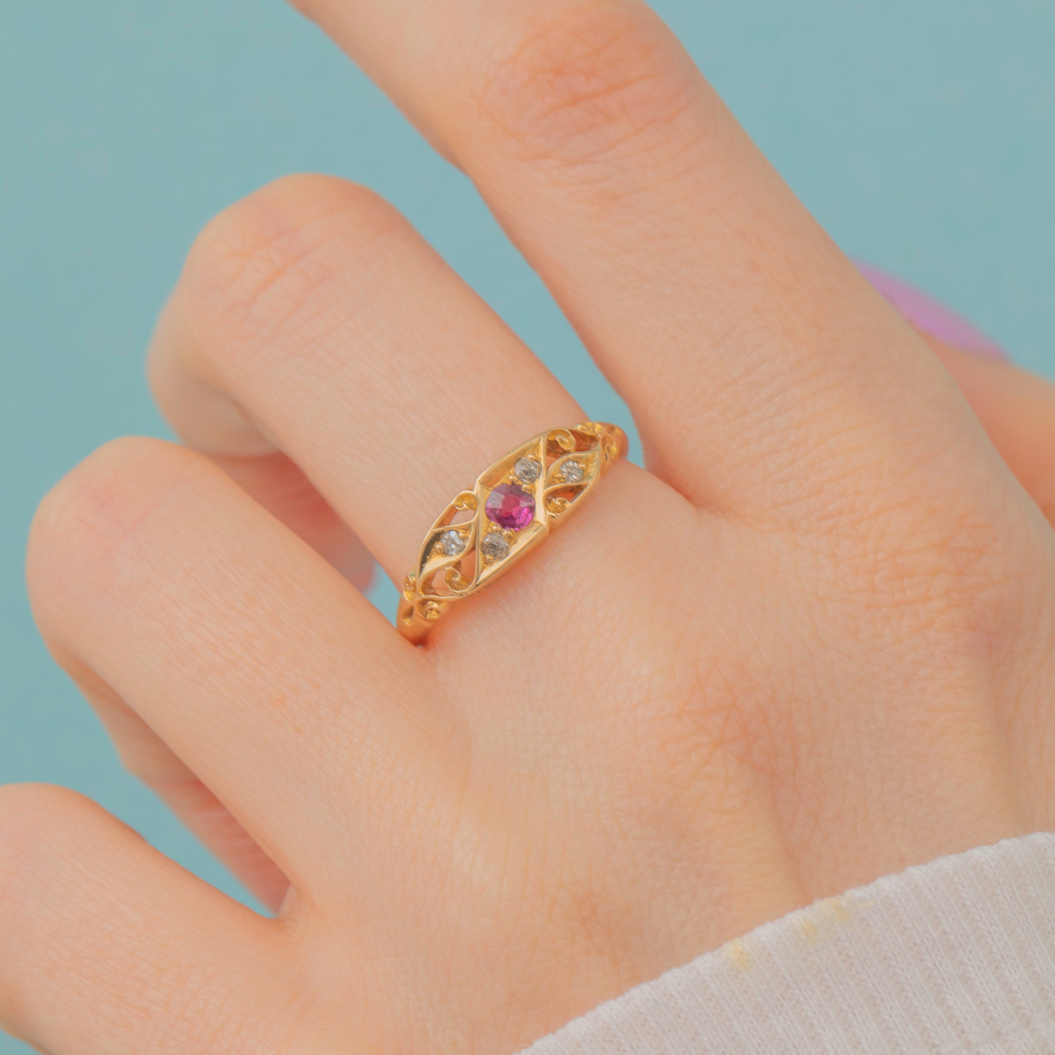 A sublime antique 18ct Gold Ruby Diamond openwork gypsy ring! This Victorian beauty is inlaid with a juicy 0.11ct Ruby, boasting a delectable fuchsia hue, flanked by four twinkling Diamonds.