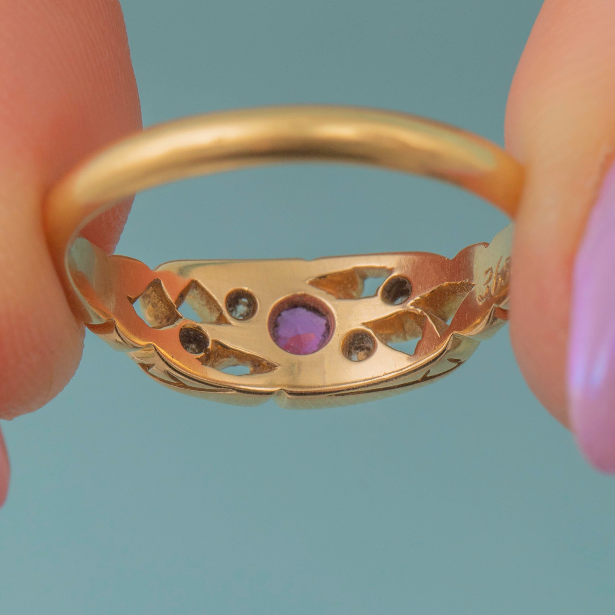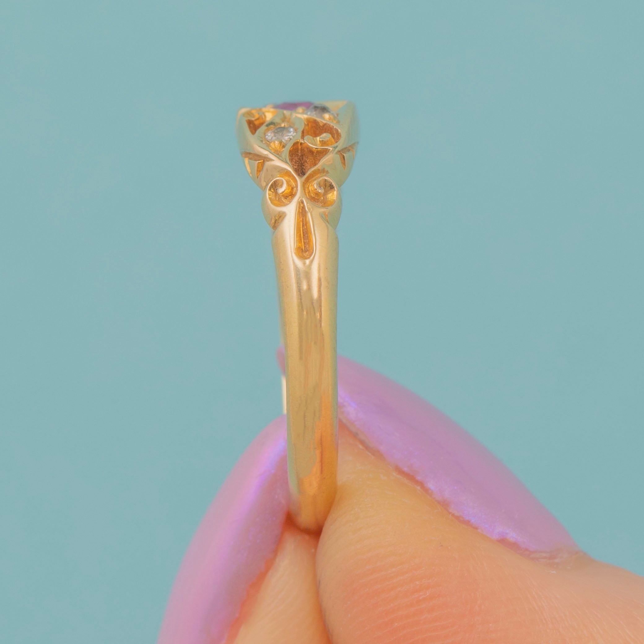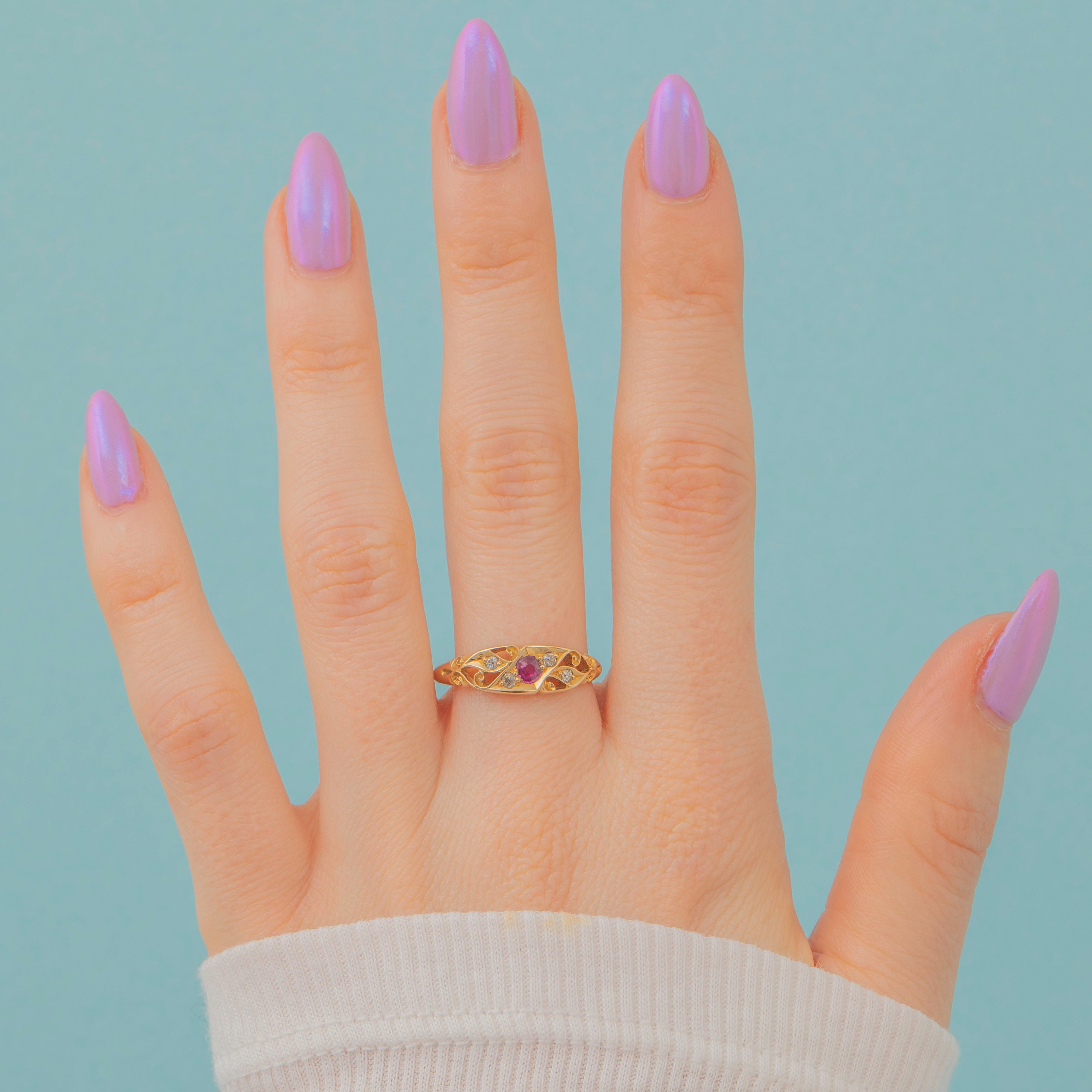 A sublime antique 18ct Gold Ruby Diamond openwork gypsy ring! This Victorian beauty is inlaid with a juicy 0.11ct Ruby, boasting a delectable fuchsia hue, flanked by four twinkling Diamonds.