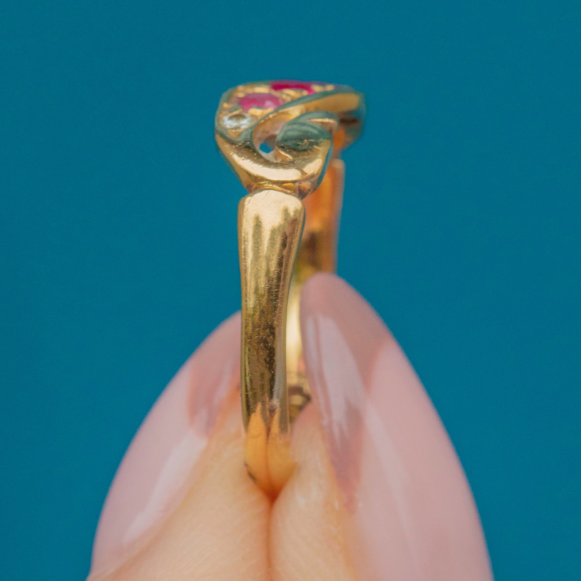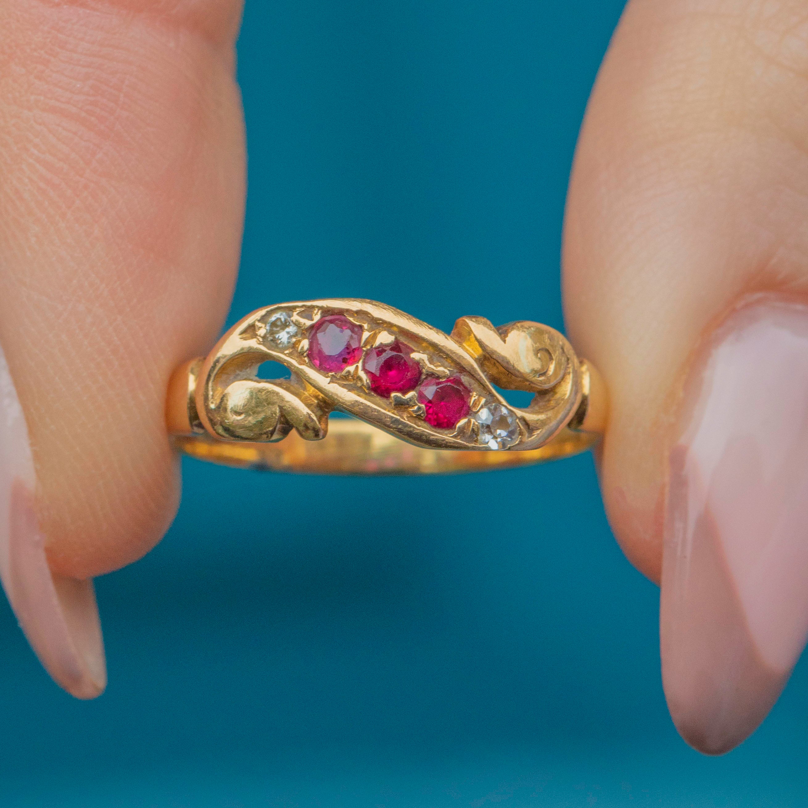 With sweeping curved lines embellished with dainty scarlett Rubies and crisp white Diamonds, this decorative antique 18ct Gold Ruby Diamond ring has a captivating regal appeal!