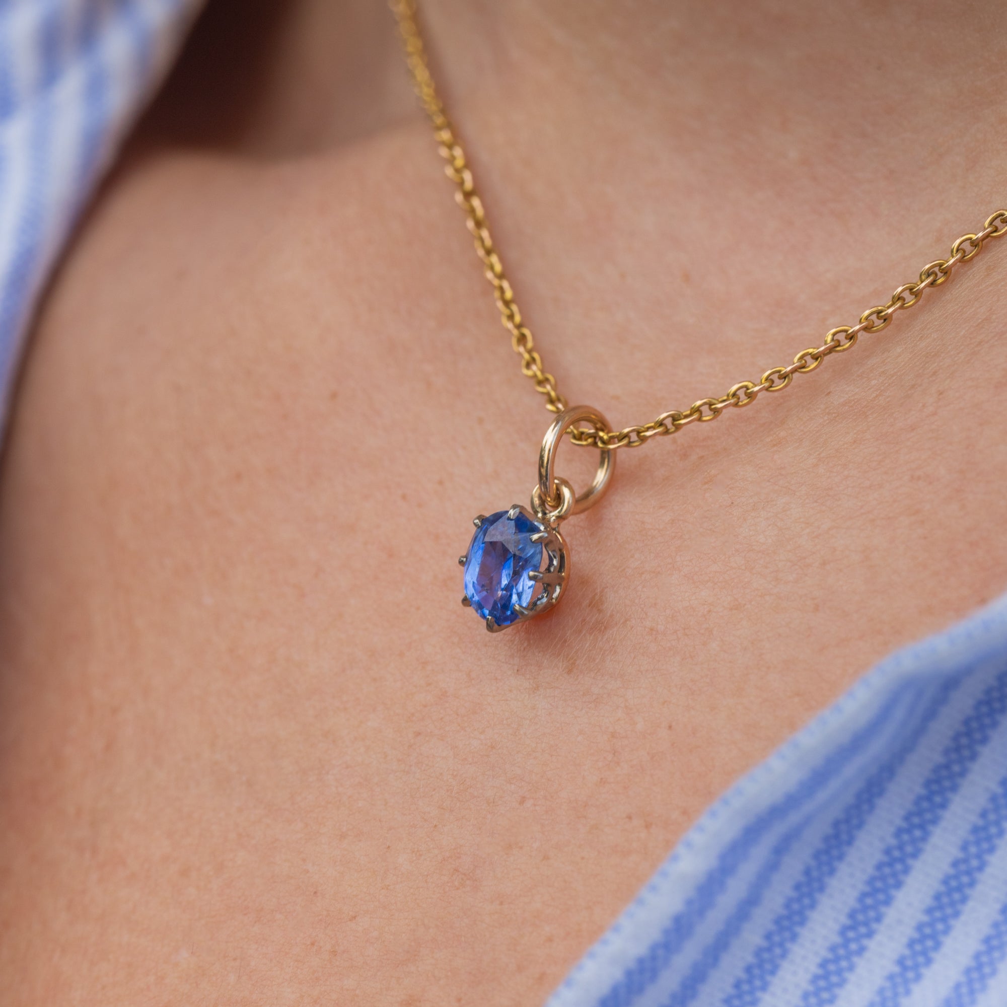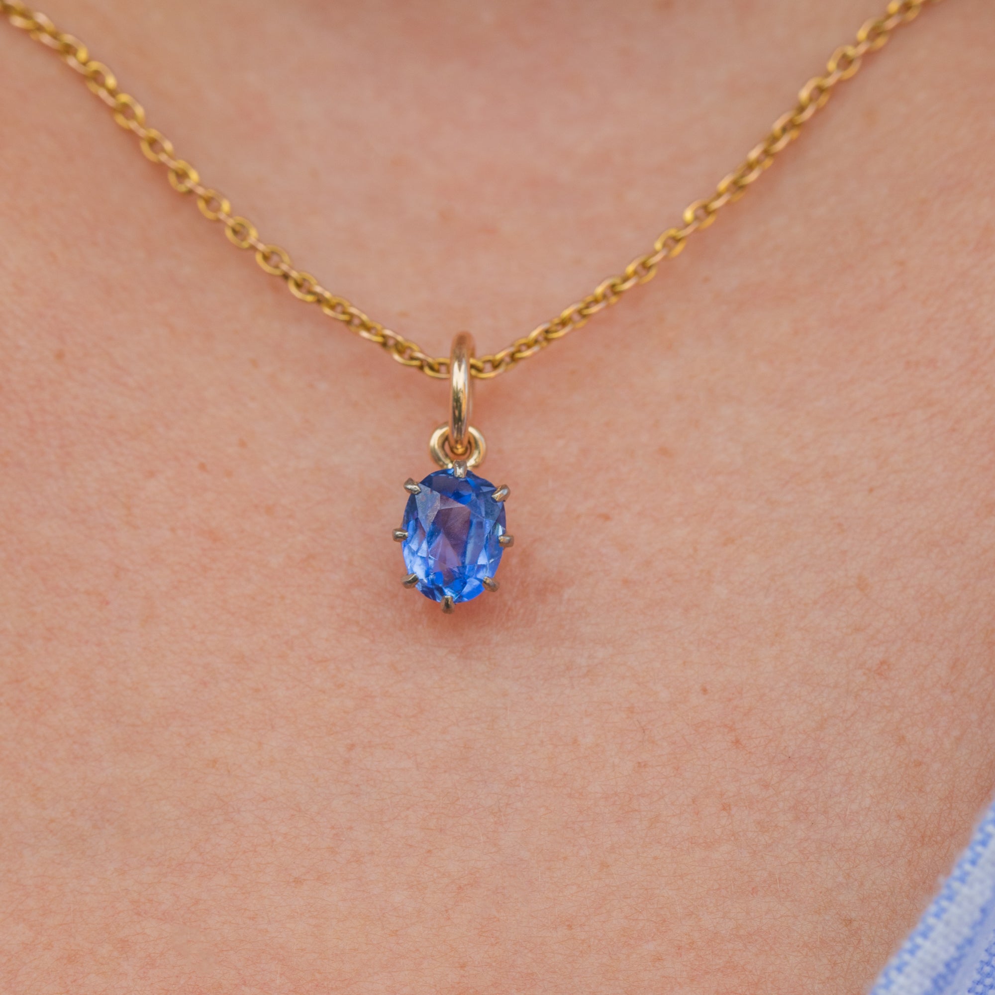 This antique 18ct Gold Sapphire charm will instantly add a touch of elegance to your décolletage! Displayed proudly within 18ct White Gold settings, the 1.87ct natural Sapphire has a deep profile with crisp cut facets that come to life beneath the light.