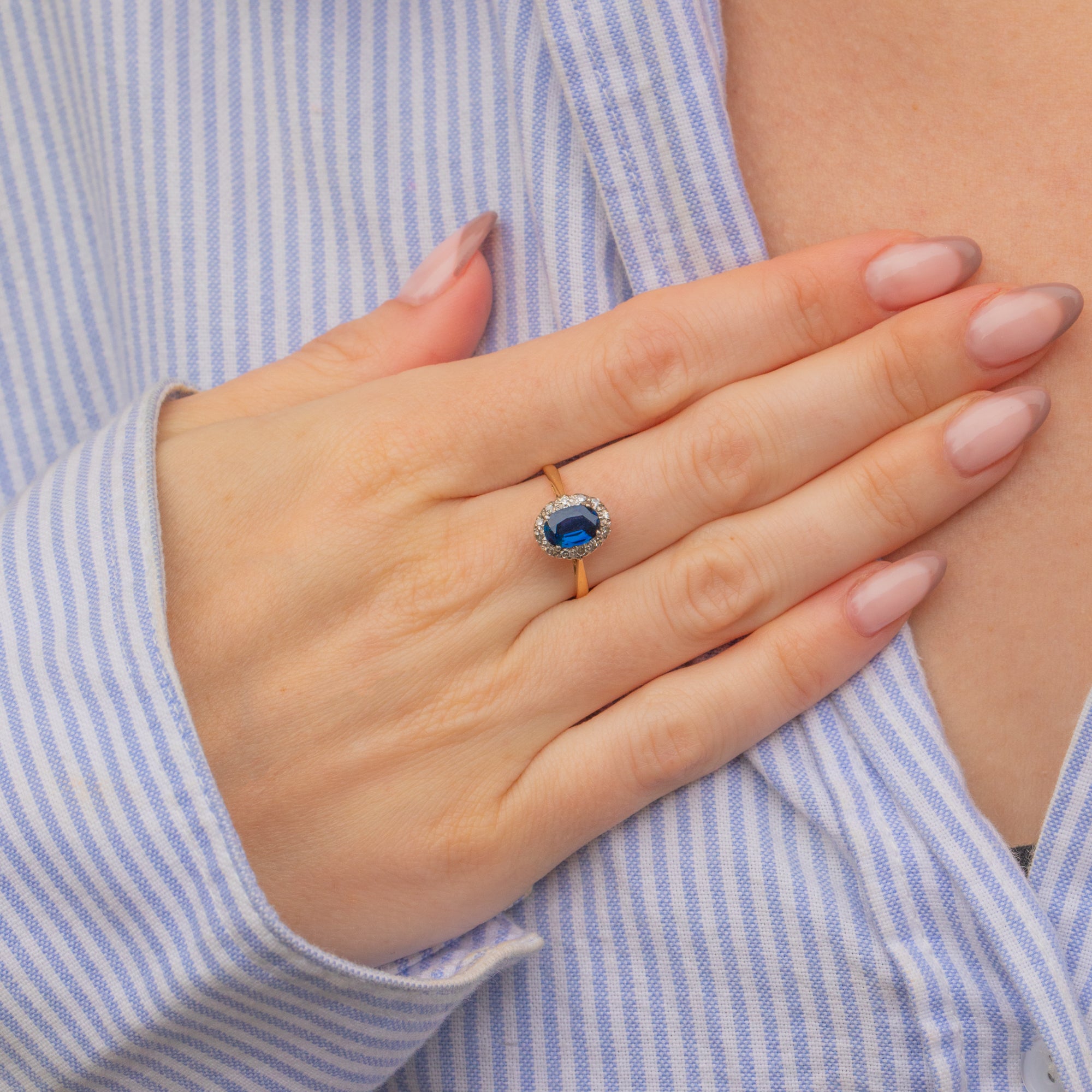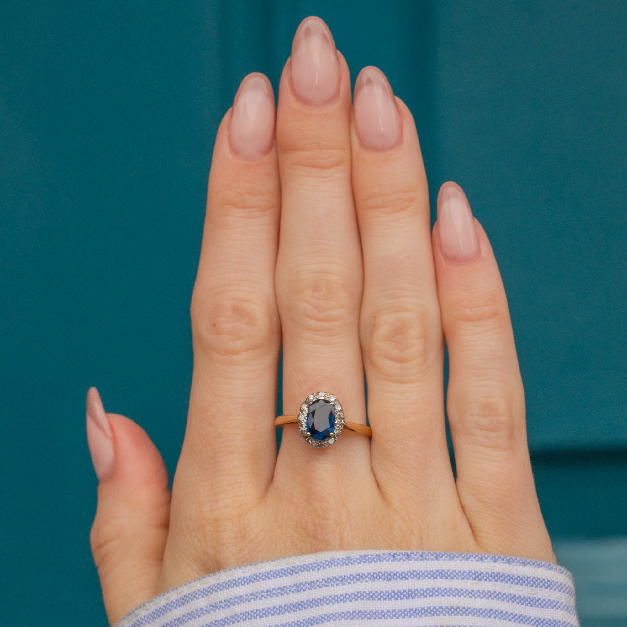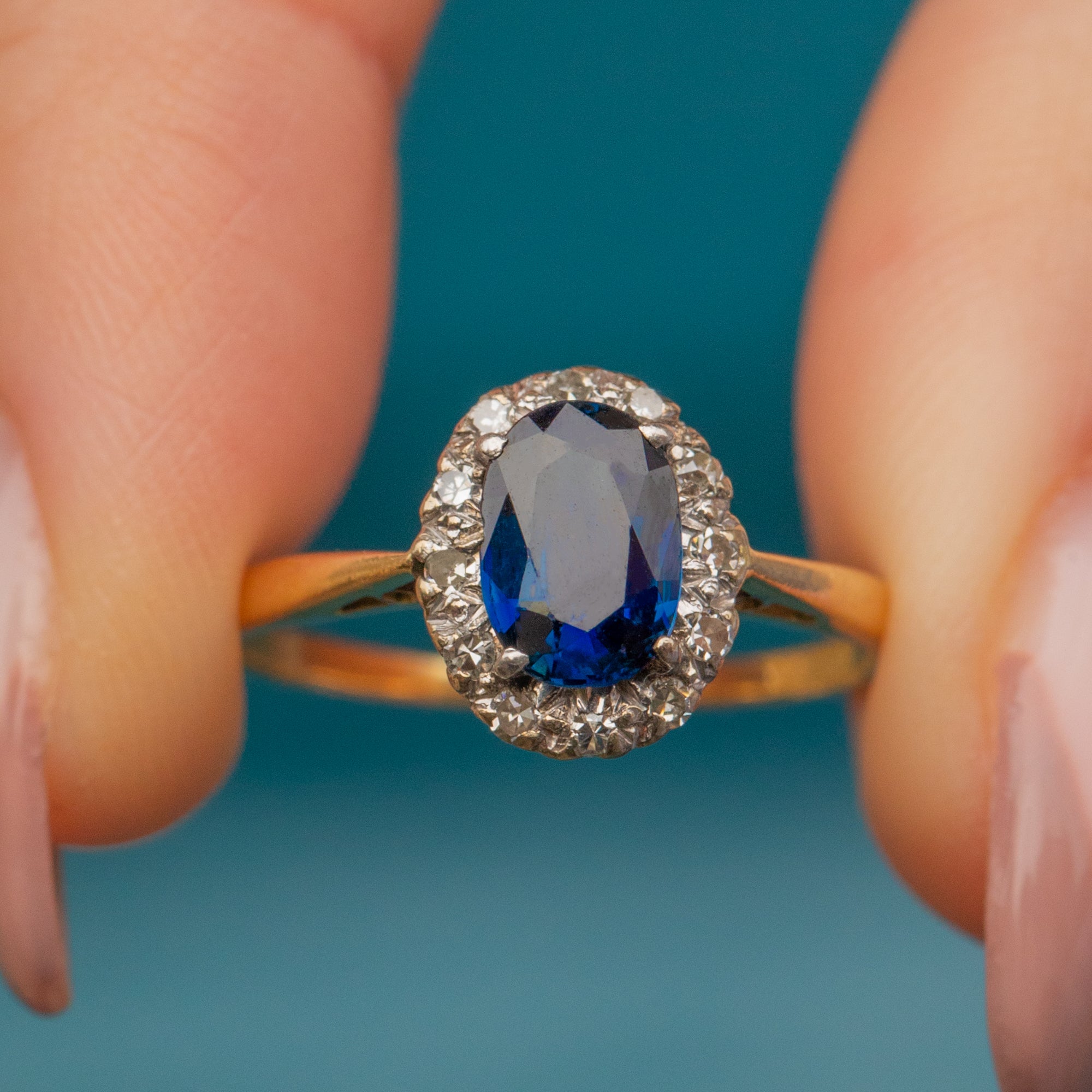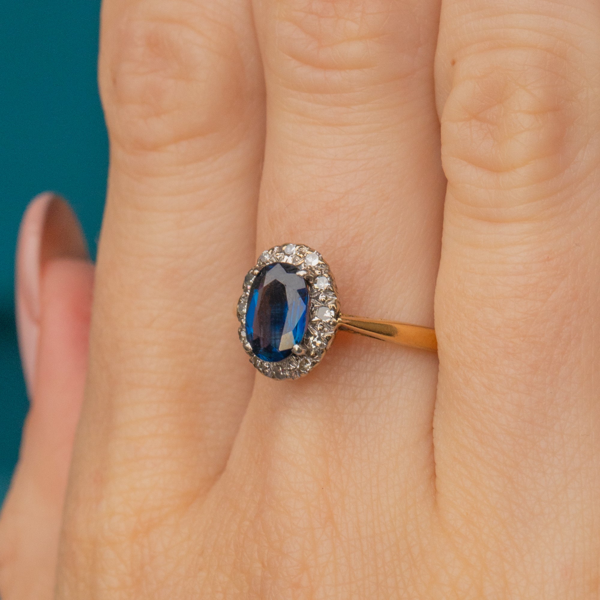 Perfect for everyday wear, this antique 18ct Gold Sapphire Diamond cluster ring would make a fabulous choice for a unique engagement ring! The 0.92ct Sapphire will instantly grab your attention, with its midnight blue hue and crisp catches that reveal glimmers of cobalt as they catch the light.