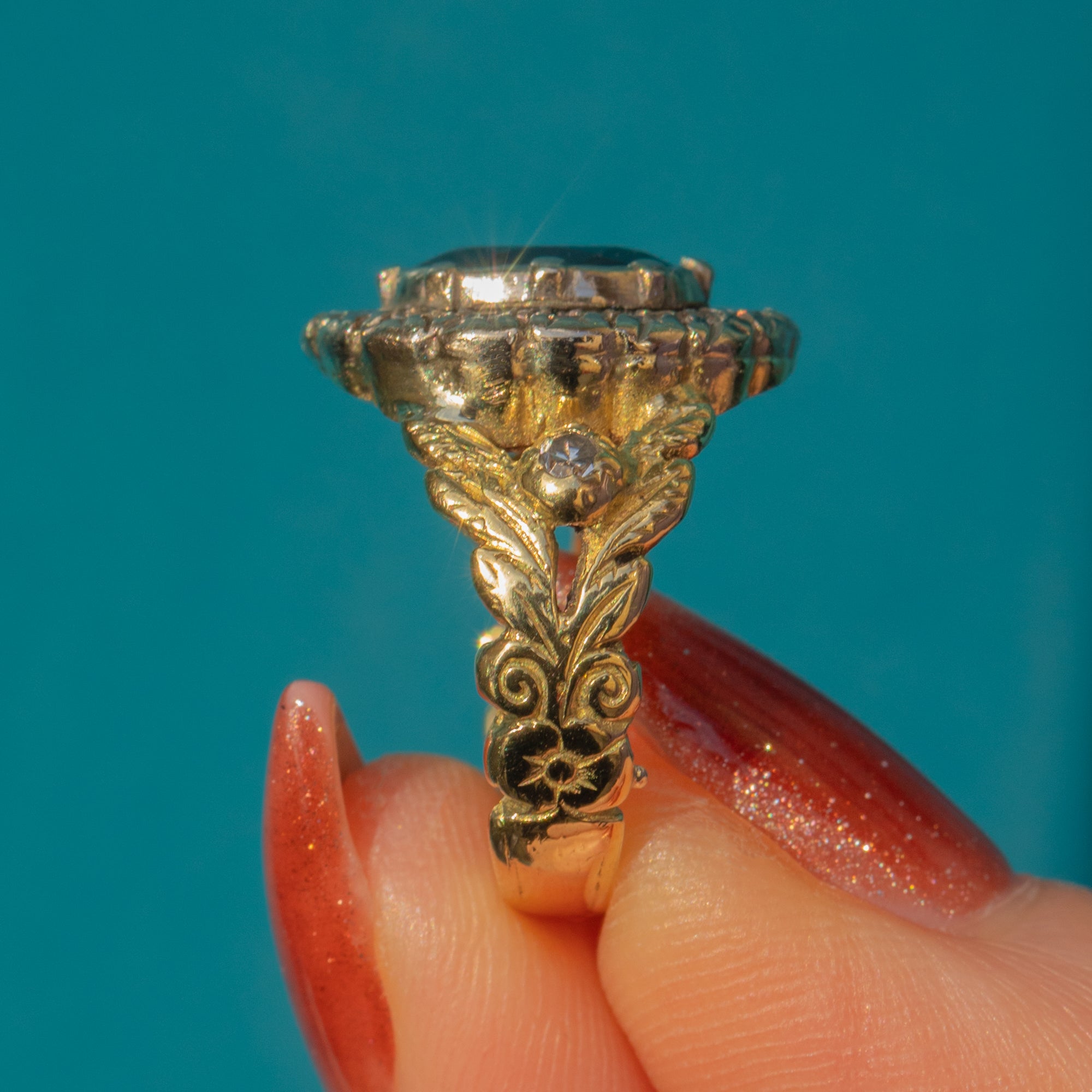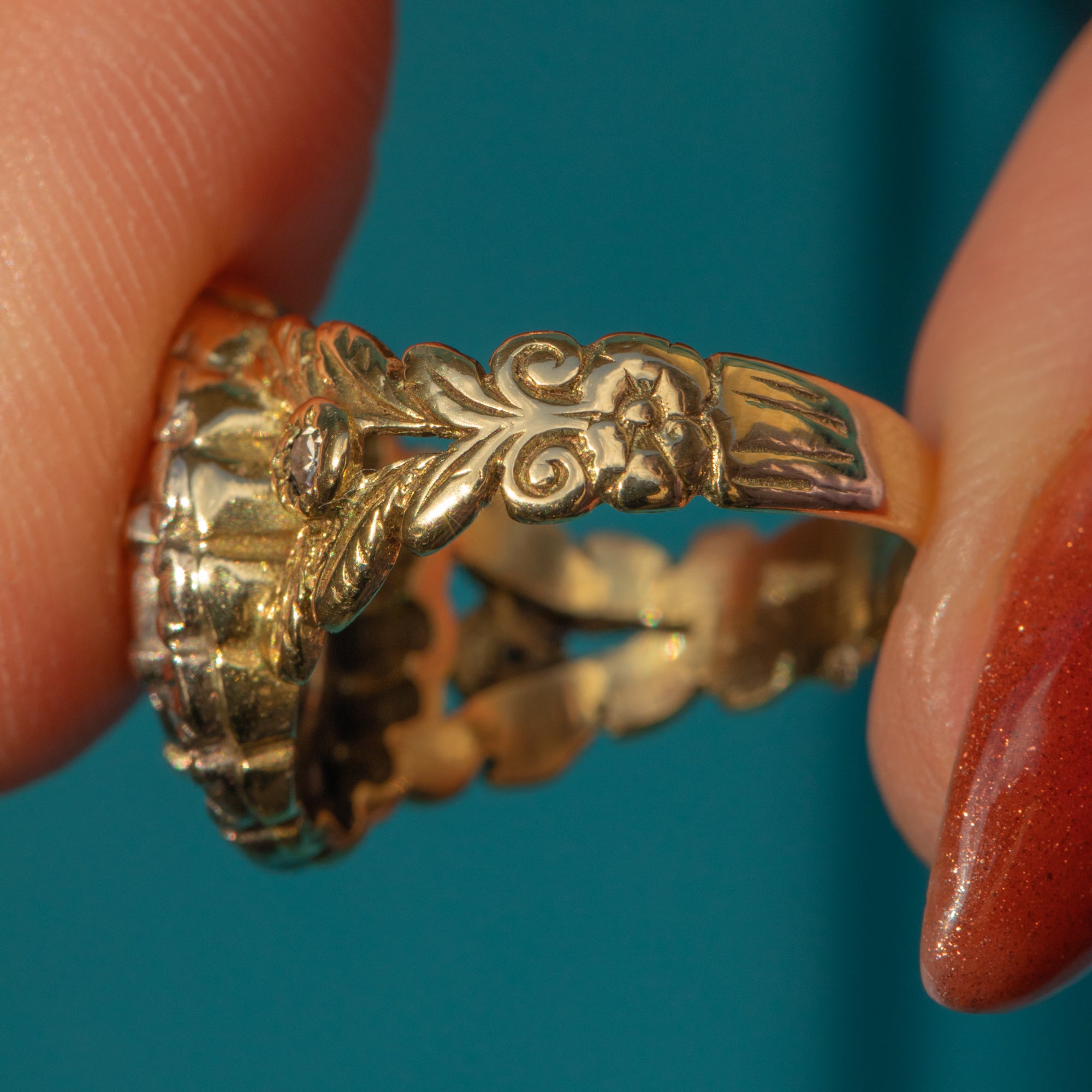 This regal Victorian ring is flanked by the most beautiful shoulders, delicately engraved with floral and foliate motifs. She is complete with a beautiful Diamond resting on each shoulder, effortlessly complemented by the warmth of the 18ct Gold band.