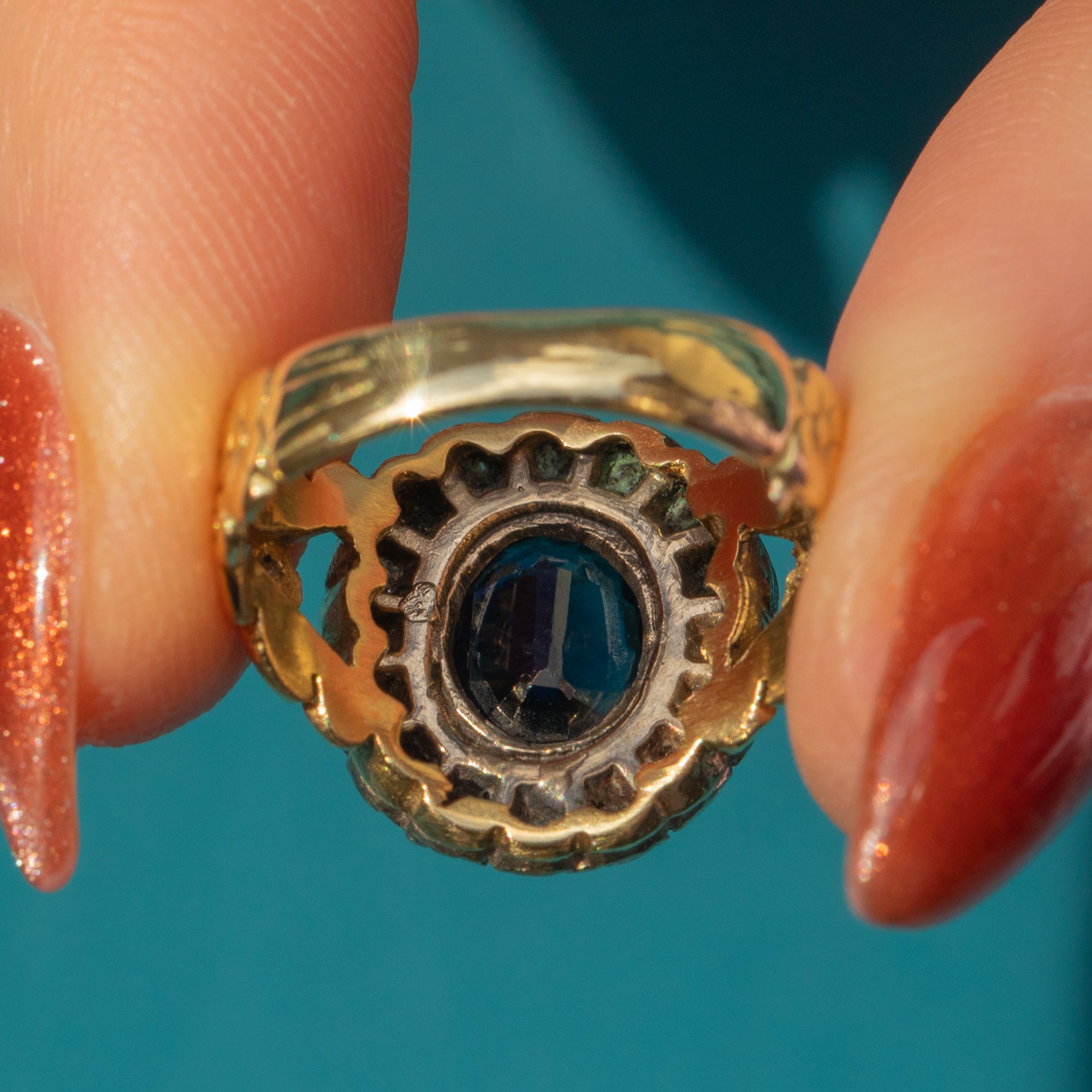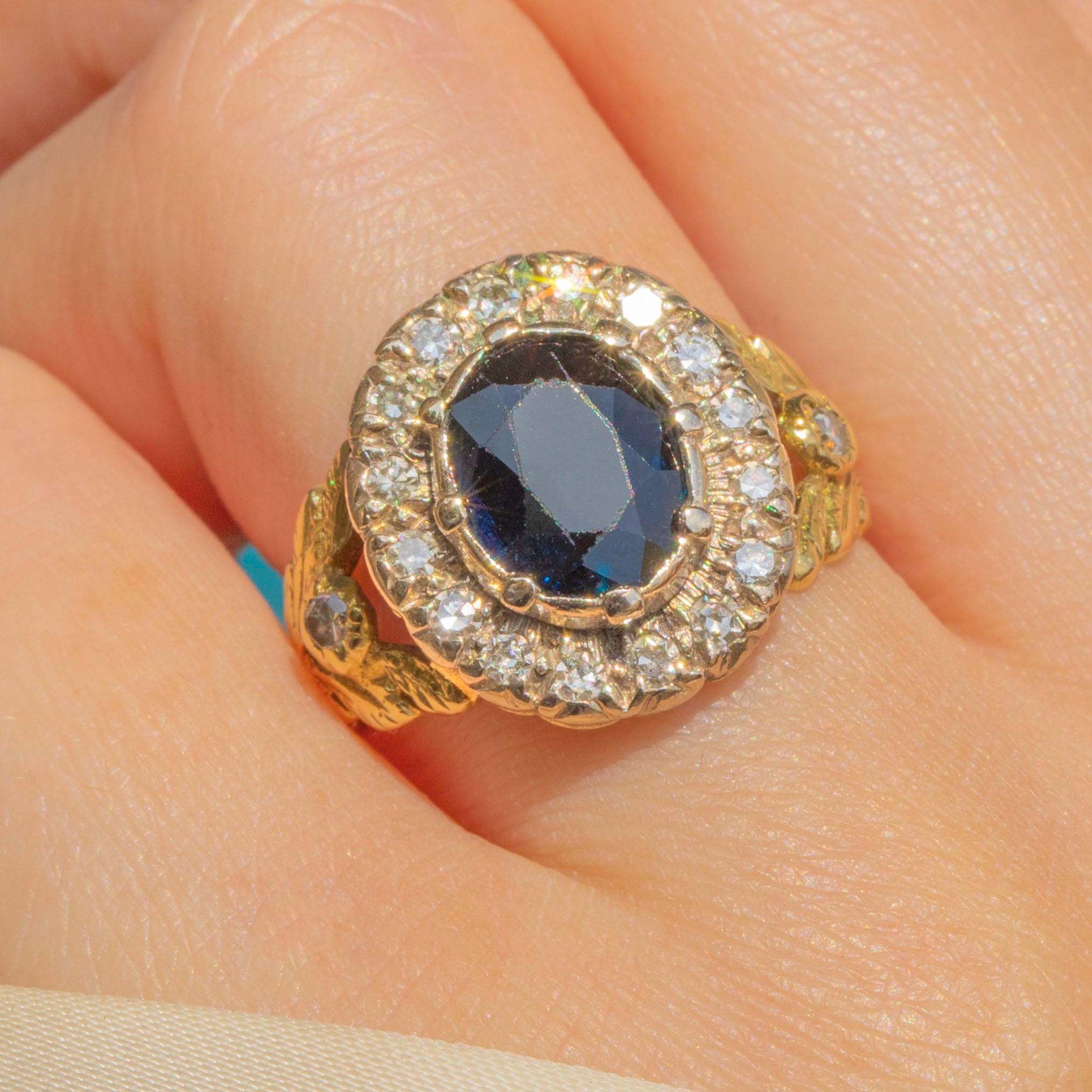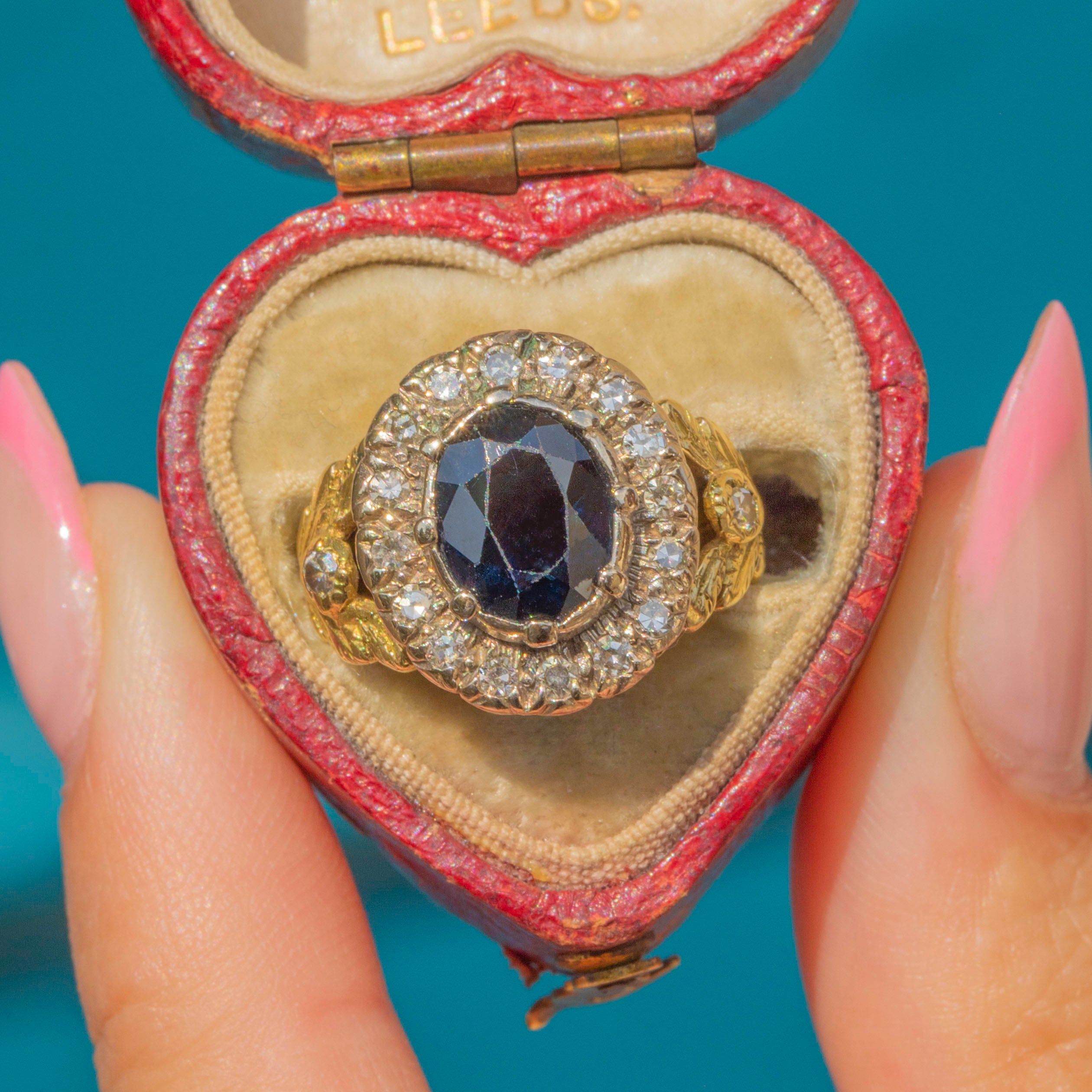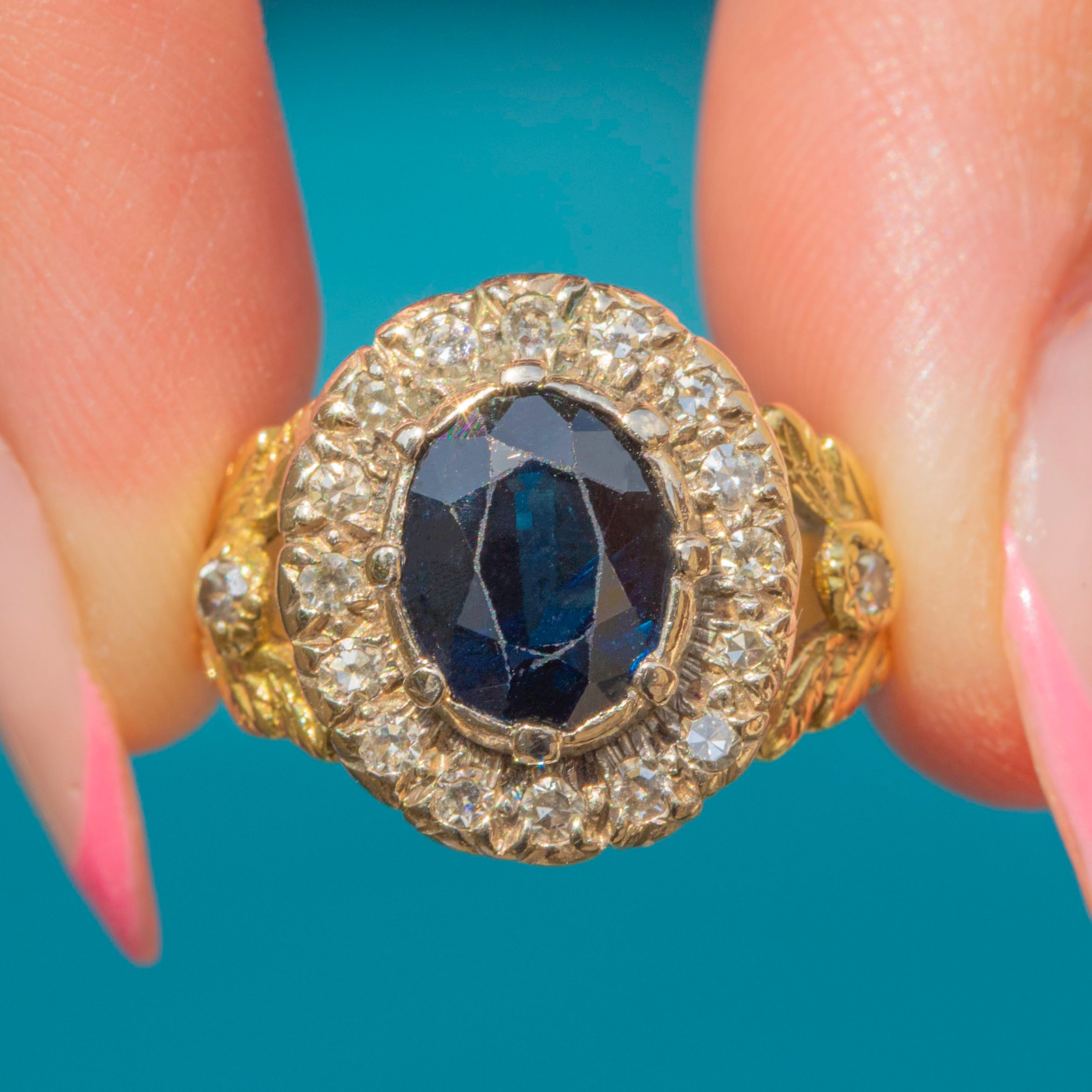 This antique 18ct Gold Sapphire Diamond cluster ring is a sight to behold!