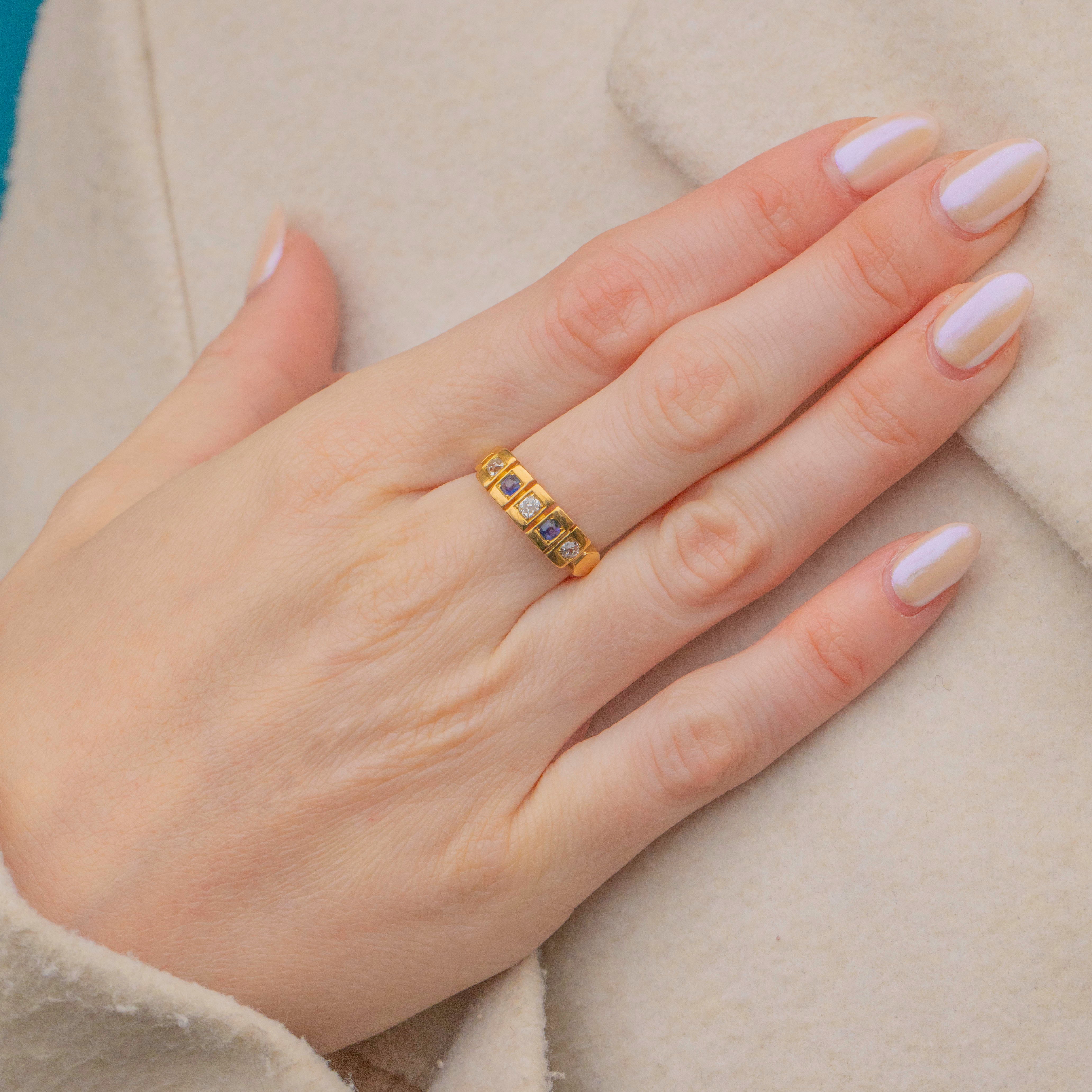 This antique 18ct Gold Sapphire Diamond five stone gypsy ring has a bold design and a low profile making it perfect for everyday wear! Crafted from solid 18ct Gold with a sumptuously saturated hue, this Victorian ring is studded with scintillation Diamonds and midnight blue Sapphires and provides wonderful finger coverage.