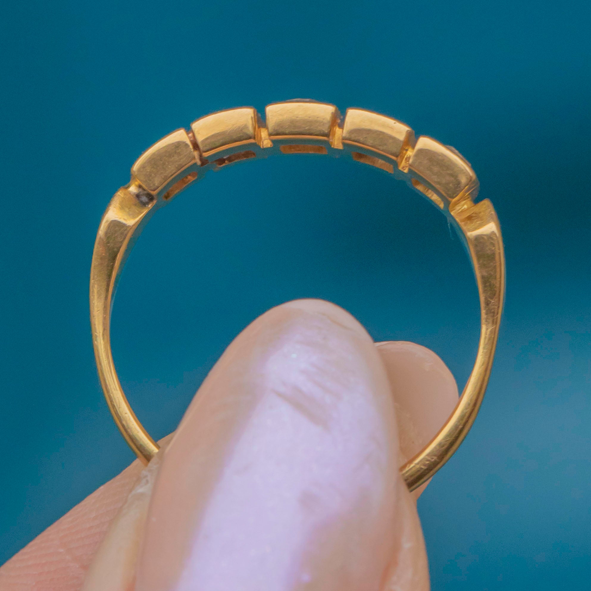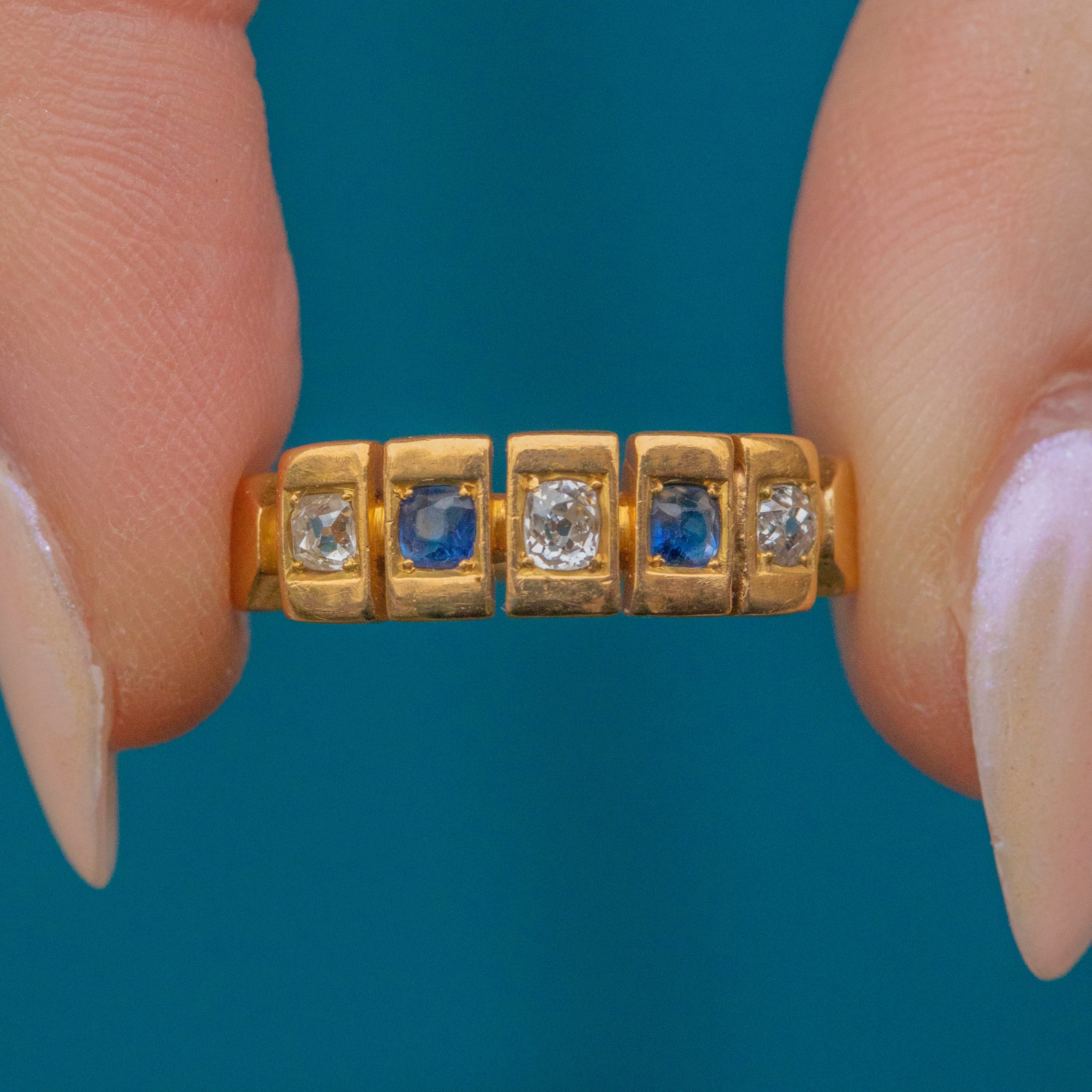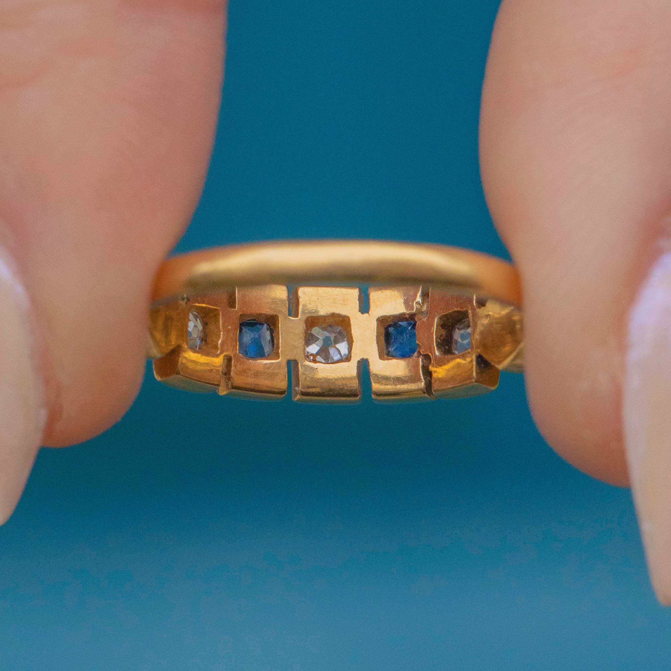 EXCELLENT. This antique 18ct Gold Sapphire Diamond five stone gypsy is in excellent condition. The Gold is brightly saturated and besides some minor age-related wear, is robust and comfortable to wear. The Diamonds and Sapphires are securely set and free from surface wear. With plenty of wear potential, this antique Gold gypsy ring will make a wonderful addition to your collection!