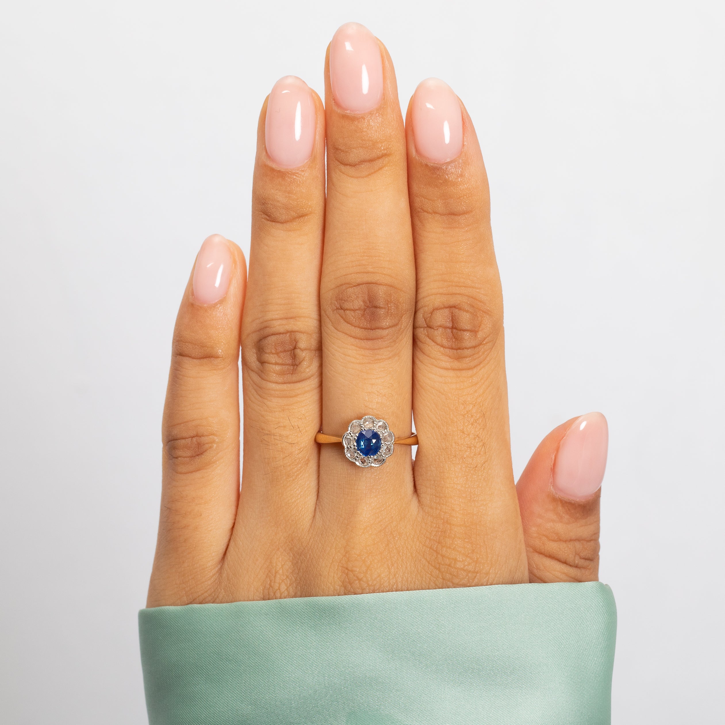 VERY GOOD. This antique 18ct Gold Sapphire Diamond flower cluster ring is in very good condition overall. The Sapphire is a beautiful blue hue, and the Diamonds possess just the right amount of sparkle to complement the Sapphire beautifully. There is a resize mark on the back of the band on close inspection, but it is smooth and remains comfortable to wear. All of the gemstones are securely set and are free from any chips or fleabites. This is a gorgeous ring ready to be adored for years to come!