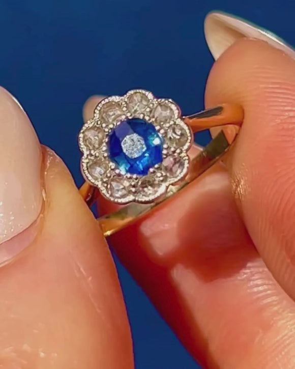 A classic antique 18ct Gold Sapphire Diamond flower cluster ring to adorn your finger. This gorgeous piece boasts a rich blue Sapphire, weighing approximately 0.30ct, haloed by a scintillating assortment of rose-cut Diamonds!