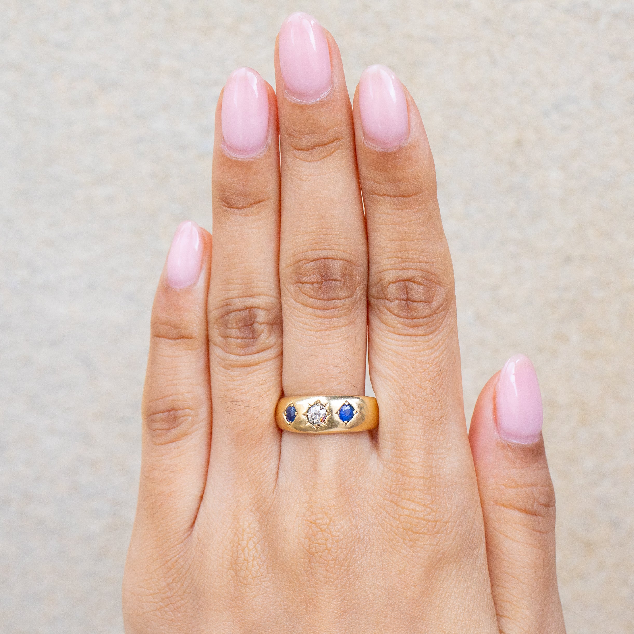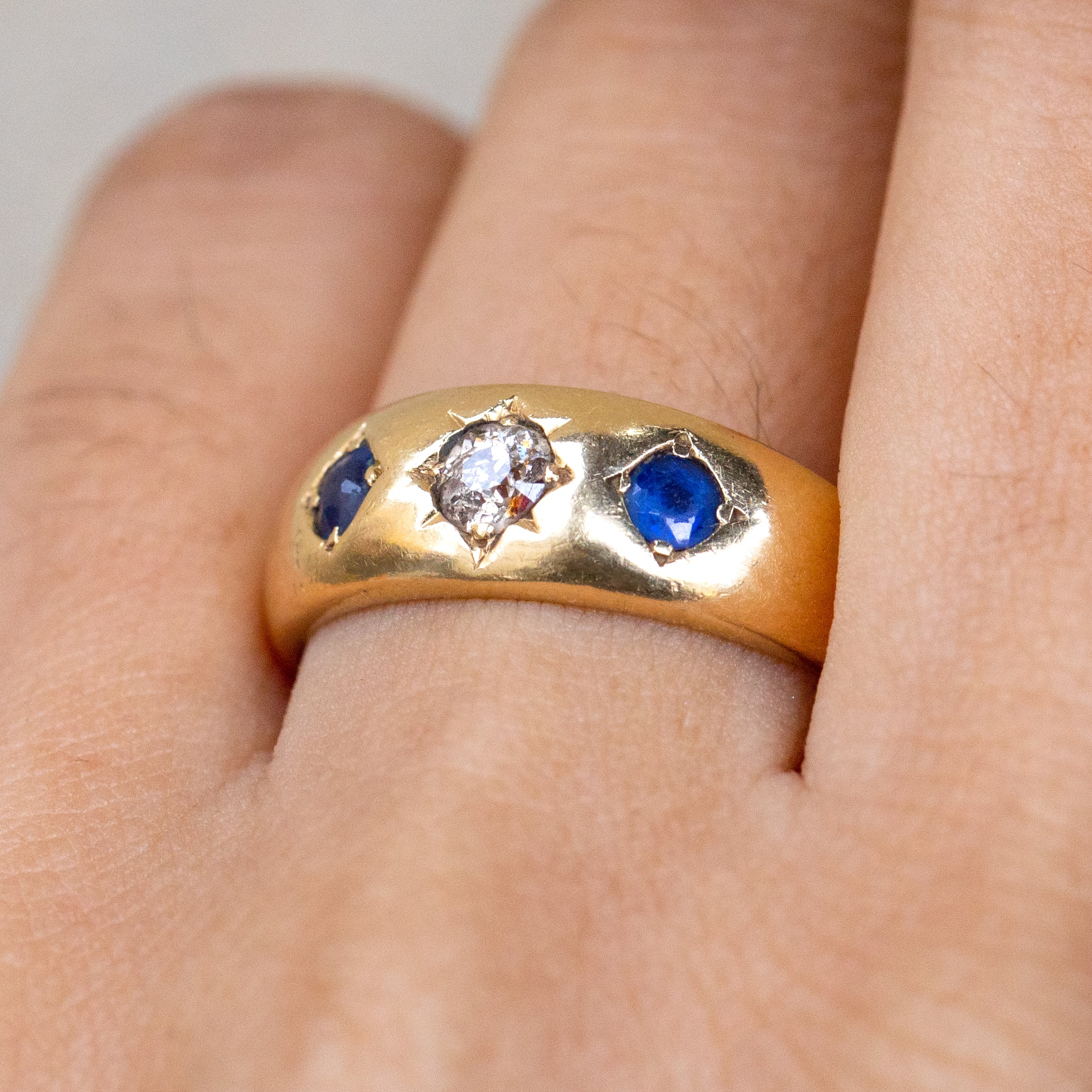 Like a scene from a midnight sky, this antique 18ct Gold Sapphire Diamond gypsy ring will fulfil all your celestial dreams! A scintillating Old-Mine cut Diamond is positioned at her centre flanked by two unmissable Sapphires, exuding royal blue tones from each hand-cut facet.