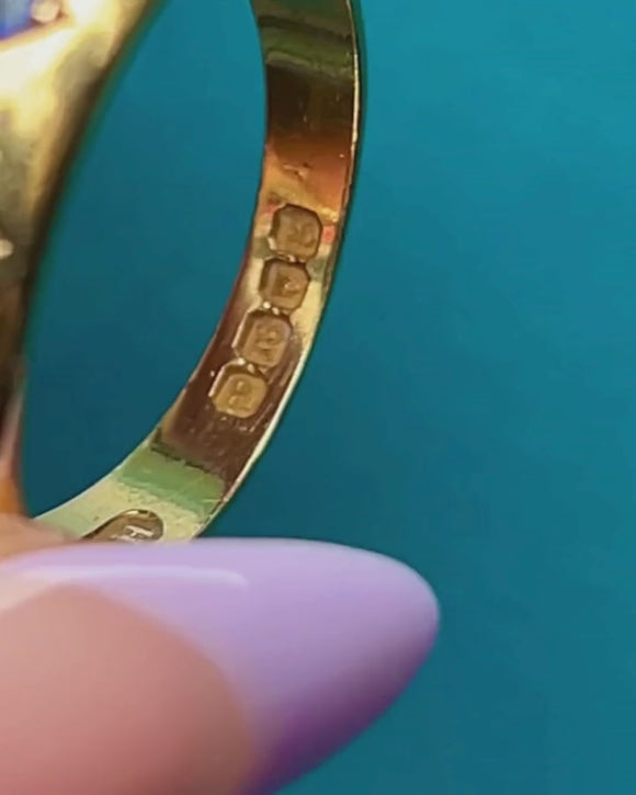 HALLMARKS: 'LH' Makers mark, Crown, '18', Leopard's Head, Date letter 'g' for the year 1902 inside band.
