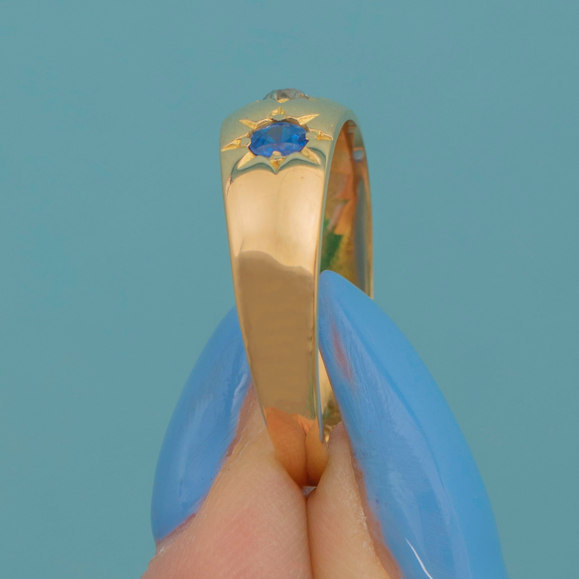 VERY GOOD-EXCELLENT. This antique 18ct Gold Sapphire Diamond gypsy ring is in wonderful condition. The Gold is saturated throughout and the band has retained its form well, with only some very minor age-related wear. The gemstones are all free from any chips or fleabites, each one securely nestled within its flush setting. Complete with a full set of antique hallmarks, this early 20th-century ring will make a fine addition to your collection!