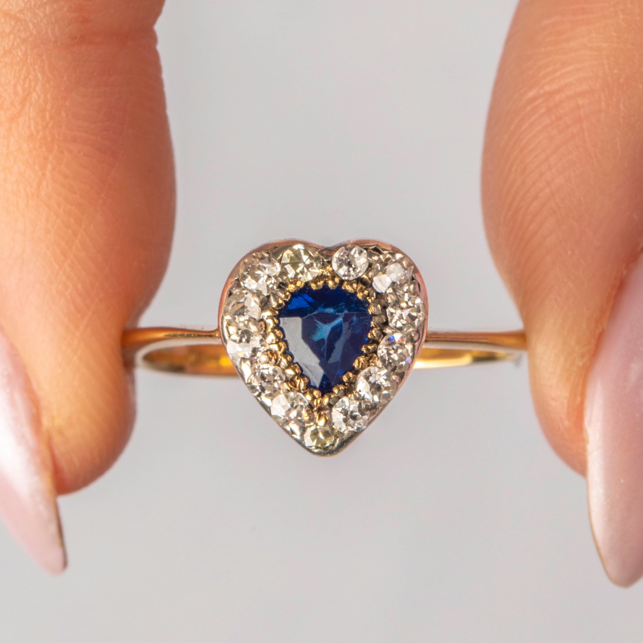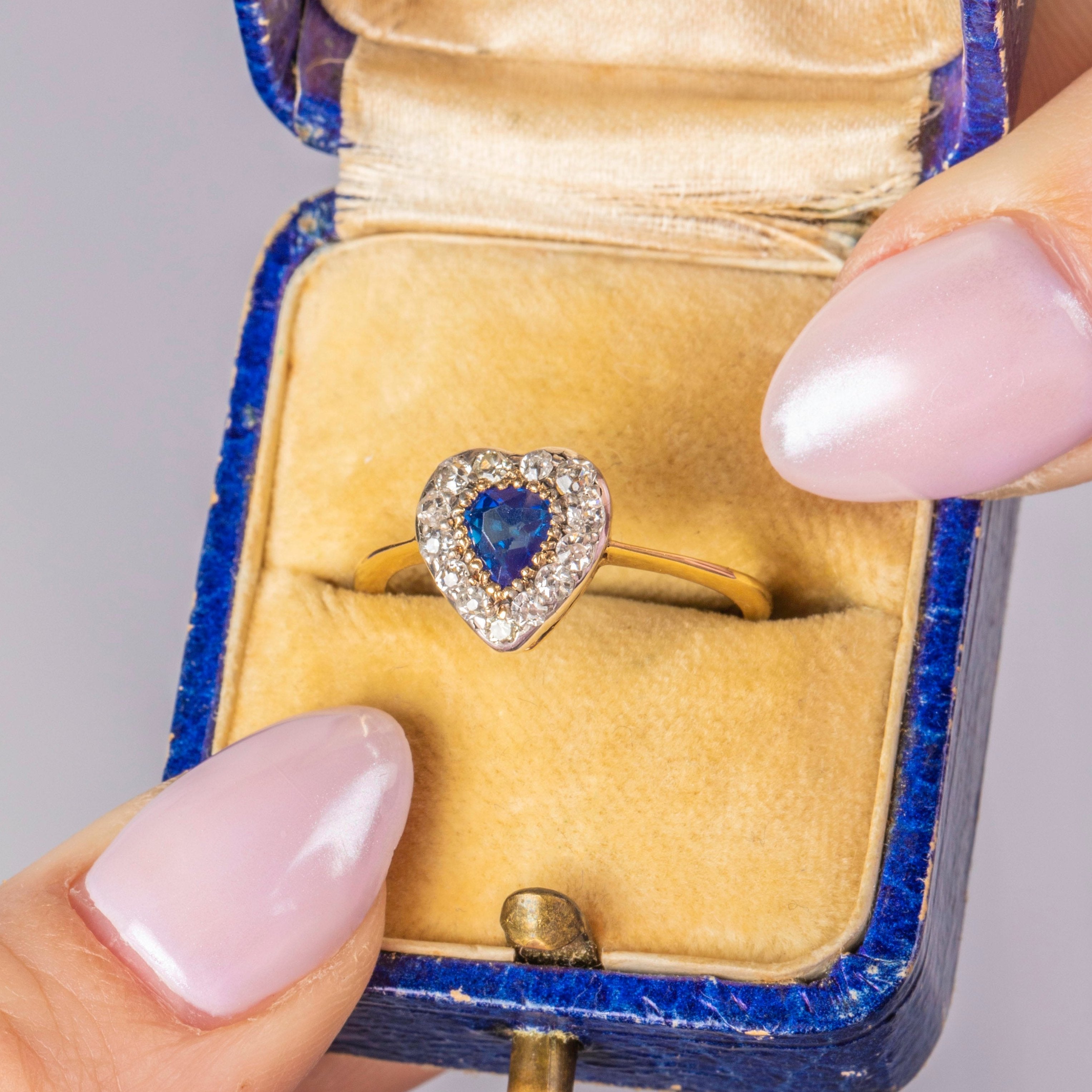 This antique 18ct Gold Sapphire Diamond heart ring looks as though she has been plucked from a fairytale! Glistening from afar, you can't help but fall weak at the knees for her romantic heart form, inlaid with a midnight blue 0.30ct Sapphire at the centre, haloed by scintillating Diamonds.