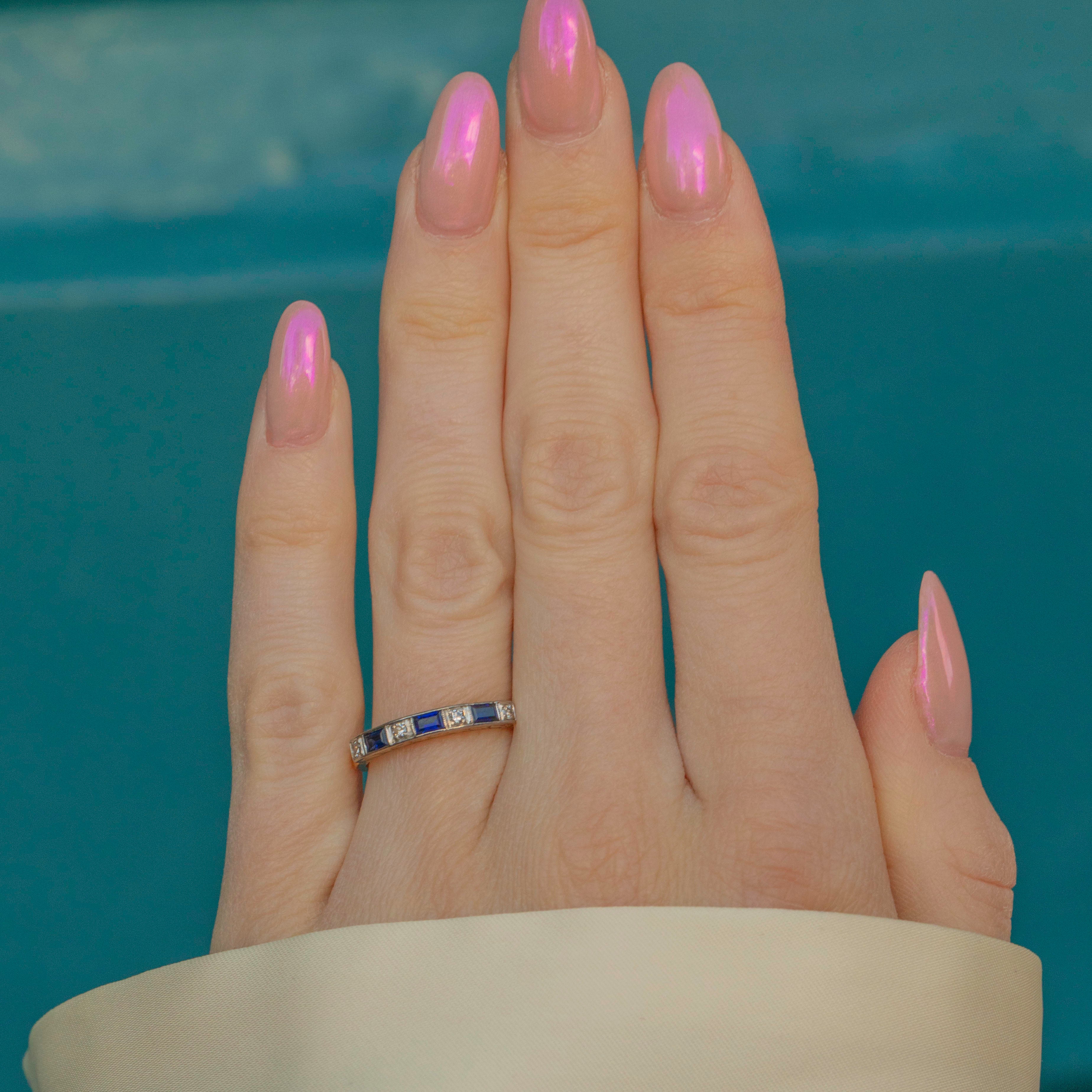 The combination of alternating Sapphires and the Diamonds truly reflect the luxury and glamour of the era. The deep ocean blue Sapphires add depth and mystery, while the Diamonds create that never-ending sparkle that's just to die for!