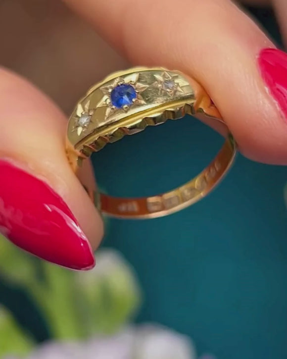 Antique 18ct Gold Sapphire Diamond Star-Set Gypsy Ring