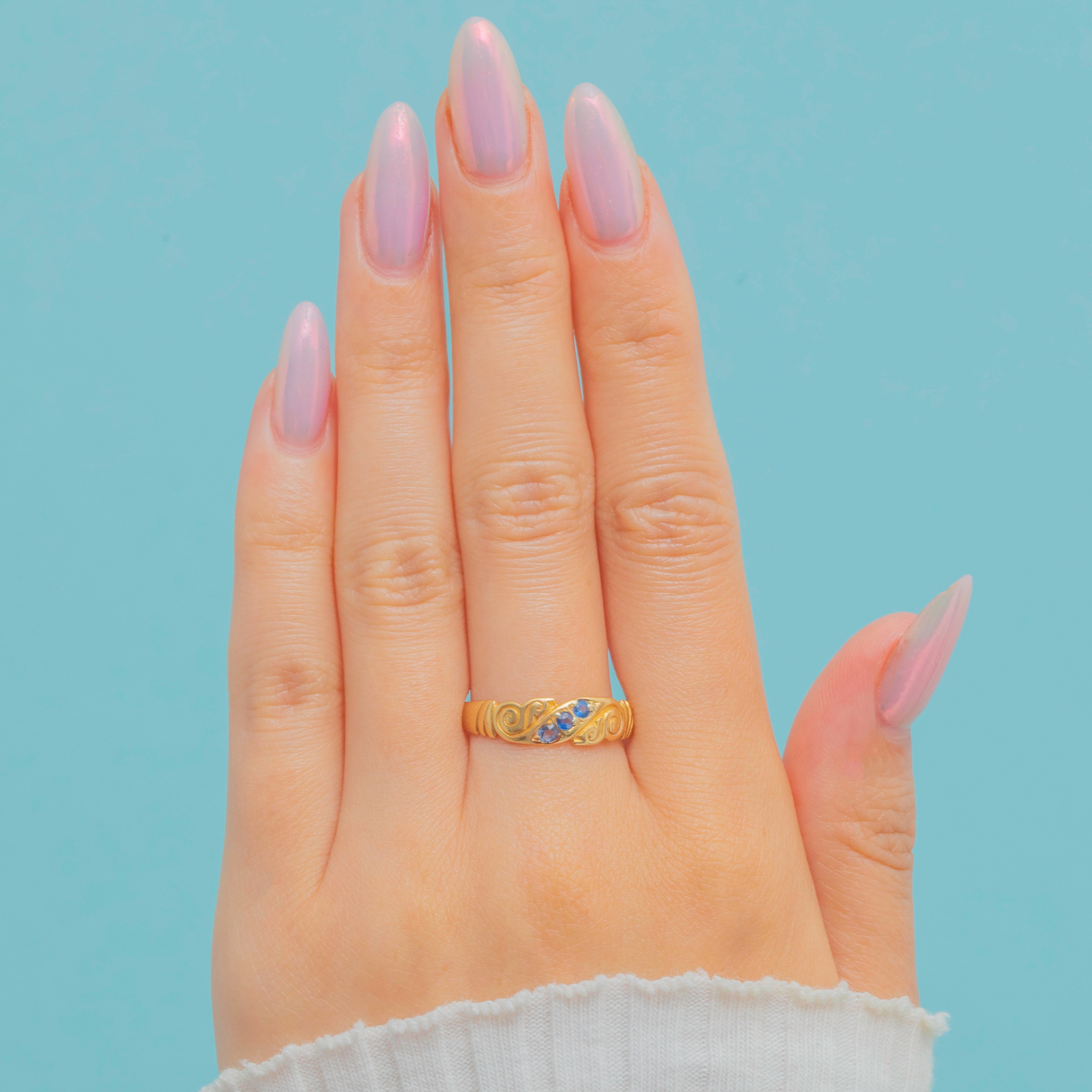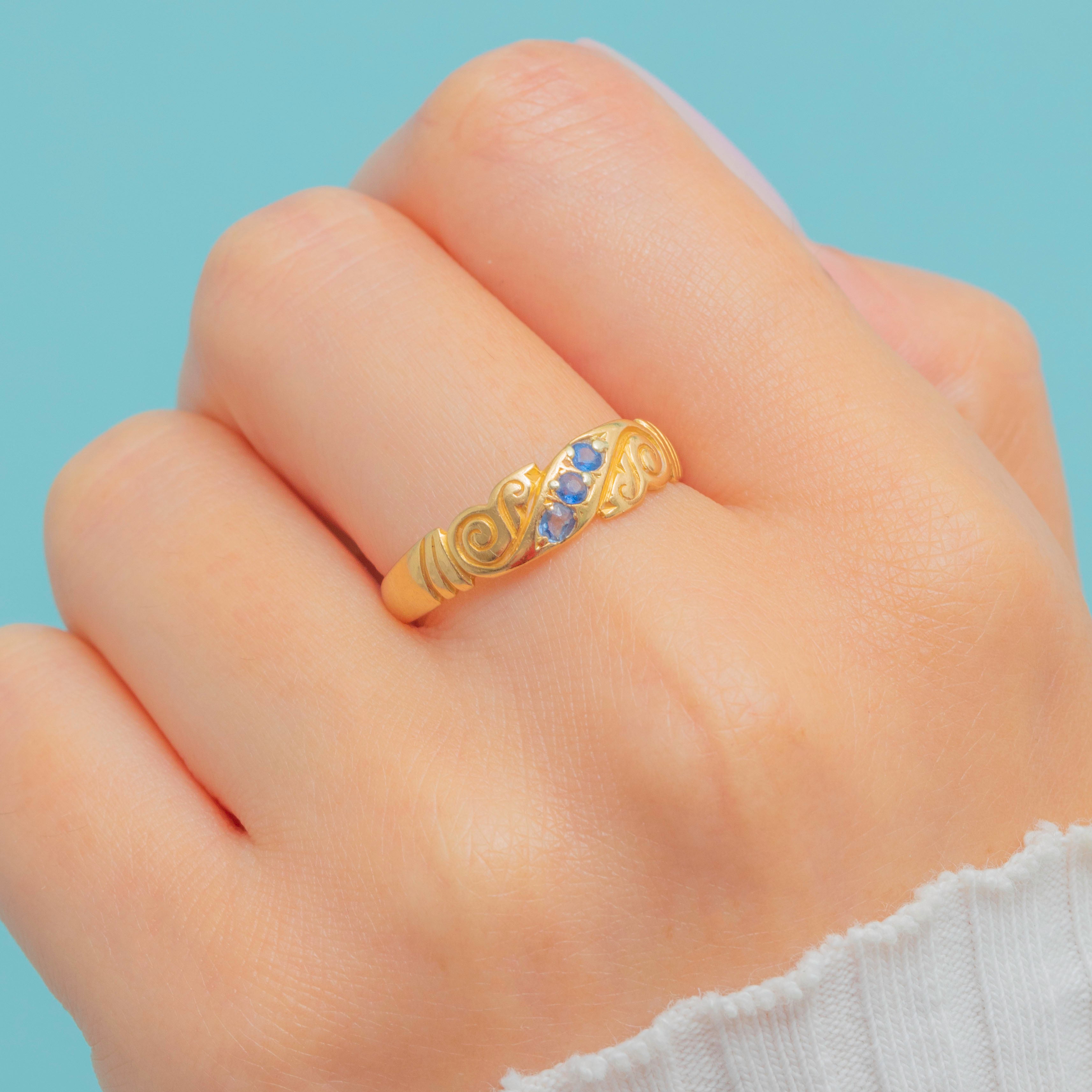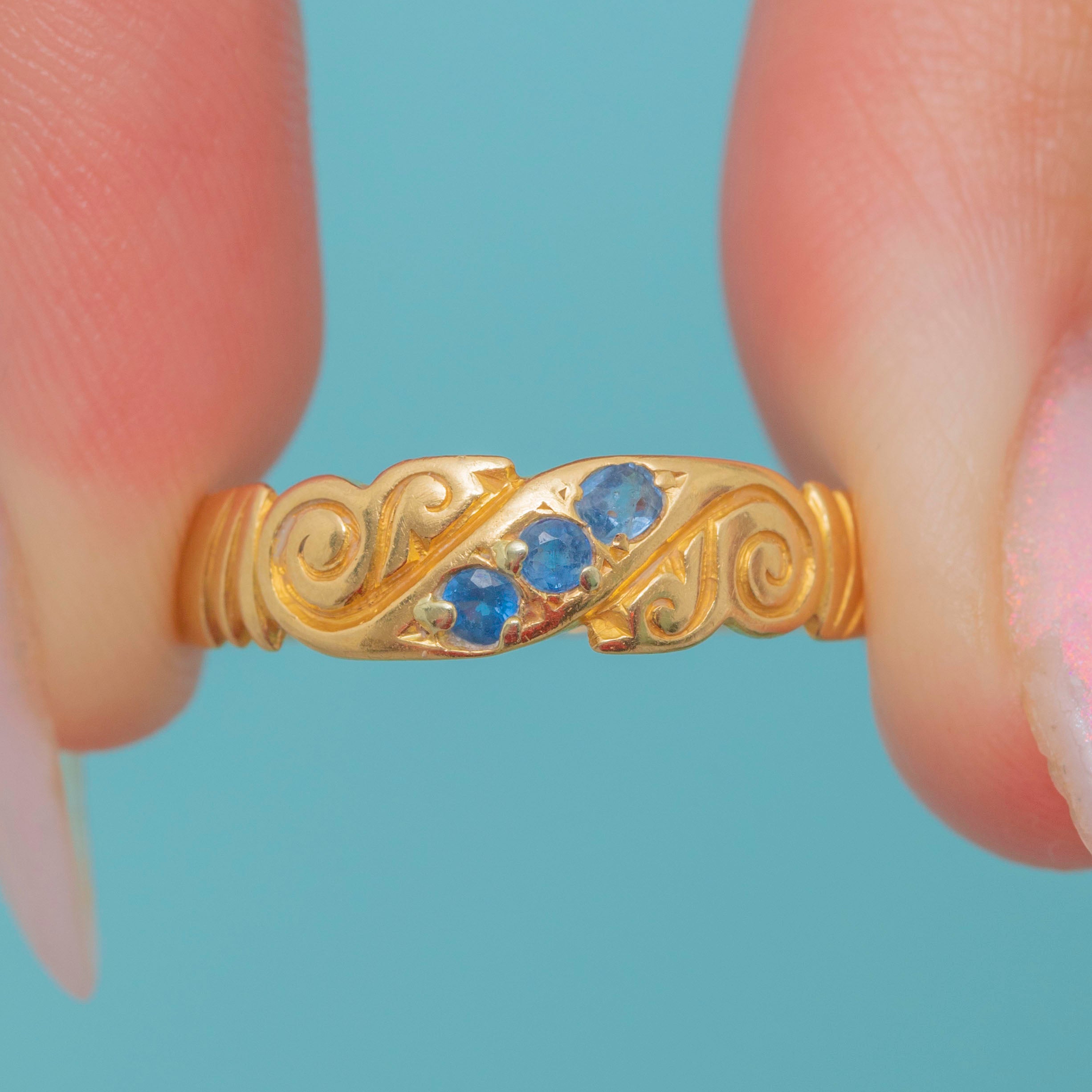 Centred by a trio of light blue Sapphires, this gypsy ring features ornate swirl engravings across the front of her band, perfectly capturing the designs of the Victorian era. Gypsy rings are a wonderful option for stacking and with the smooth band providing a comfortable wear, this antique 18ct Gold ring is sure to become your newest staple piece!