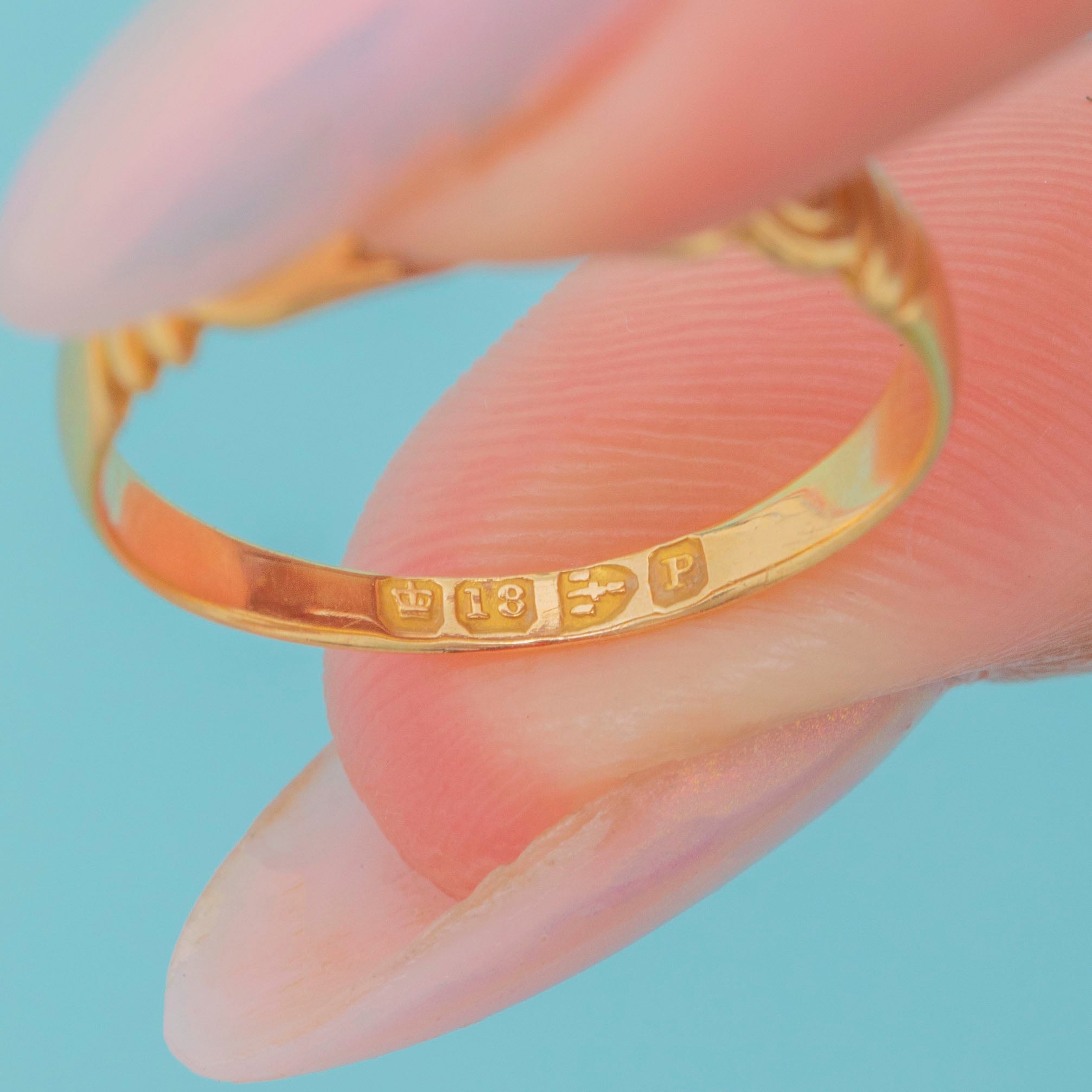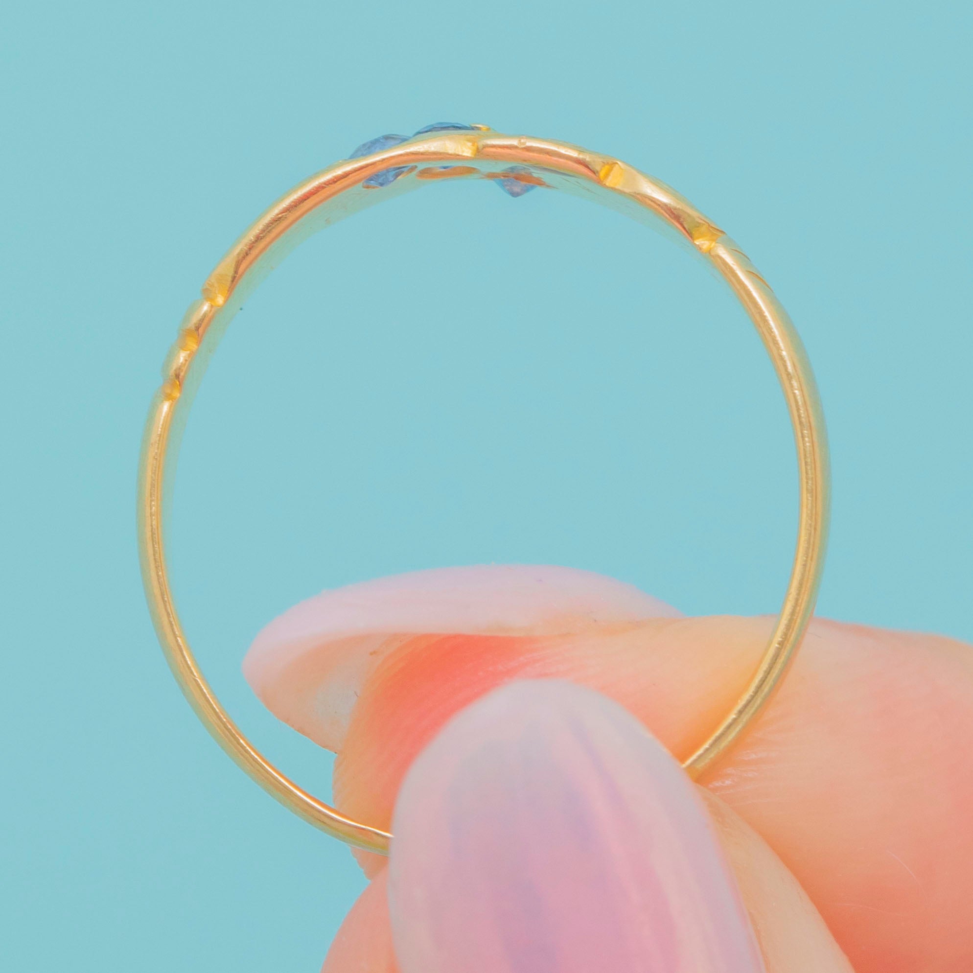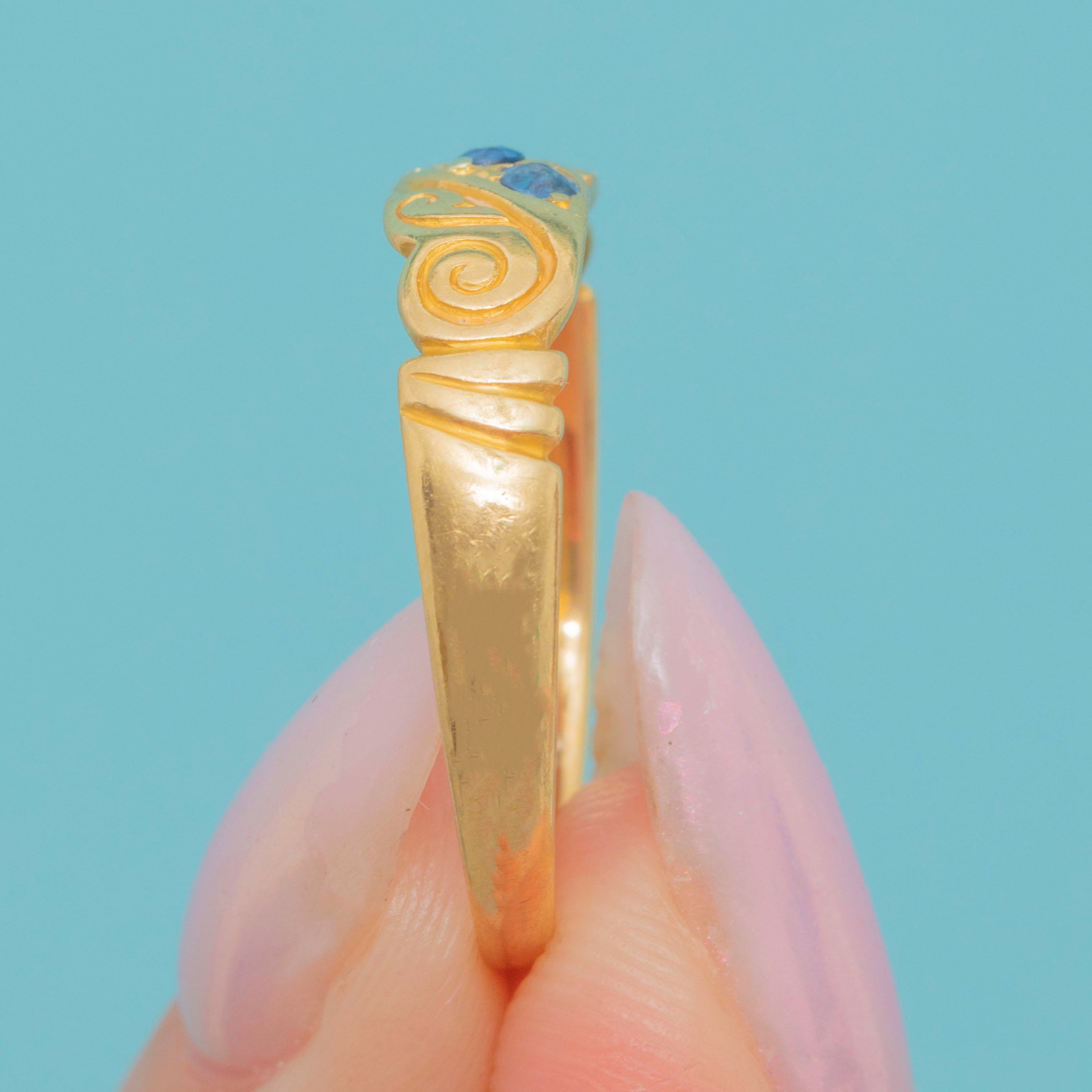 Centred by a trio of light blue Sapphires, this gypsy ring features ornate swirl engravings across the front of her band, perfectly capturing the designs of the Victorian era. Gypsy rings are a wonderful option for stacking and with the smooth band providing a comfortable wear, this antique 18ct Gold ring is sure to become your newest staple piece!