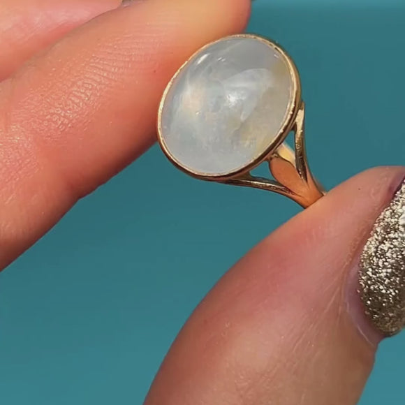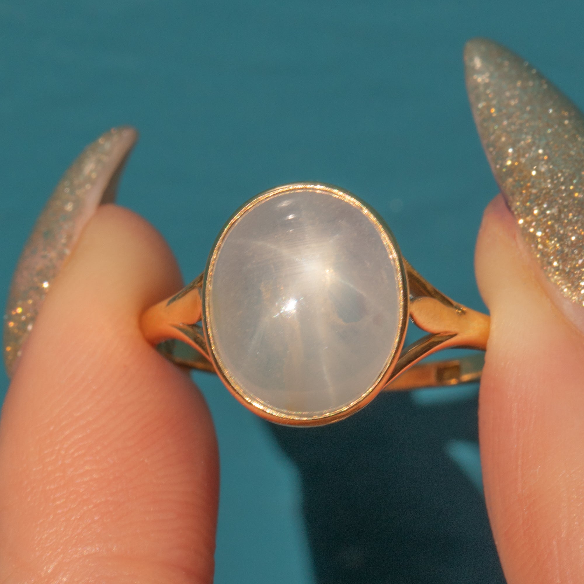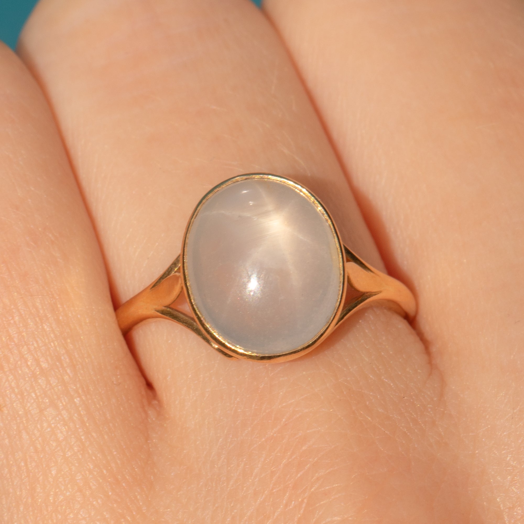 Add some celestial charm to your repertoire with this antique 18ct Gold star Sapphire ring! Homing a cloudy white 4.50ct Sapphire cabochon with sweet lilac overtones, as the light glides over her smooth cabochon cut a six point star reflects off of her surface, a testament to the wonders of mother nature.