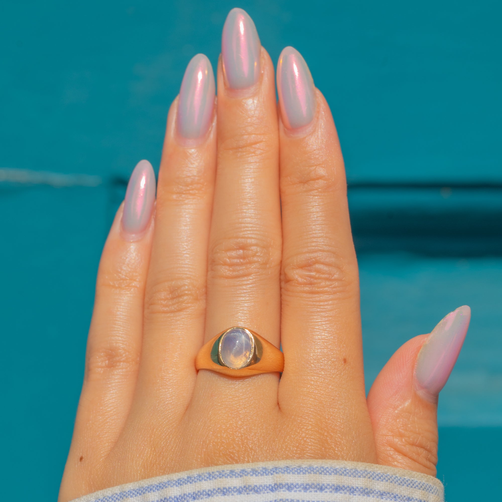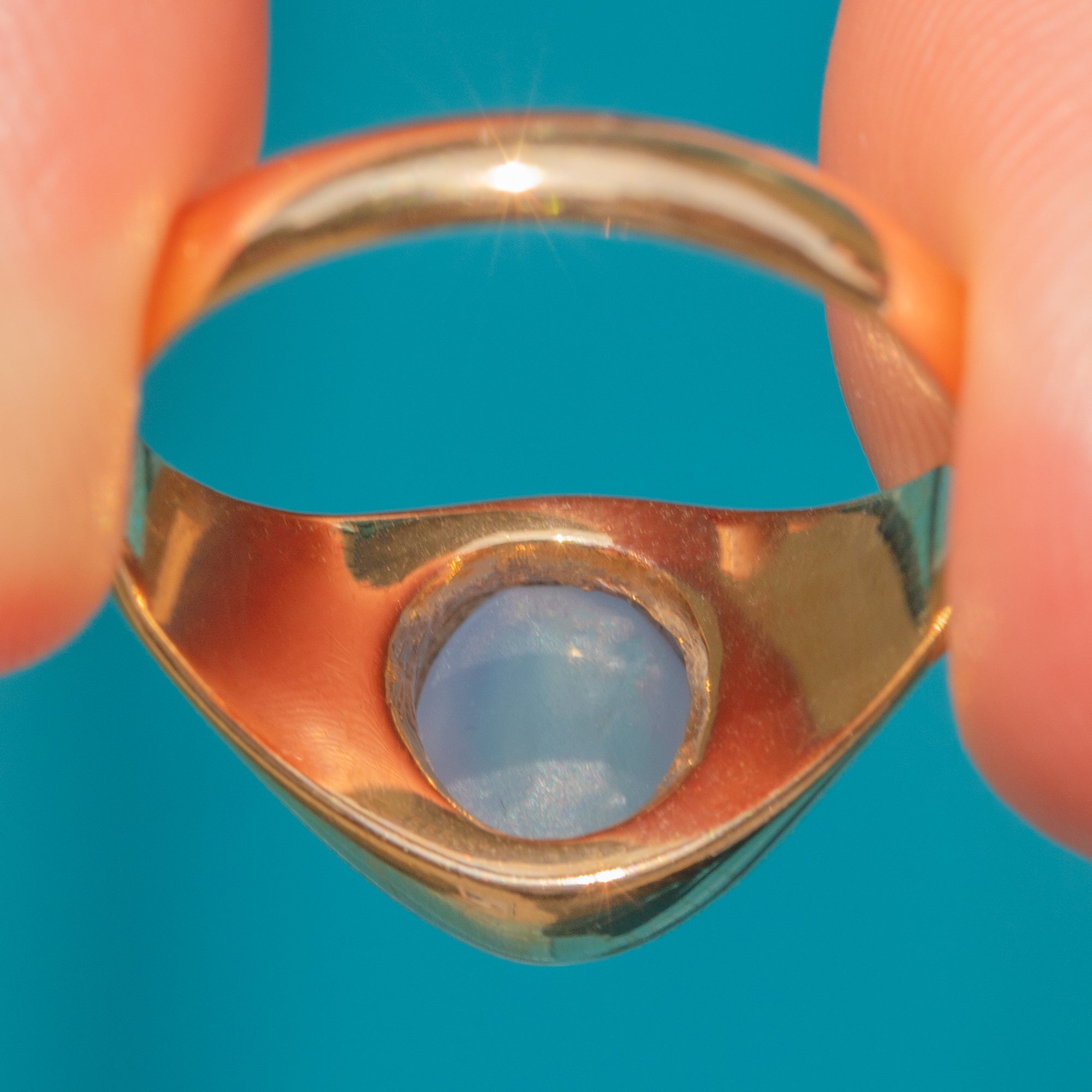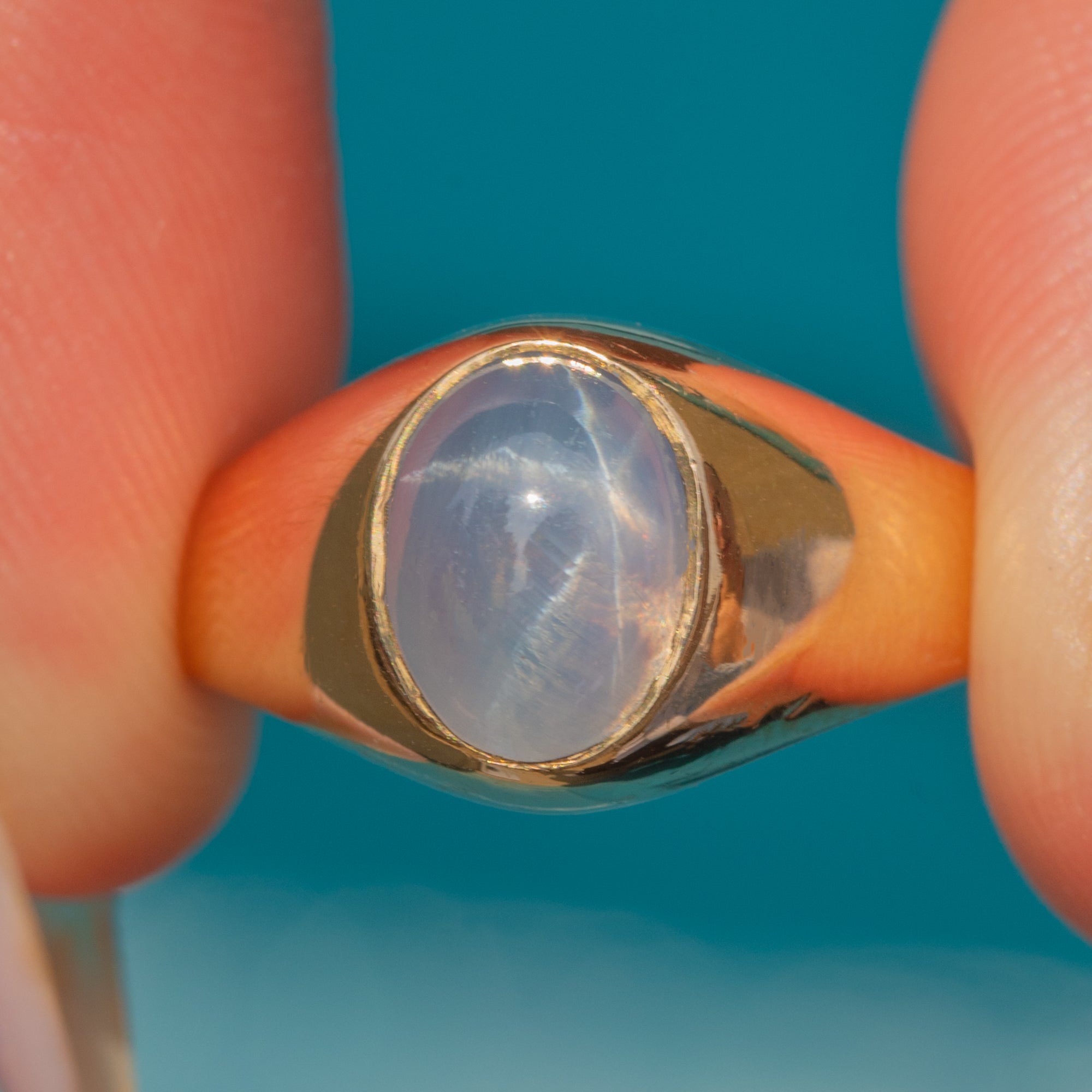 This chunky Victorian star Sapphire signet ring a spectacular piece! Presenting a 2.50ct galactic natural Star Sapphire cabochon, possessesing a pool of pastel tones and a glimmering star running across the surface beneath the light!