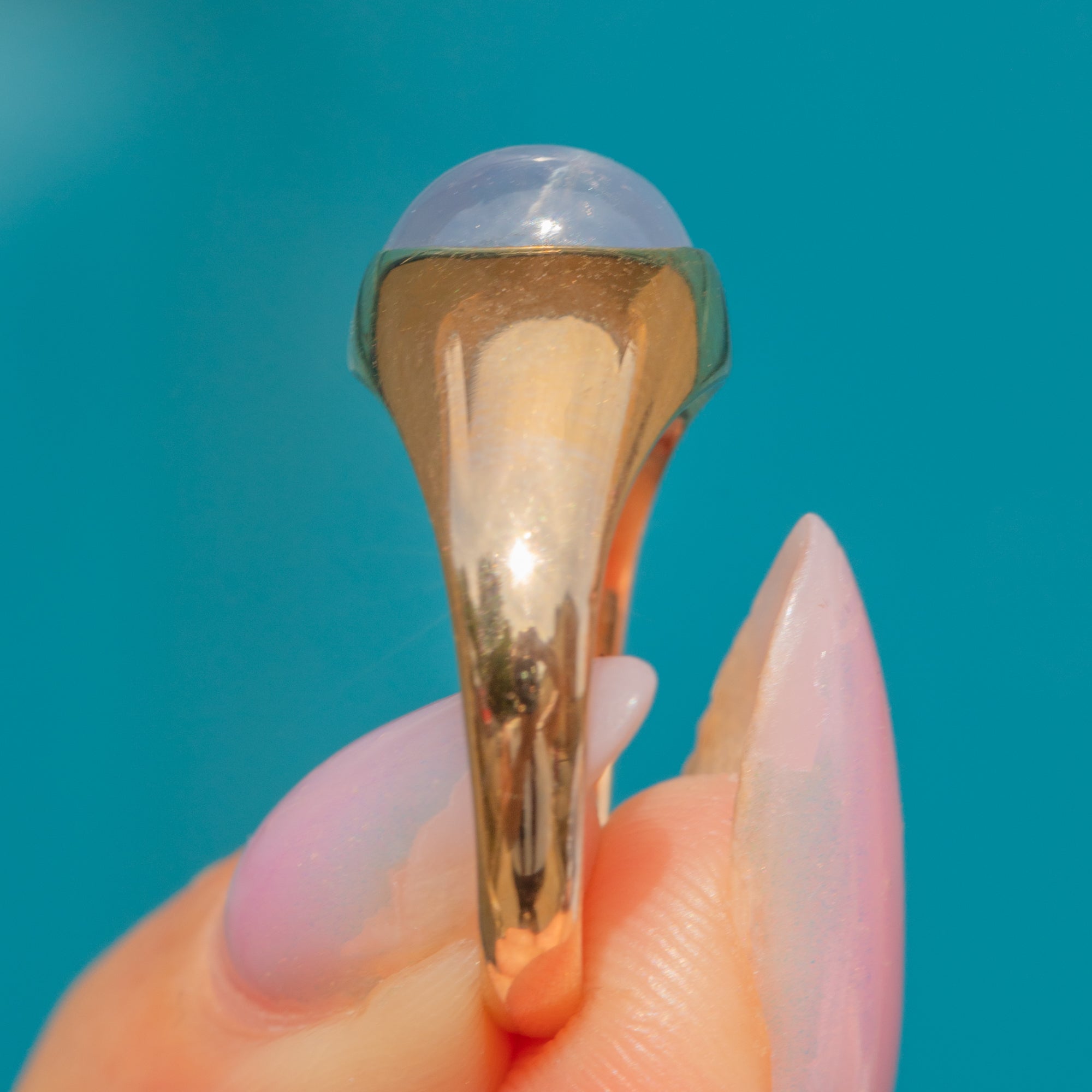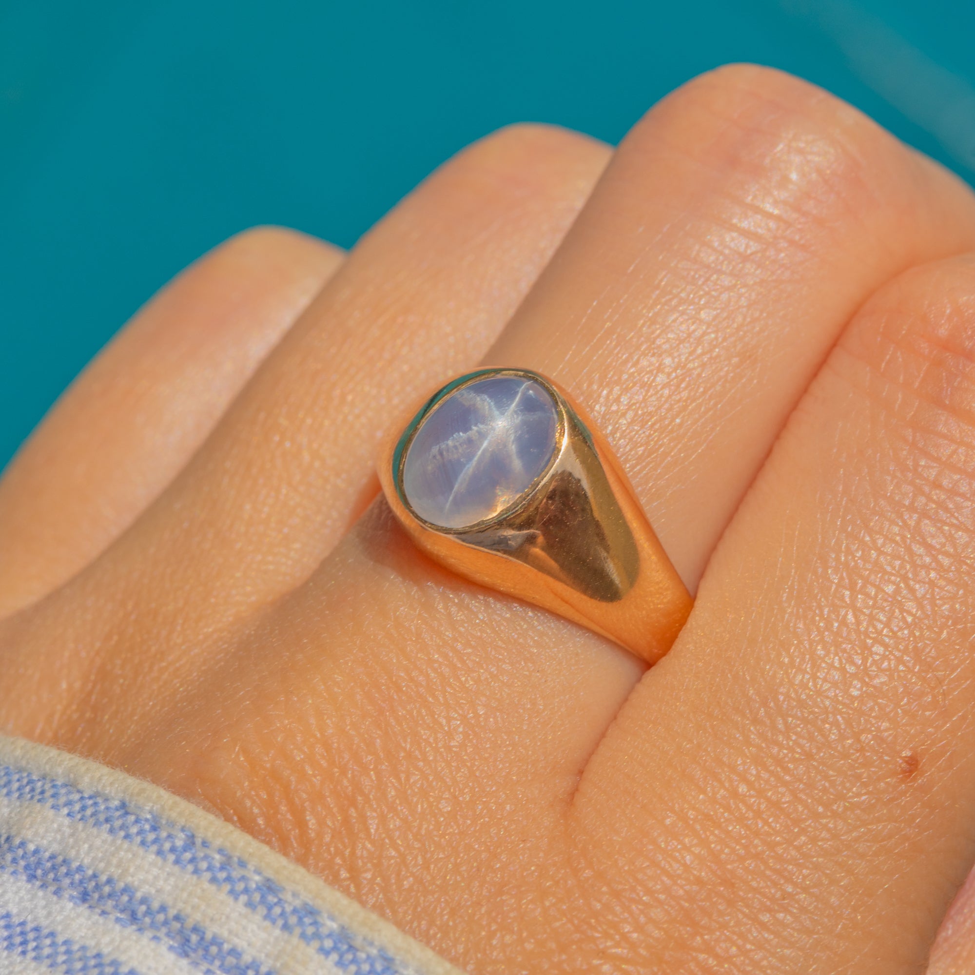 EXCELLENT: The natural Star Sapphire is radiant, with an undeniable celestial allure and glossy finish. There are some minor fleabites to the surface of the Sapphire, though this is difficult to spot without a loupe. The Gold is bright and buttery, providing a comfortable and confident wear.
