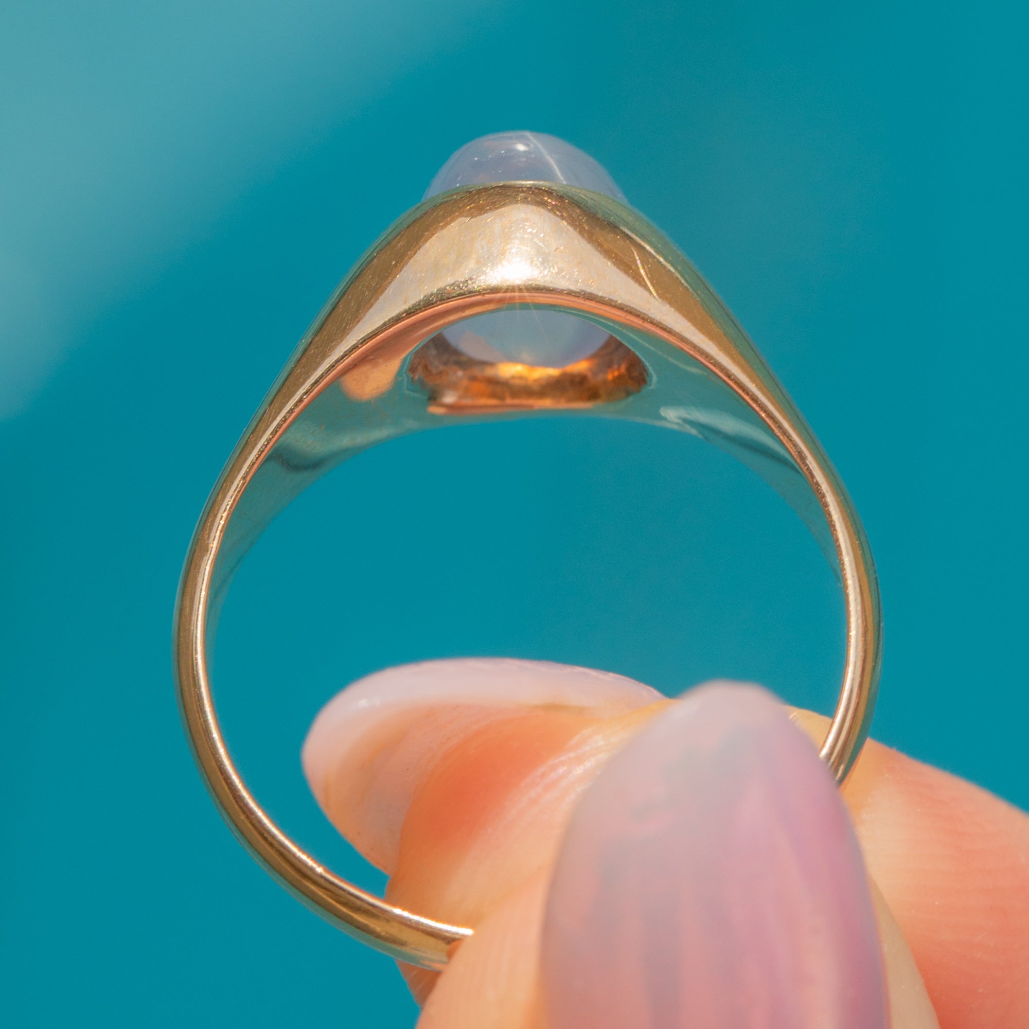 The 'star' effect visible in this gem, also known as asterism, is caused by light refracting off rutile silk inclusions, creating a magical star-like radiance. Crafted from buttery 18ct Gold, this Victorian signet ring has a gorgeous chunky form and is sure to bring celestial delight to your attire!