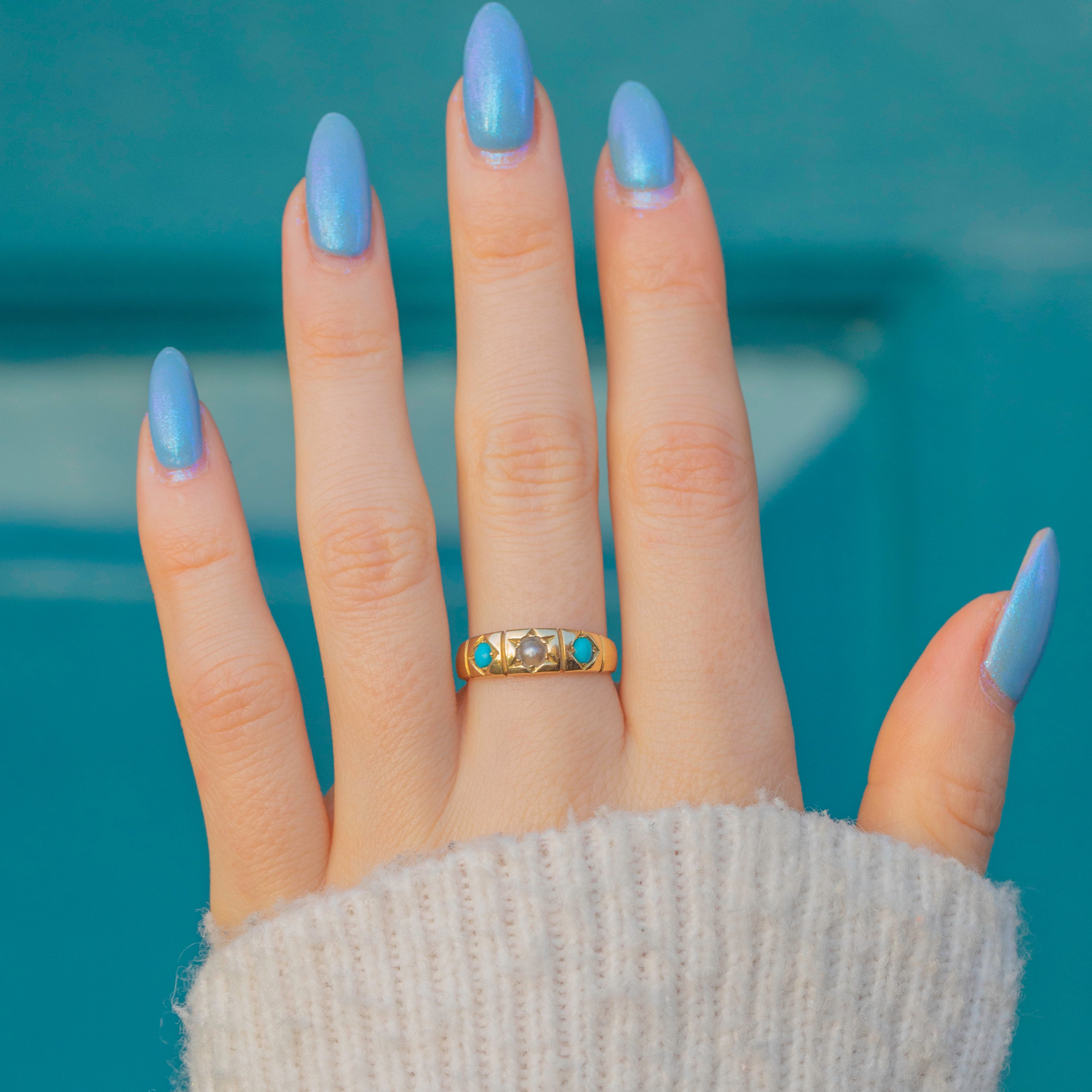 This Victorian ring displays a decadently luminous star-set white Pearl, flaked by two peacock blue Turquoise stones, complemented by the rich 18ct Gold! This antique gypsy ring will soon become a firm favourite of yours!
