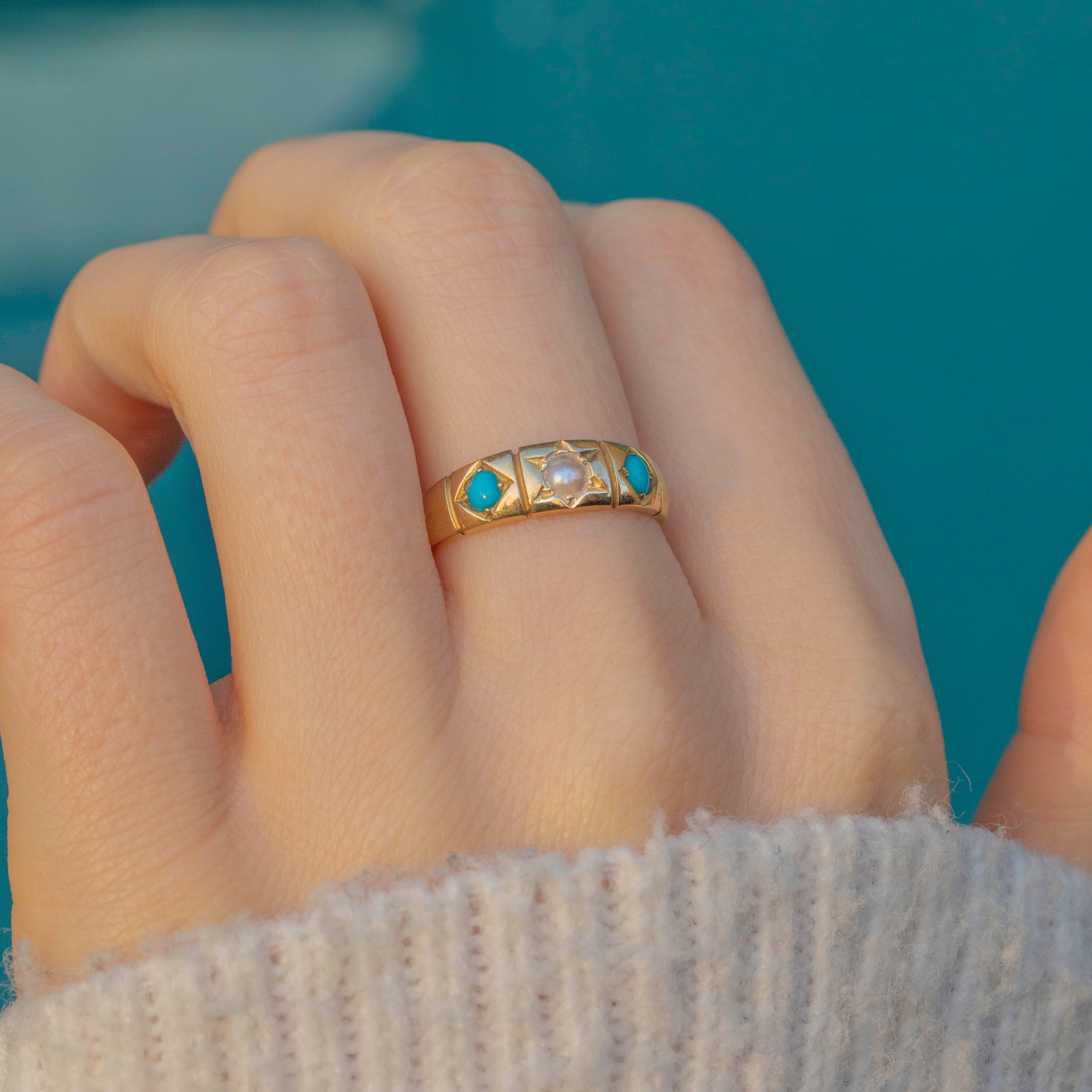 Antique 18ct Gold Turquoise Pearl Star-Set Ring