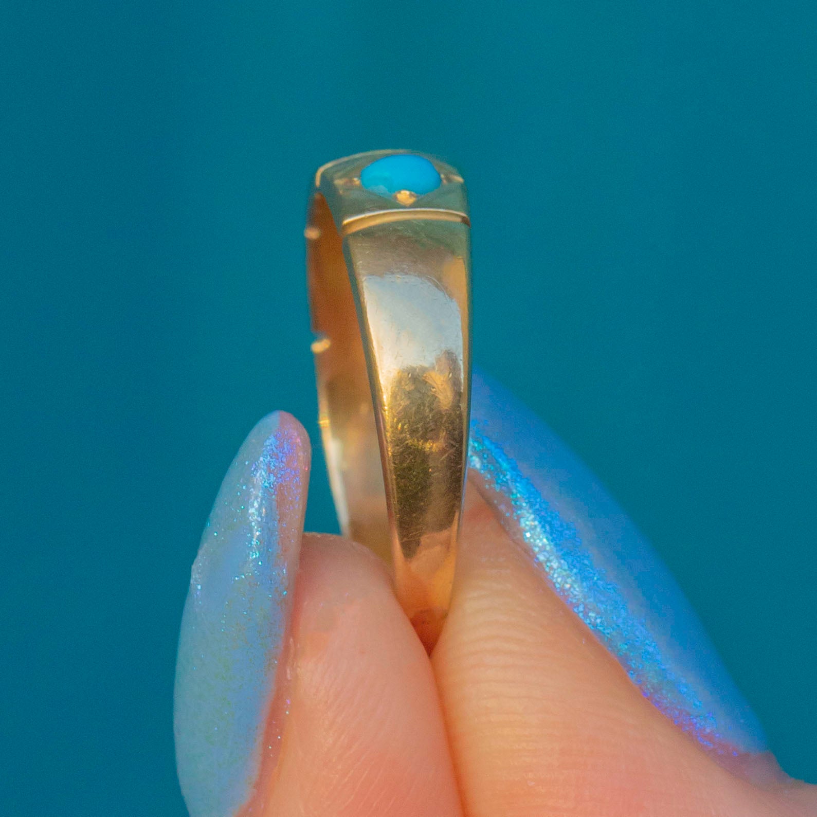 GOOD-VERY GOOD. This stunning antique 18ct Gold Turquoise Pearl star-set ring is in great condition, especially when considering its grand age! The stones are securely set and smooth to the touch, with only minimal wear commensurate with age. There is a small chip on one of the Turquoise stones and some gentle wear on the Pearl, which is noticeable under close inspection. A truly beautiful piece, perfect for any collector or lover of antique jewellery!