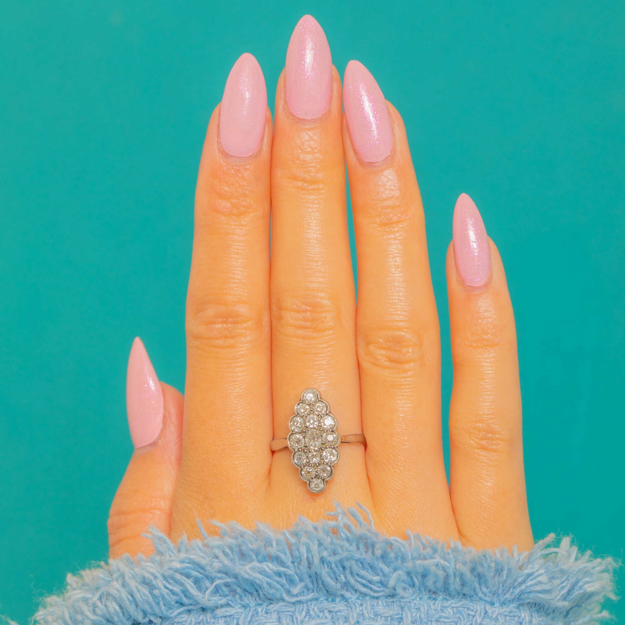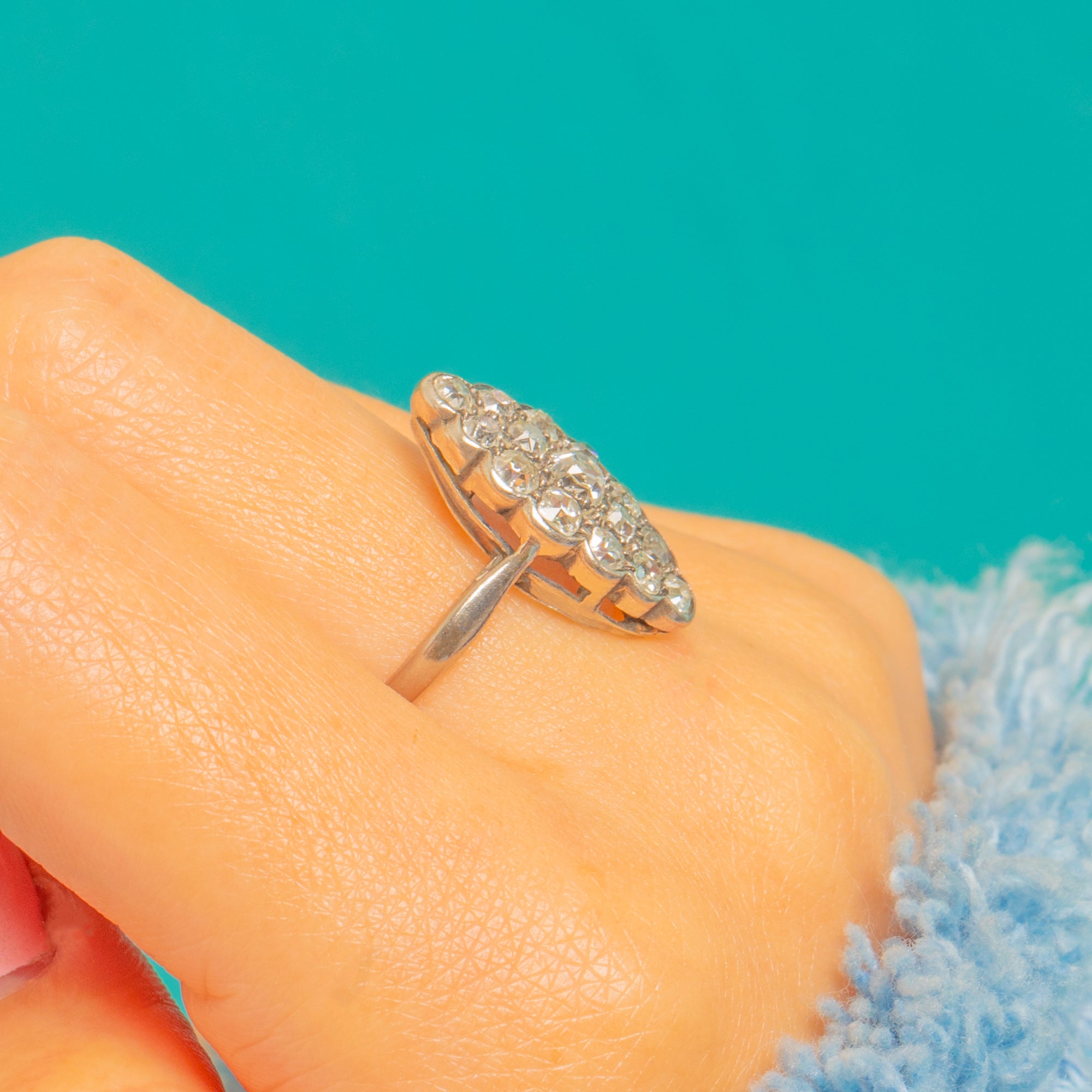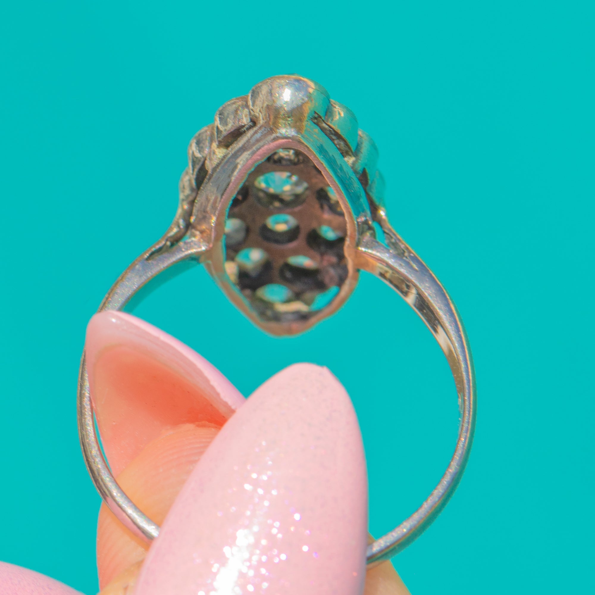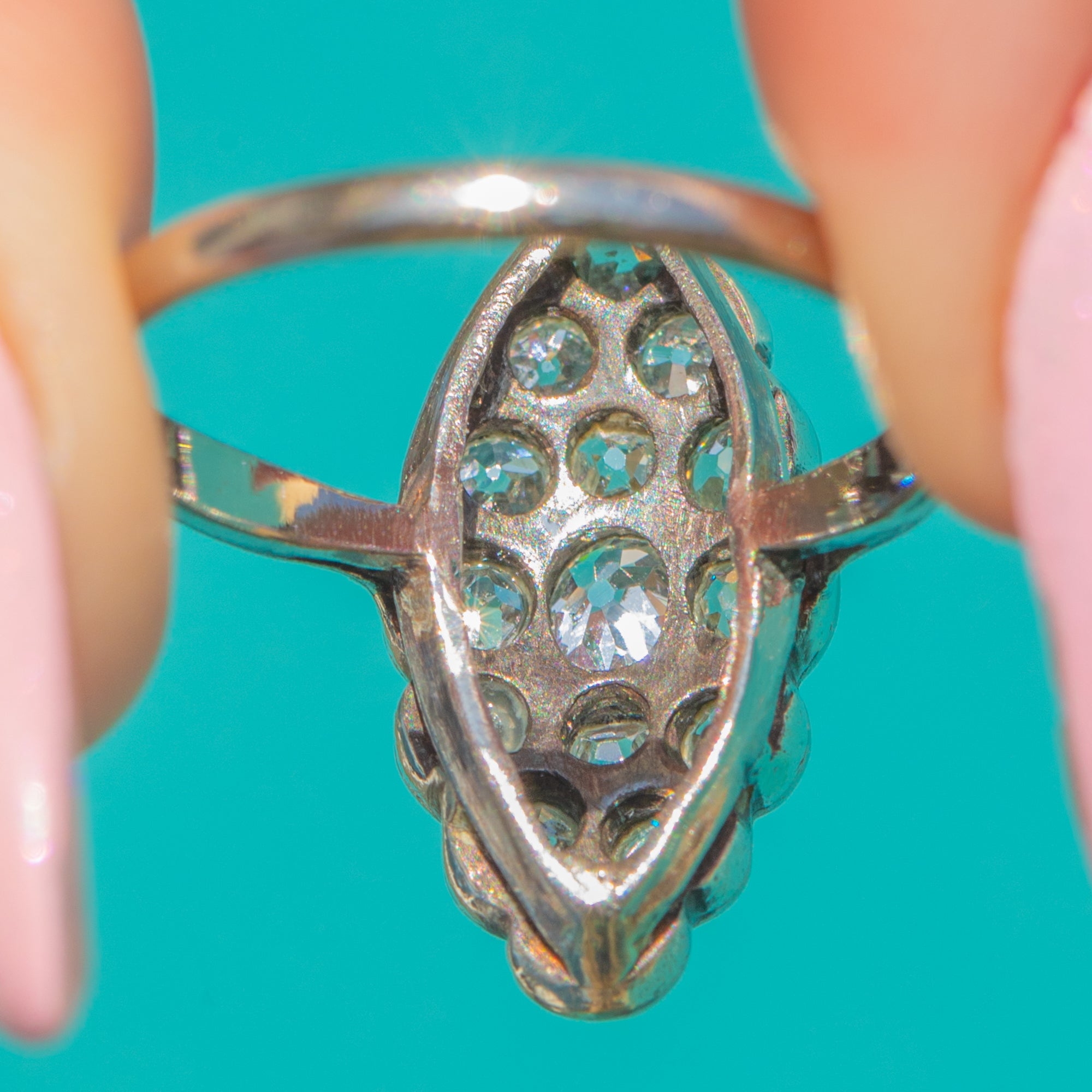 Elegantly elongated and beautifully ornate, this Late Victorian / Edwardian navette cluster ring showcases a constellation of Old Cut Diamonds set in luminous 18ct White Gold. The marquise-shaped head is richly detailed with bead and collet-style settings framed by delicate milgrain, creating a refined shimmer that feels both romantic and timeless.
