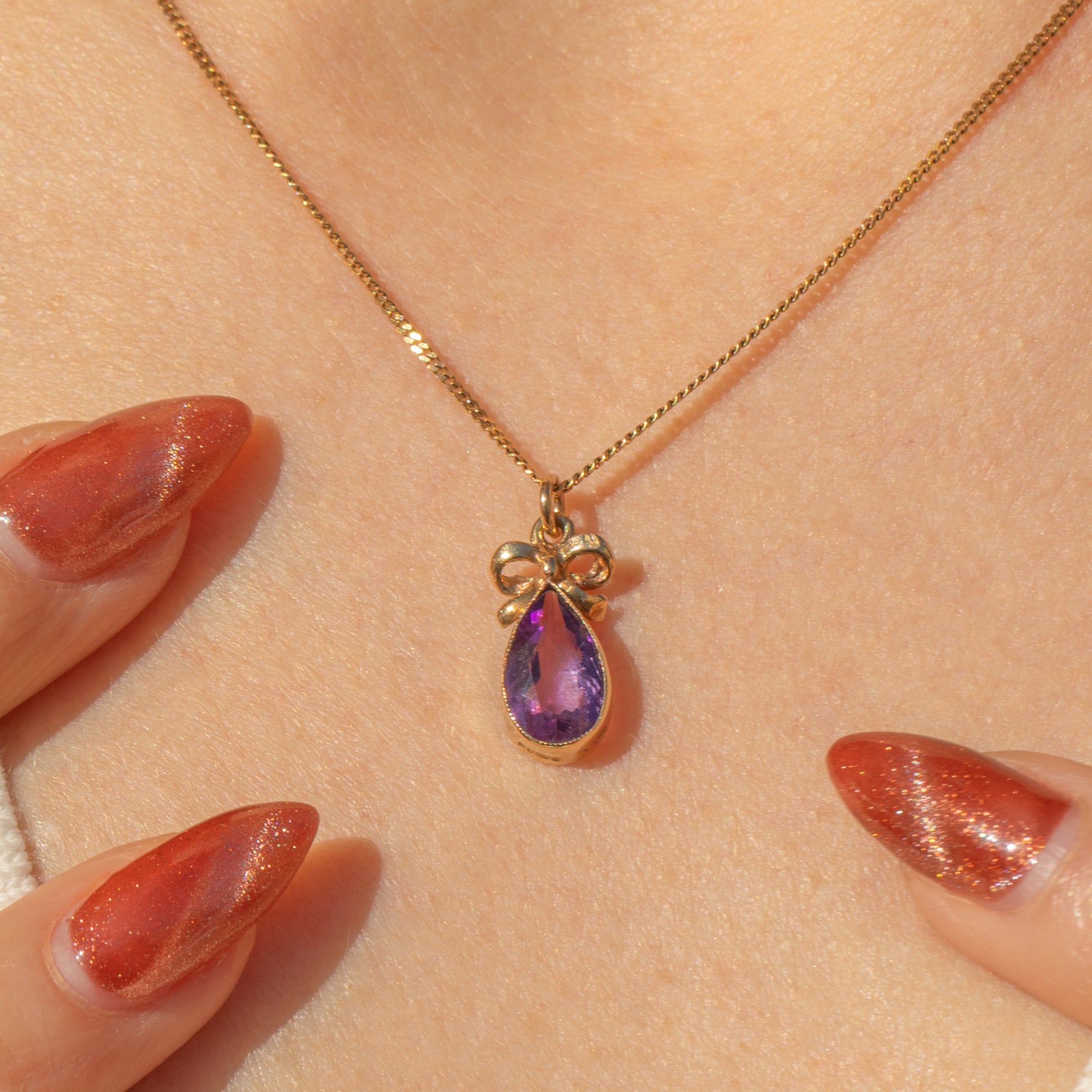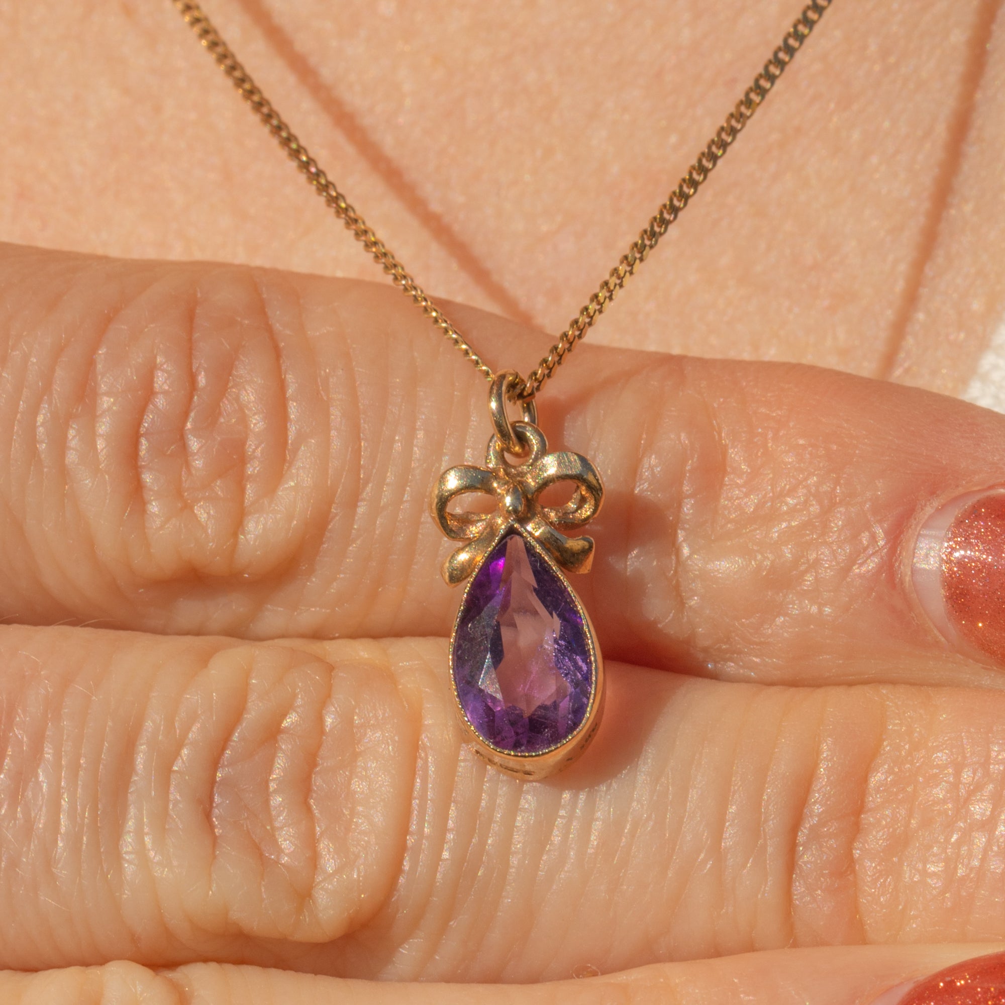 Complete with an adorable 9ct Gold ribbon top and a buttery bezel embracing the circumference of her Amethyst, this Victorian pendant oozes charm from all angles. The perfect dainty size, she will look pretty worn alone suspended from an antique Gold chain across your décolletage!
