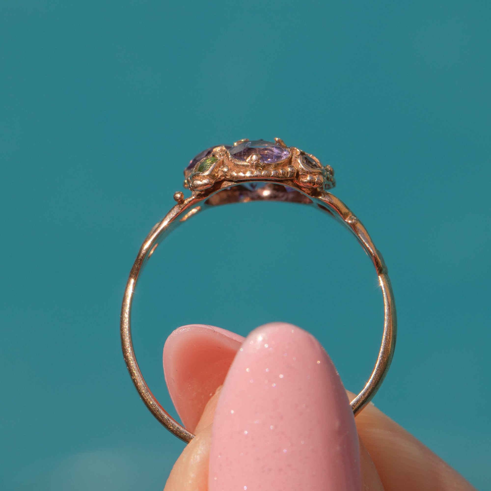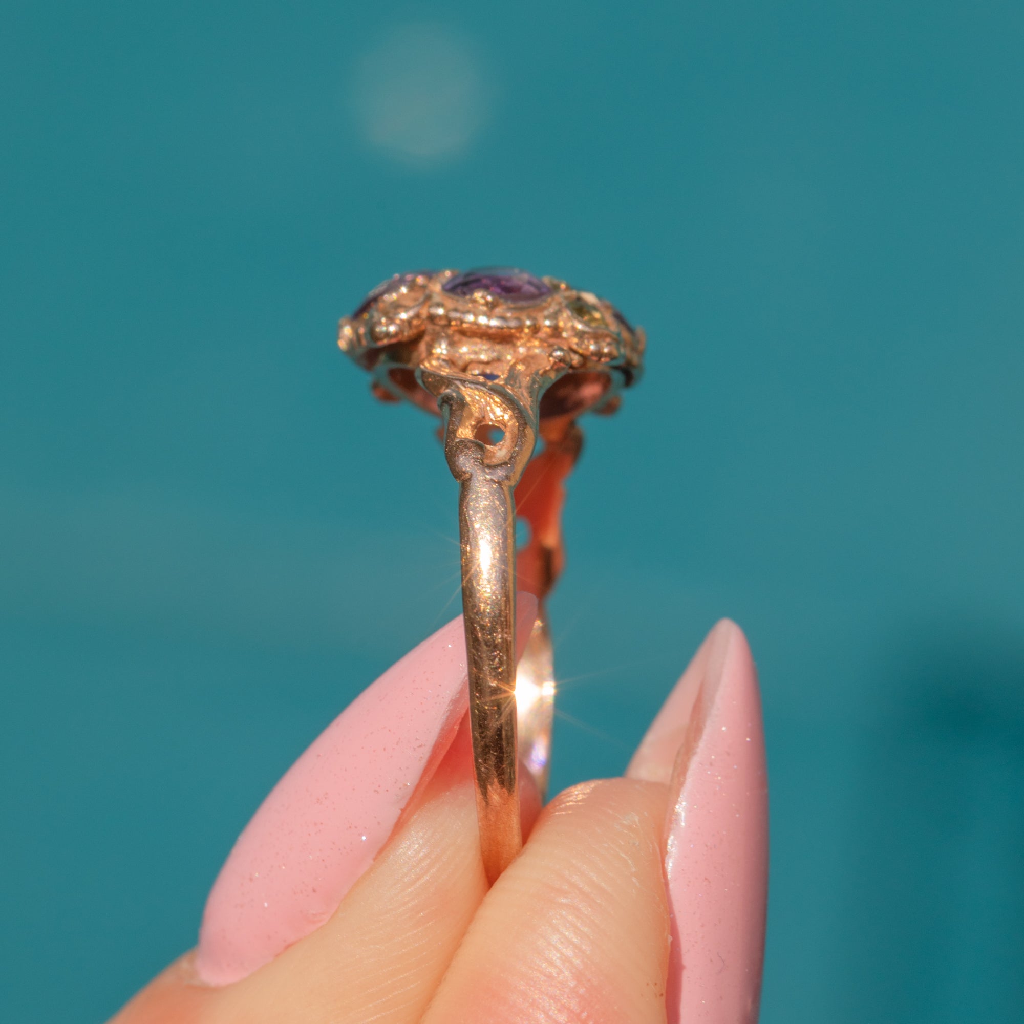 The Amethysts are arranged into a gorgeous flower design and framed by ornately formed swirling shoulders- this enchanting Victorian ring looks as though she's been plucked from a fairytale and exudes old-time charm!