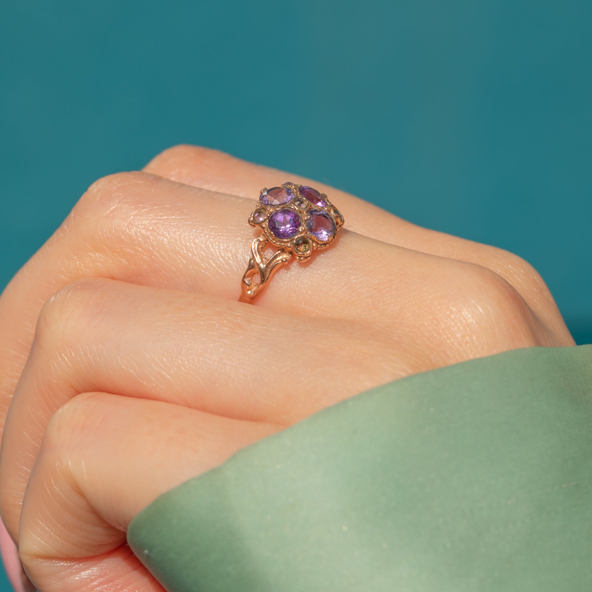 VERY GOOD: This antique 9ct Gold Amethyst cluster ring is in very good condition. The Gold has a lovely rosy hue and the details have all remained defined. There is some gentle wear to the Gold, consistent with age, and light wear to a few of the smaller Amethyst accents. The stones remain securely set, and the overall structure is beautifully preserved. She's a delight!