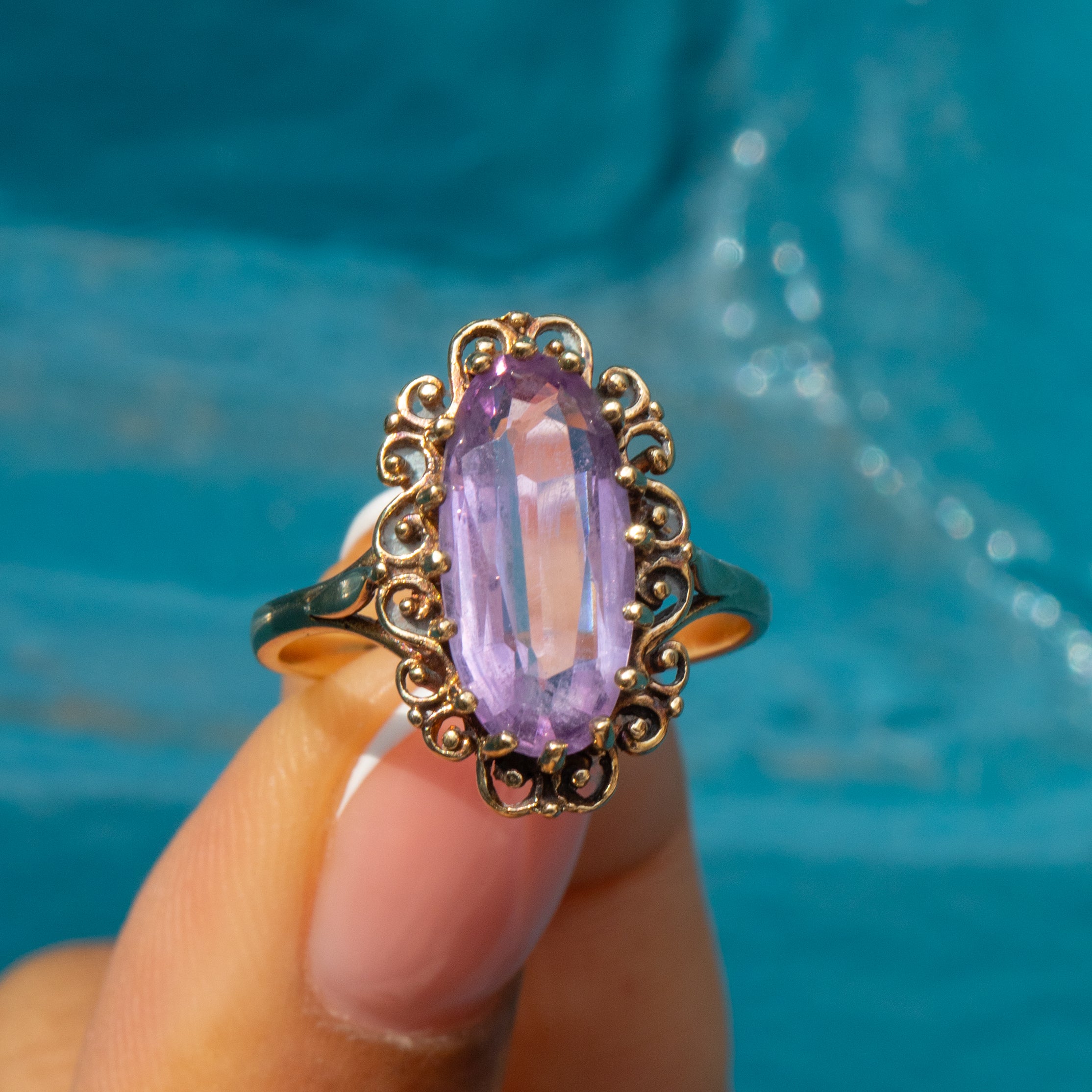 This antique 9ct Gold Amethyst cocktail ring is superb! Crafted from solid 9ct Gold, this ring has a lovely crown-like gallery displaying a 1.08ct lilac Amethyst poised atop.