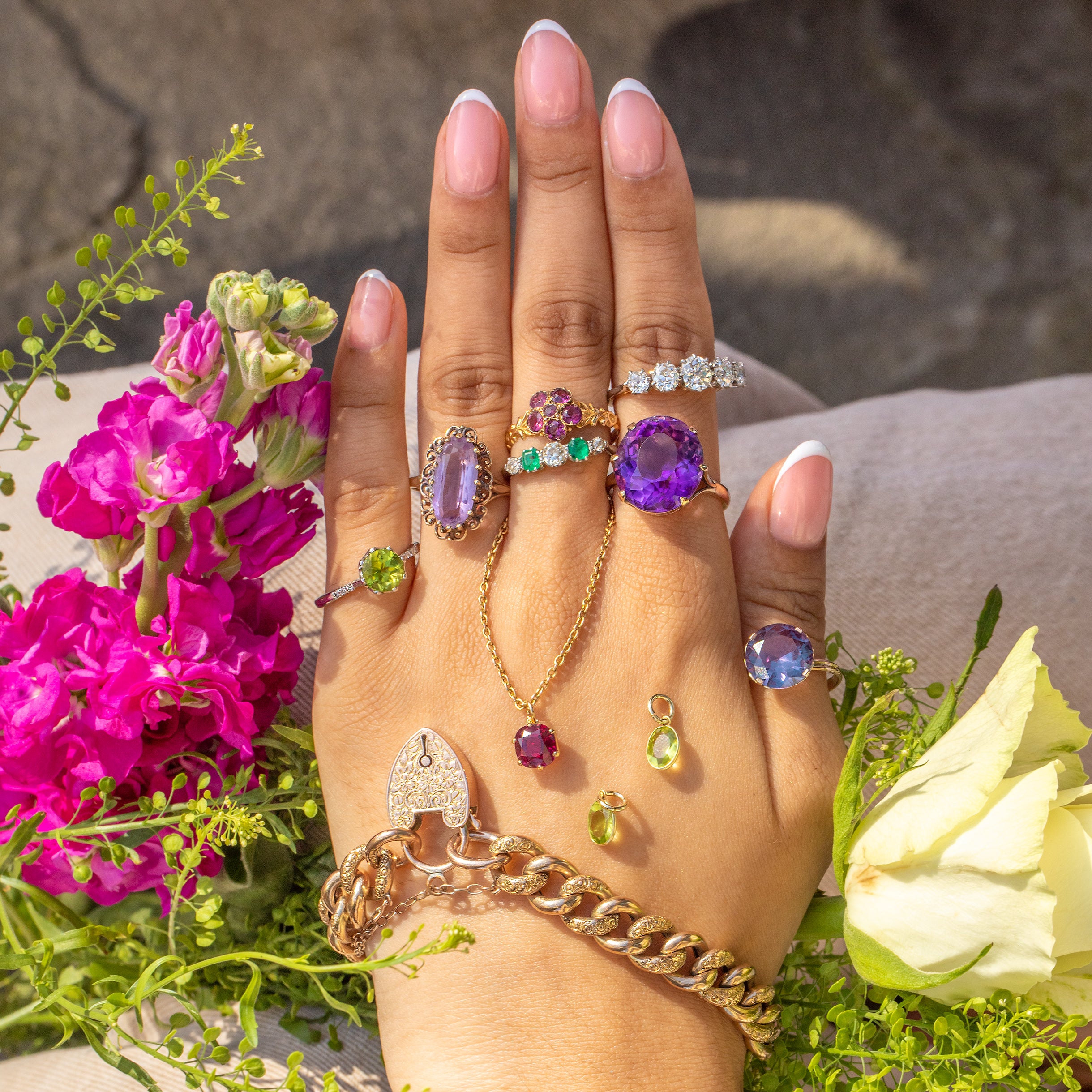 This Art Deco Amethyst ring is a truly show-stopping piece, with its uniquely formed border and pretty granulated details held up by a high profile allowing the light to stream through the periwinkle facets.